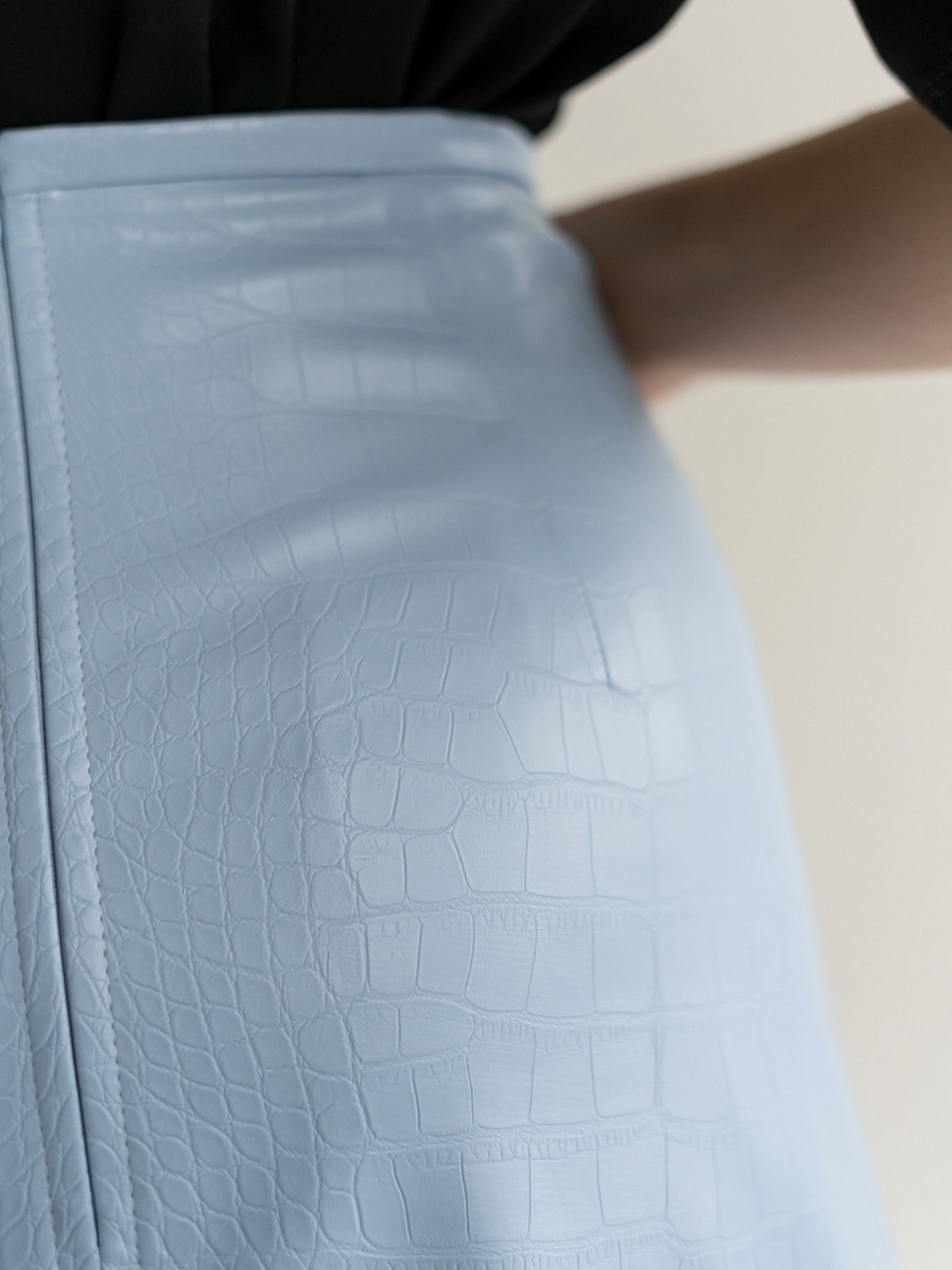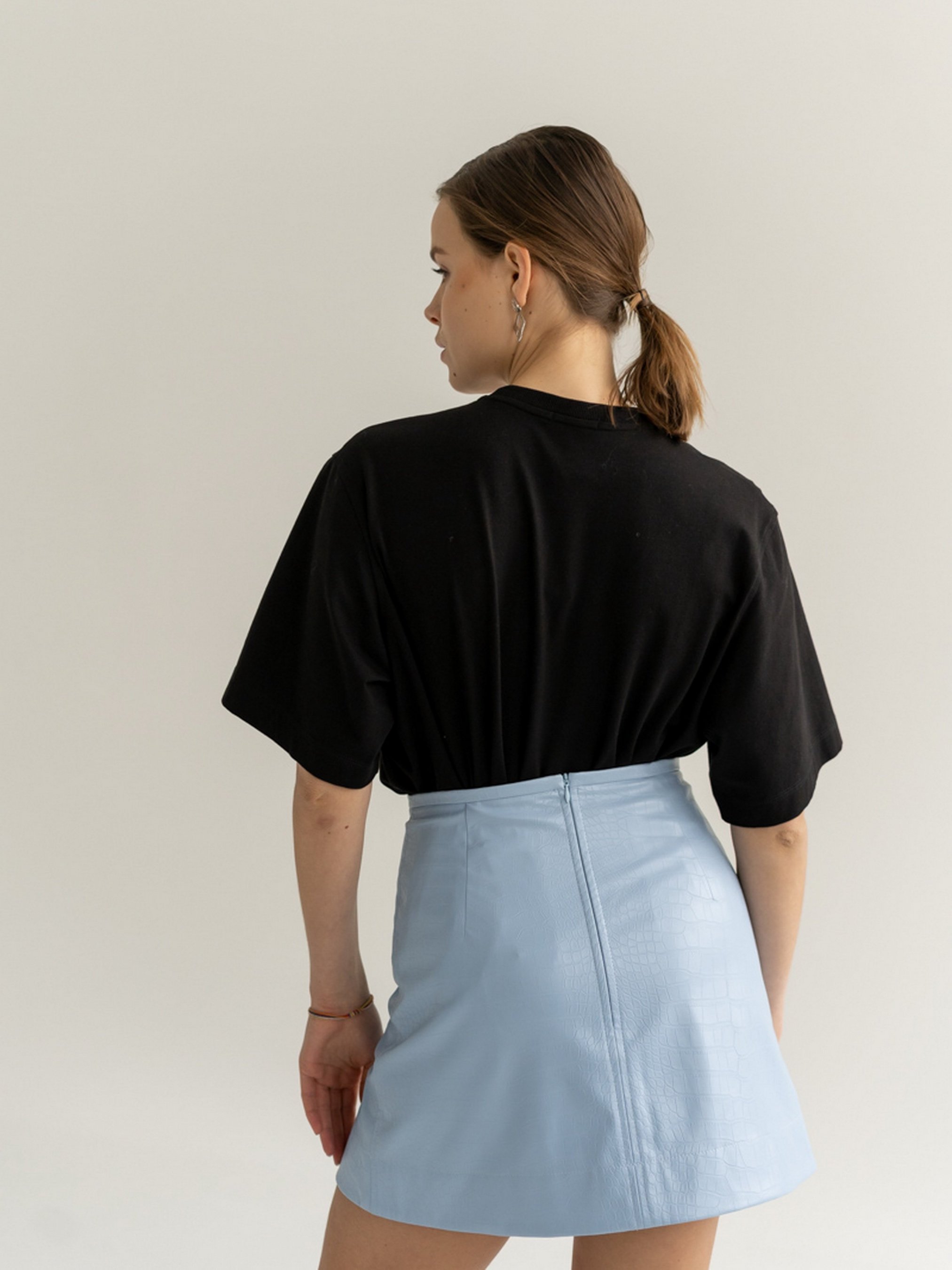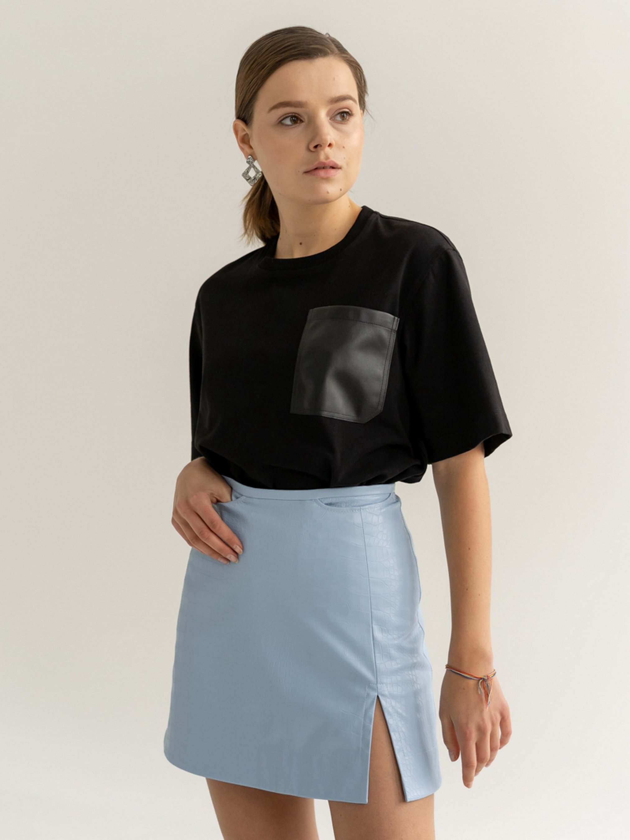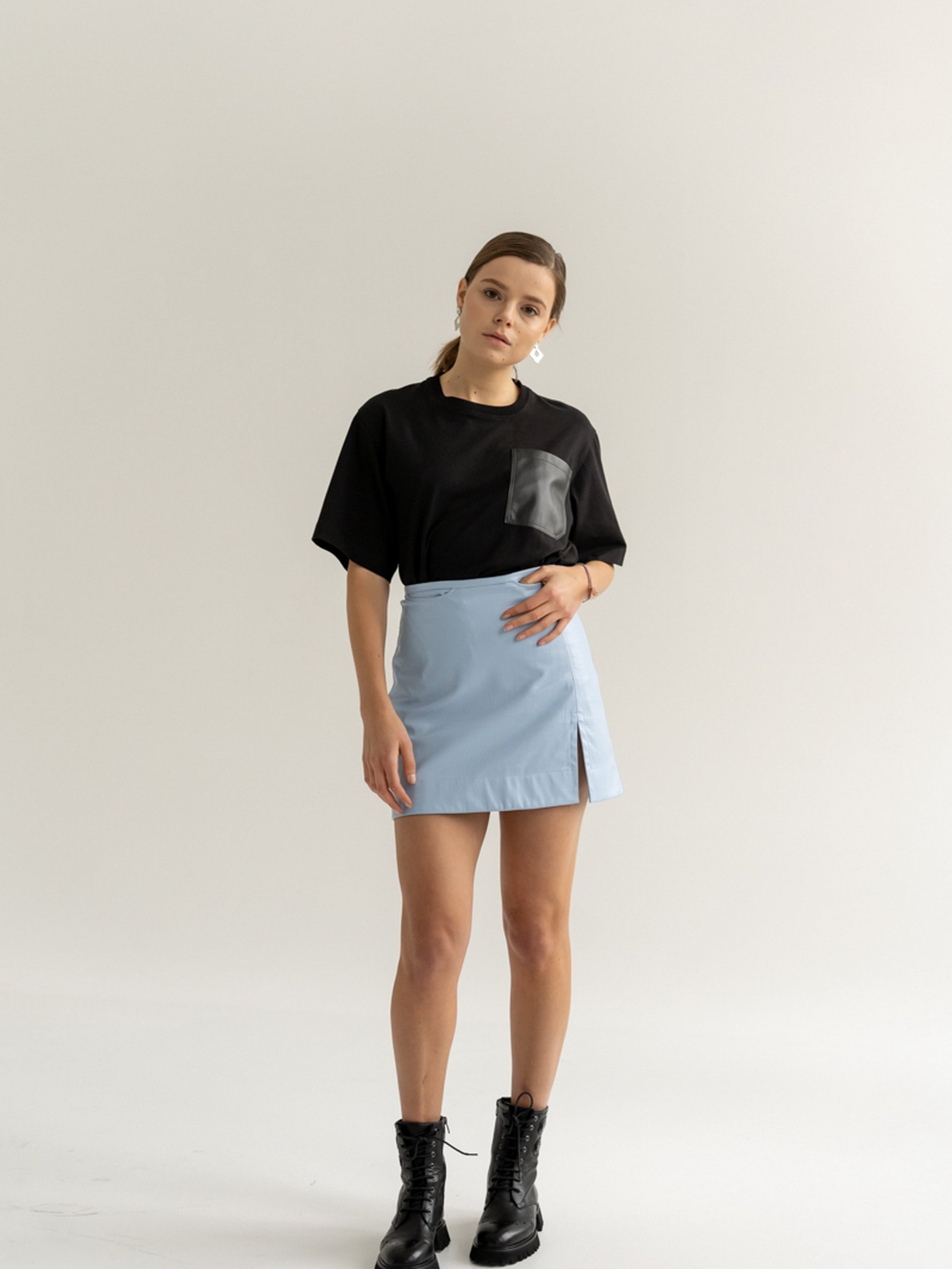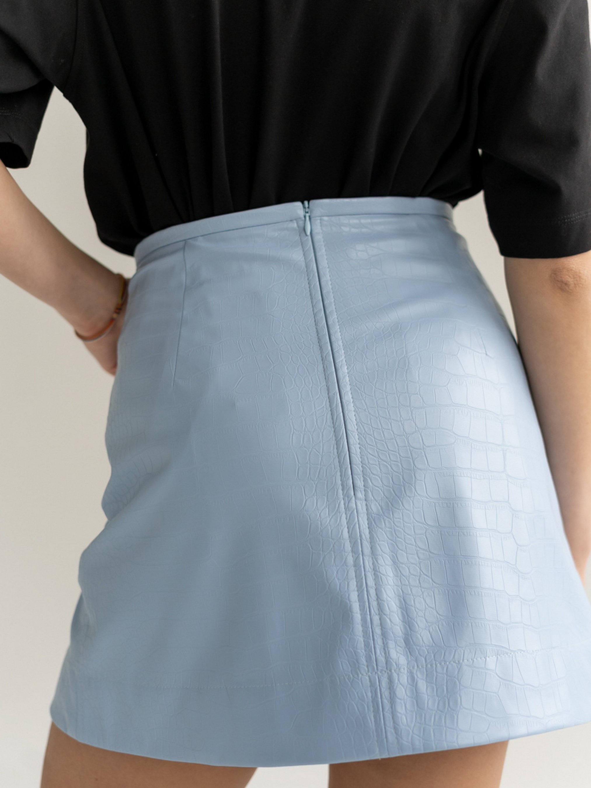 Спідниця міні трапеція, виготовлена з еко-шкіри з тисненням. Висока посадка. Дві внутрішні кишені, застібка на замок ззаду. Попереду по лівій нозі розріз.