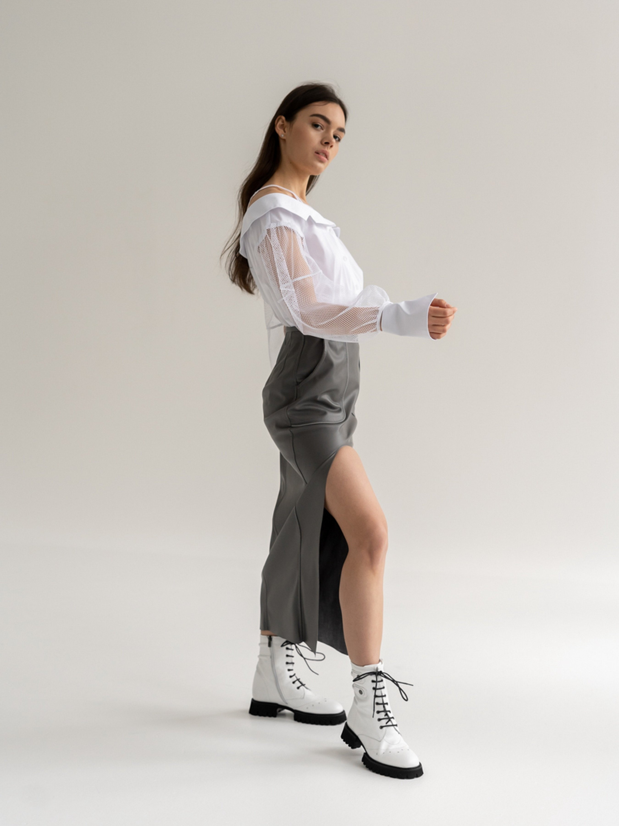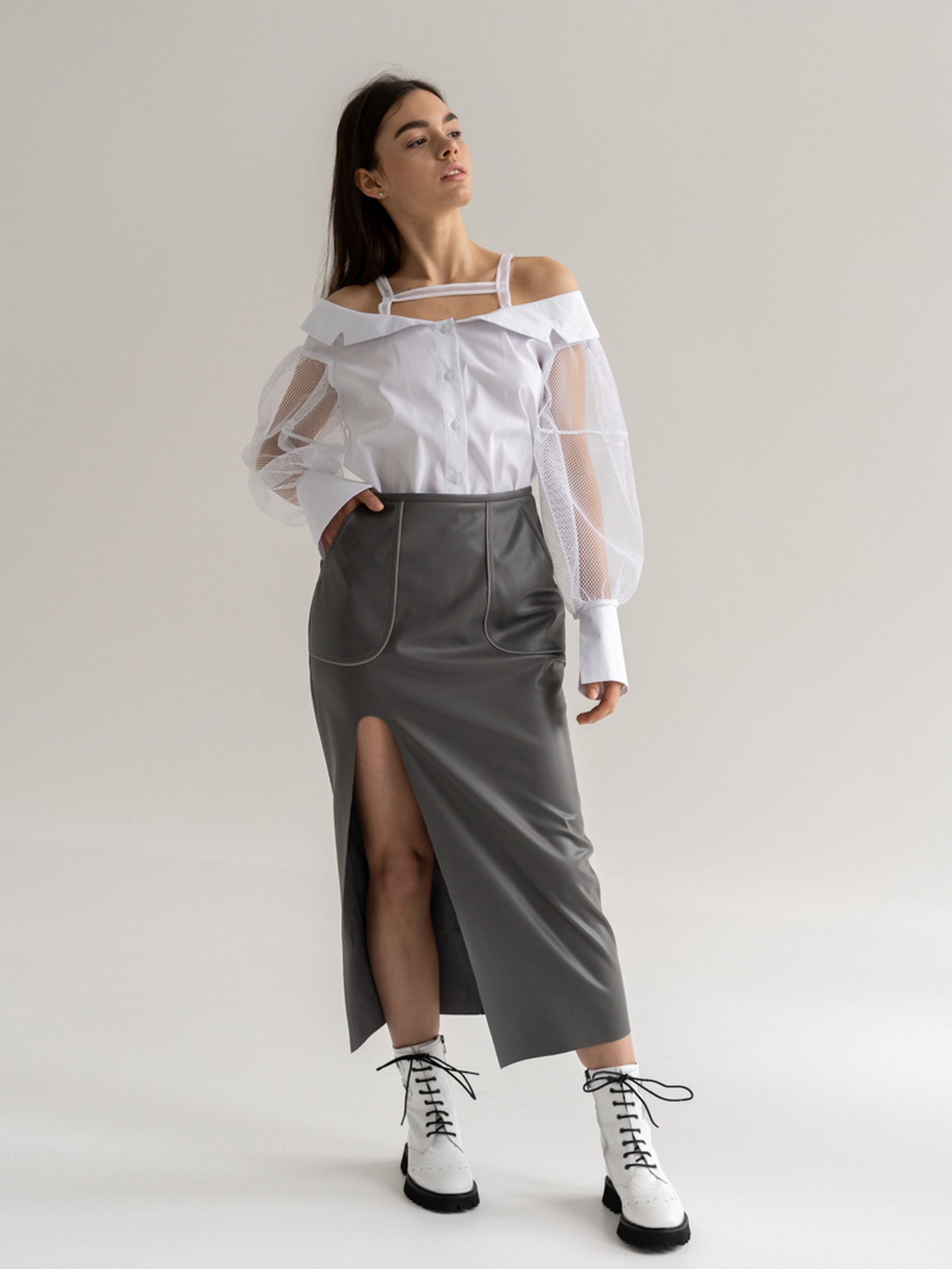 Спідниця облягаючого силуету завужена до низу виконана з экошкіри. Накладні кишені, замок ззаду. Параметри виробу: Довжина по спинці 87 см Висота розрізу 54 см Зріст моделі 174 см, на моделі надітий розмір S. Сезон: Весна/Літо/Осінь Склад: 50% Полієстер 50% Поліуретан Машинне прання 40 градусів (обов'язково вивернути виріб навиворіт). Віджим – 600-800 про. Не використовувати режим сушіння у пральній машинці. Не використовувати хлорні відбілювачі і засоби для виведення плям. Глажка виробу – середня температура, СТРОГО з виворітного боку.