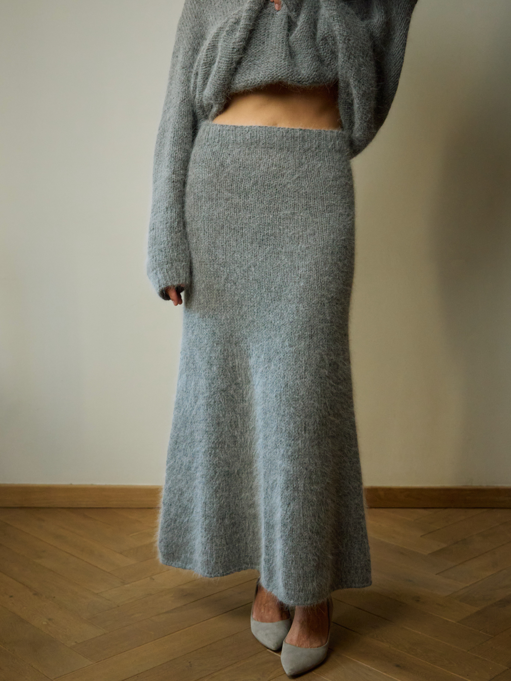 Преміальна спідниця А-силуетного крою з м’якої суміші ангори та нейлону ручної в'язки. Довга спідниця з м’якої суміші ангори та нейлону для комфортного та стильного образу. Модель А-силуету з широким еластичним поясом на резинці, що забезпечує зручну посадку. Лаконічний дизайн підкреслює елегантність і мінімалізм виробу. • Довжина: 100 см • Силует: А-силует • Пояс: на резинці • Колір: сірий • Матеріал: 50% ангора, 50% нейлон • Ручна робота, зроблено в Україні