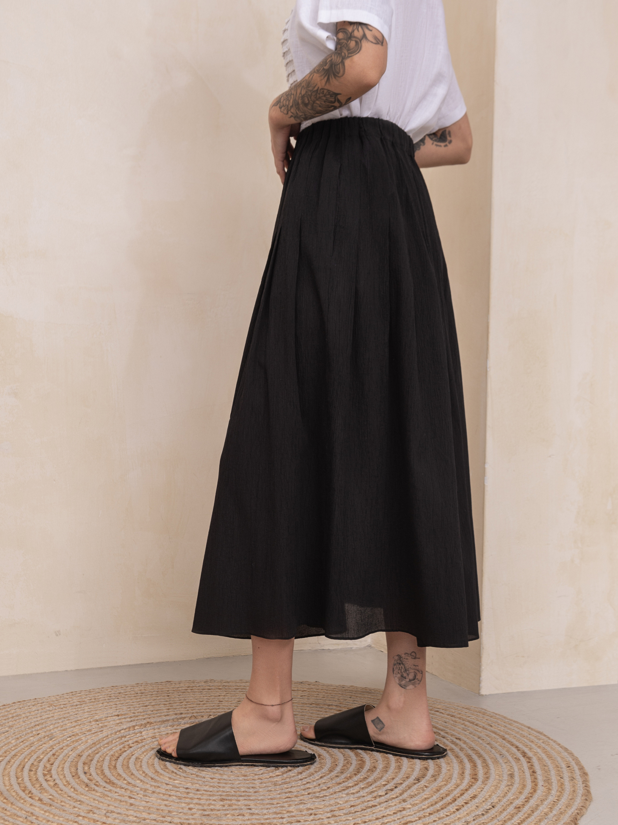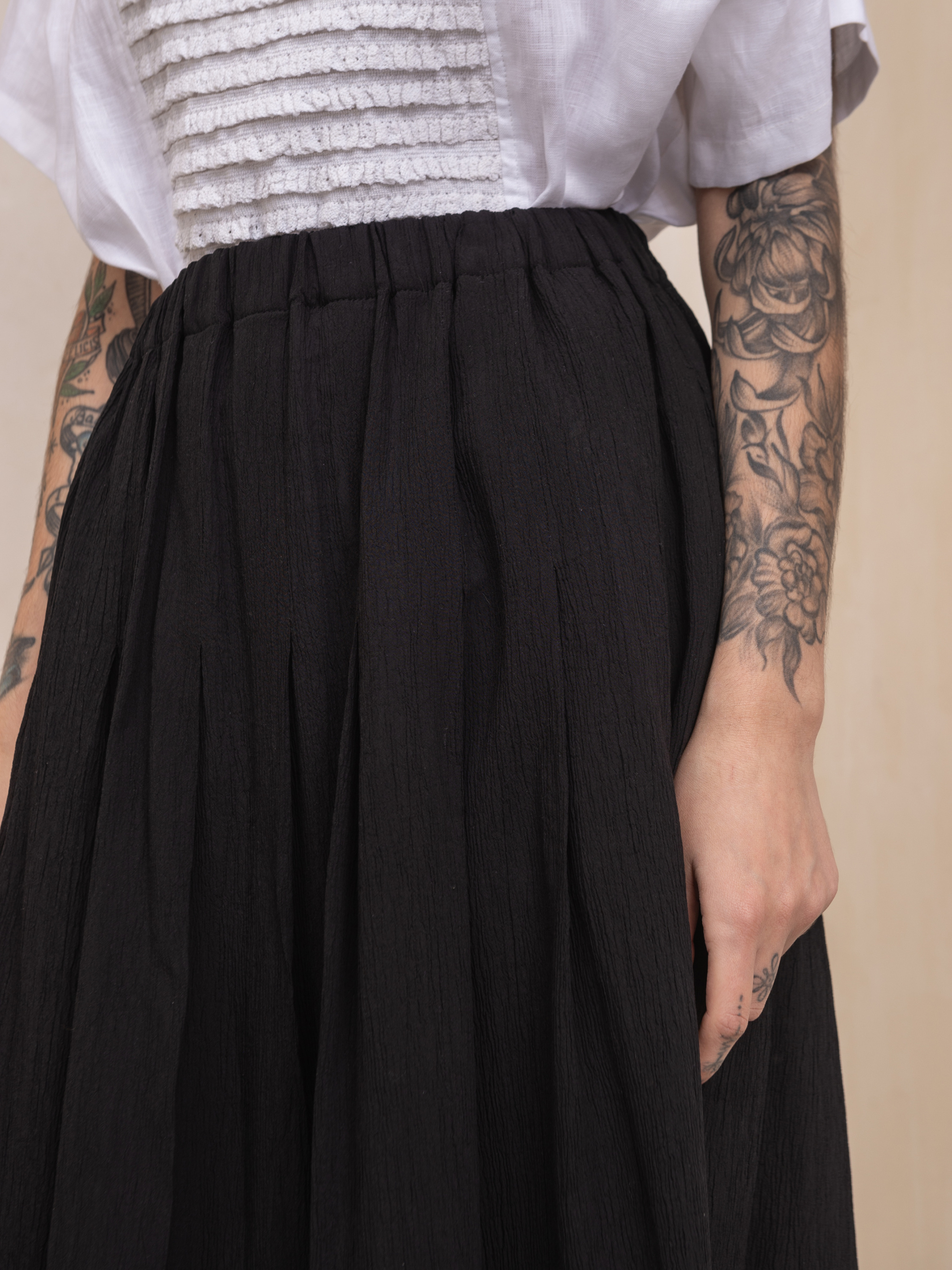 Ця чорна максі-спідниця Matteau виготовлена з органічних тканин з жатою обробкою і призбореною еластичною талією, що спадає до А-силуету на подолі. Завищена талія, бокові кишені, об'ємний силует. Деталізована застроченими від талії складками. Віскоза 65%, бавовна 35% НК 1 (XS-S-M): Талія 64cm, Талія розтягнута 90cм, Стегна 115cm, Довжина 88cм НК 2 (L-XL-XXL): Талія 70cm, Талія розтягнута 105cm, Стегна 128cm, Довжина 88cm
