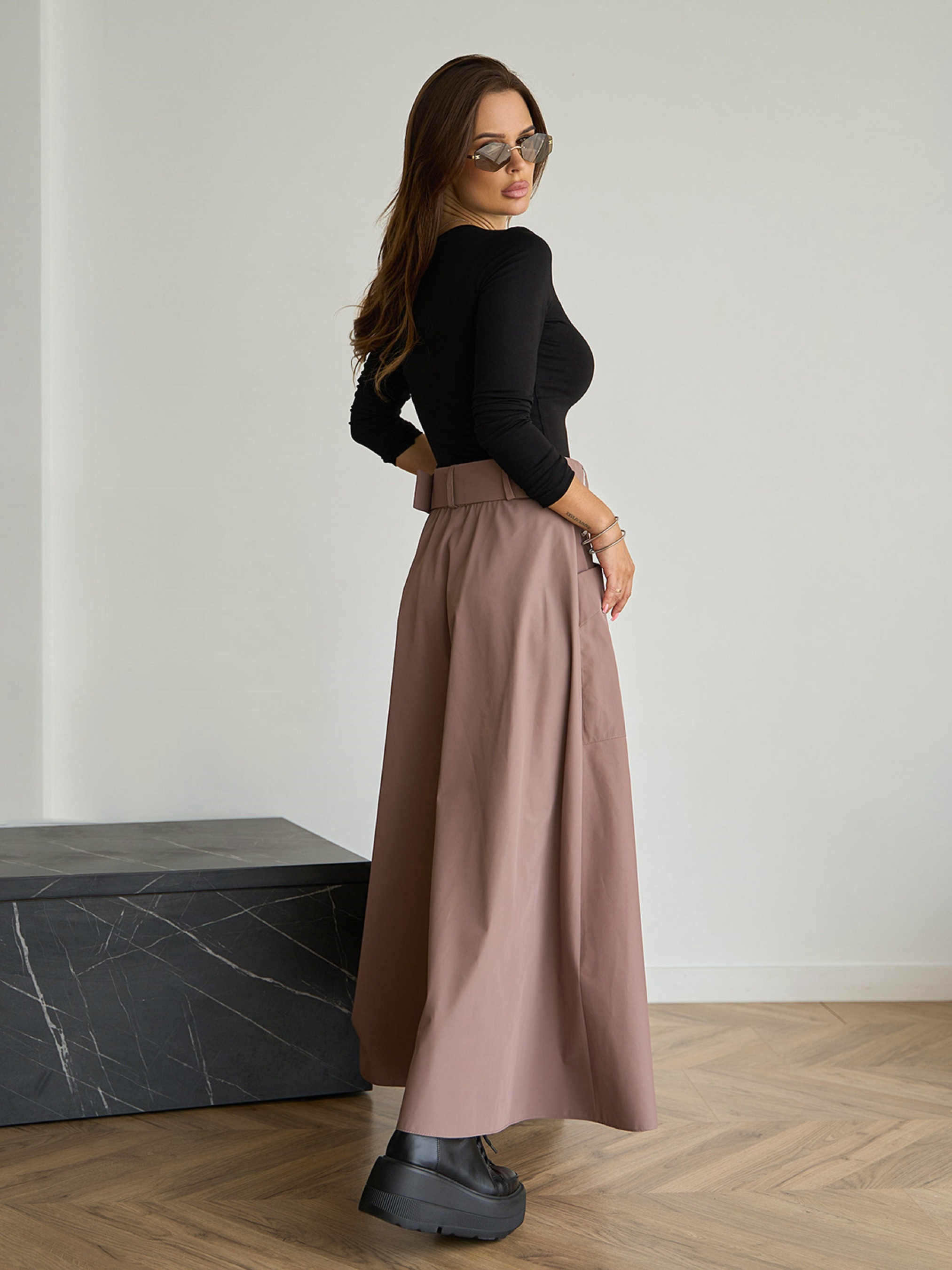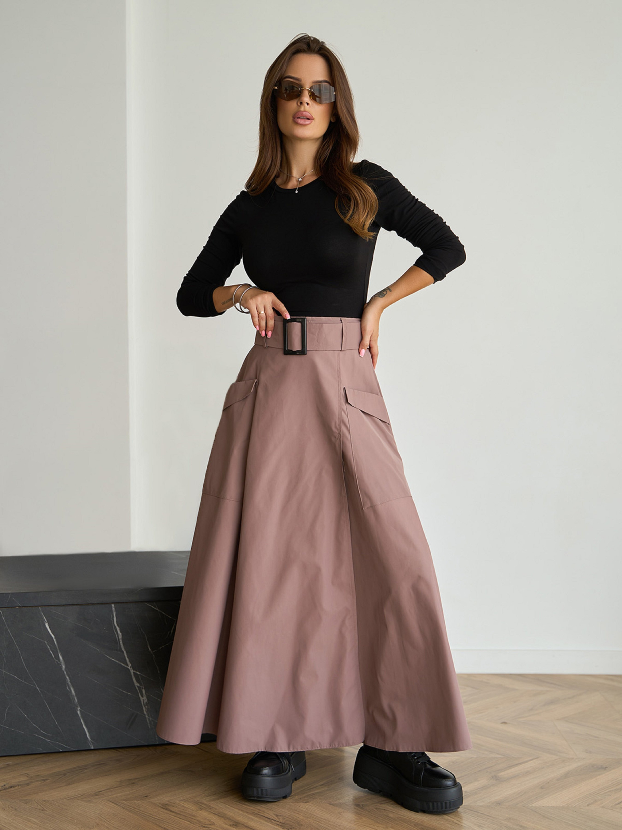 Коричнева довга спідниця з плащової тканини з поясною гумкою ззаду і бічною блискавкою. Модель оснащена місткими кишенями із клапанами. Спідниця розкльошеного крою із запахом та розрізом спереду. Модель комплектується знімним поясом. Напівобхват: Талія: S (34), M (36), L (38), XL (40), Стегна: S (68), M (70), L (72), XL (74), Довжина виробу - 95 , Тканина: Низька еластичність.