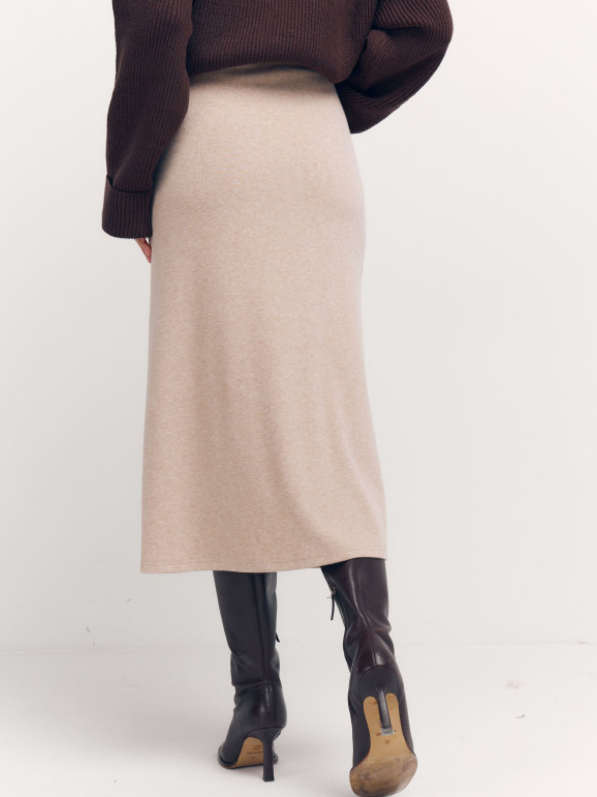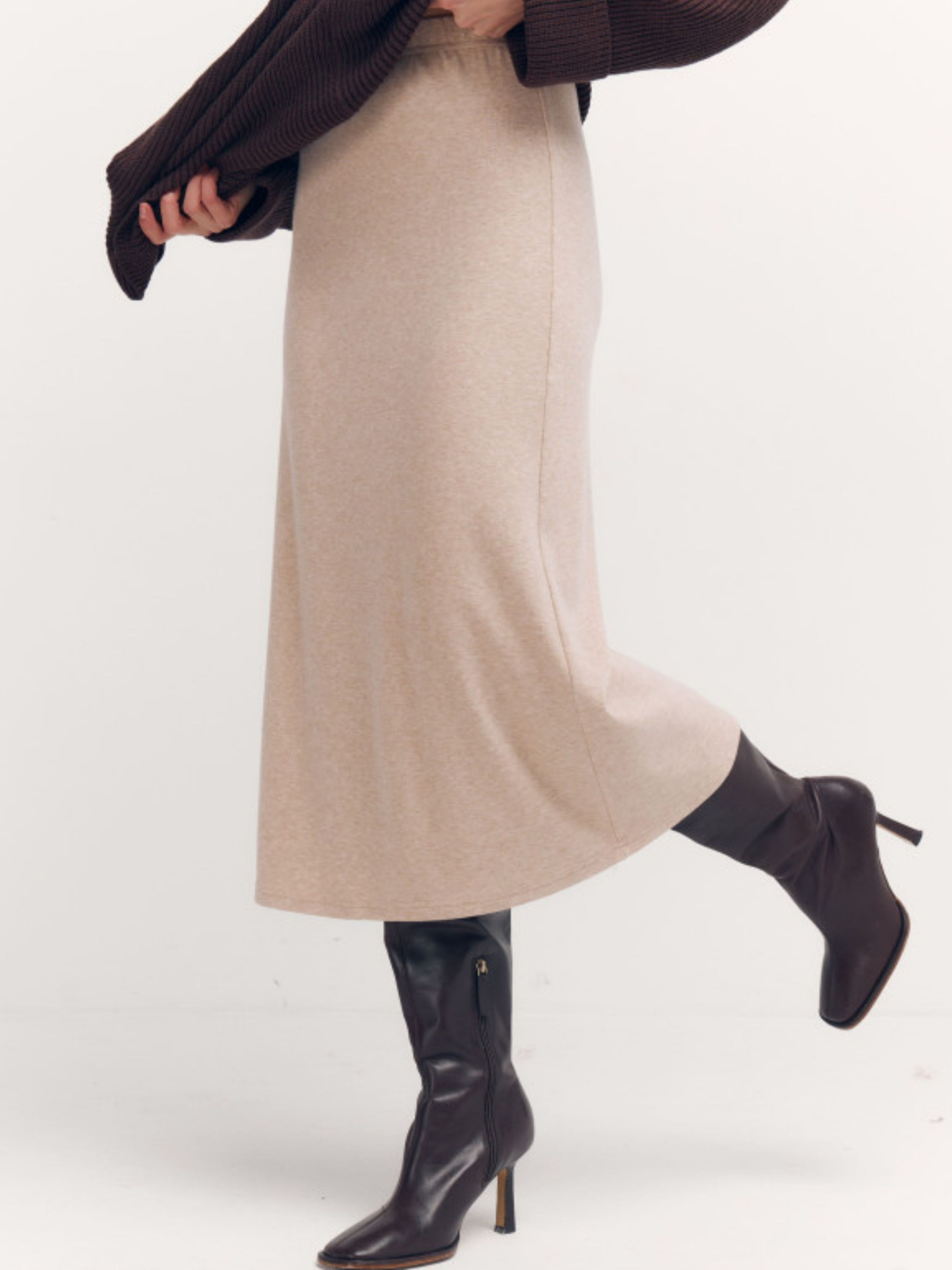 Трикотажна спідниця Midnight Flow Midnight Flow – це спідниця, яка говорить пошепки, але звучить упевнено. Глибокий чорний колір підкреслює чистоту силуету, а м'який в'язаний трикотаж ніжно повторює лінії тіла, створюючи відчуття абсолютного комфорту. Модель має лаконічний крій без зайвих деталей – саме тому вона виглядає дорого та поза часом. Еластичний пояс забезпечує ідеальну посадку, а довжина міді робить образ стримано жіночним та універсальним – для міста, офісу чи вечірніх прогулянок. Midnight Flow легко стилізується з об'ємними светрами, тонкими лонгслів або жакетами. Це та спідниця, яка стає базою гардеробу і щоразу виглядає по-новому.