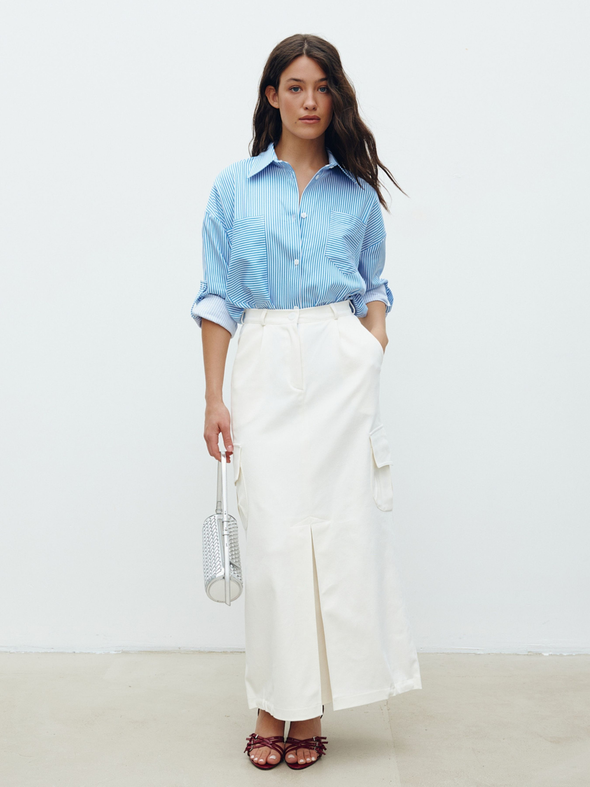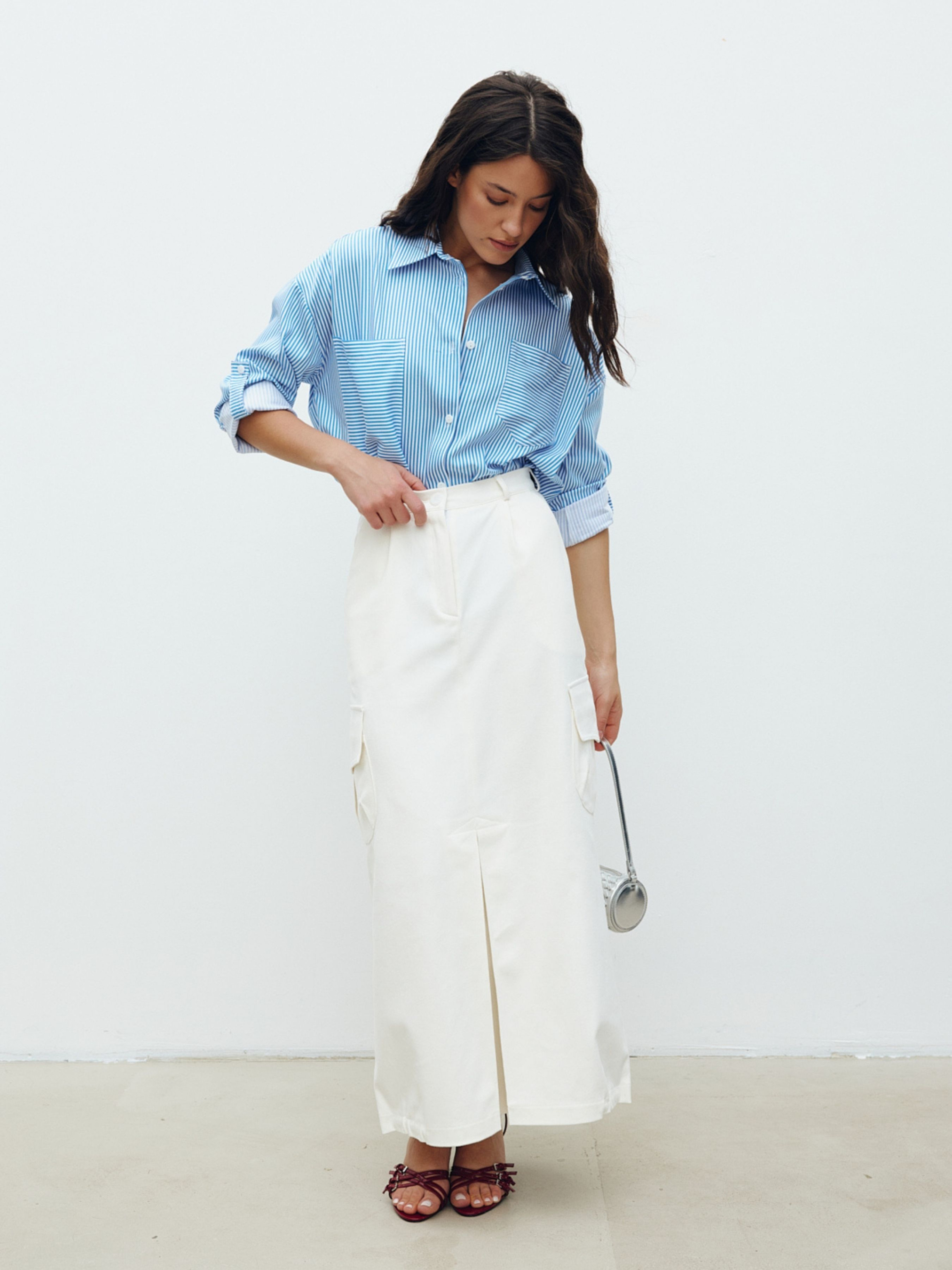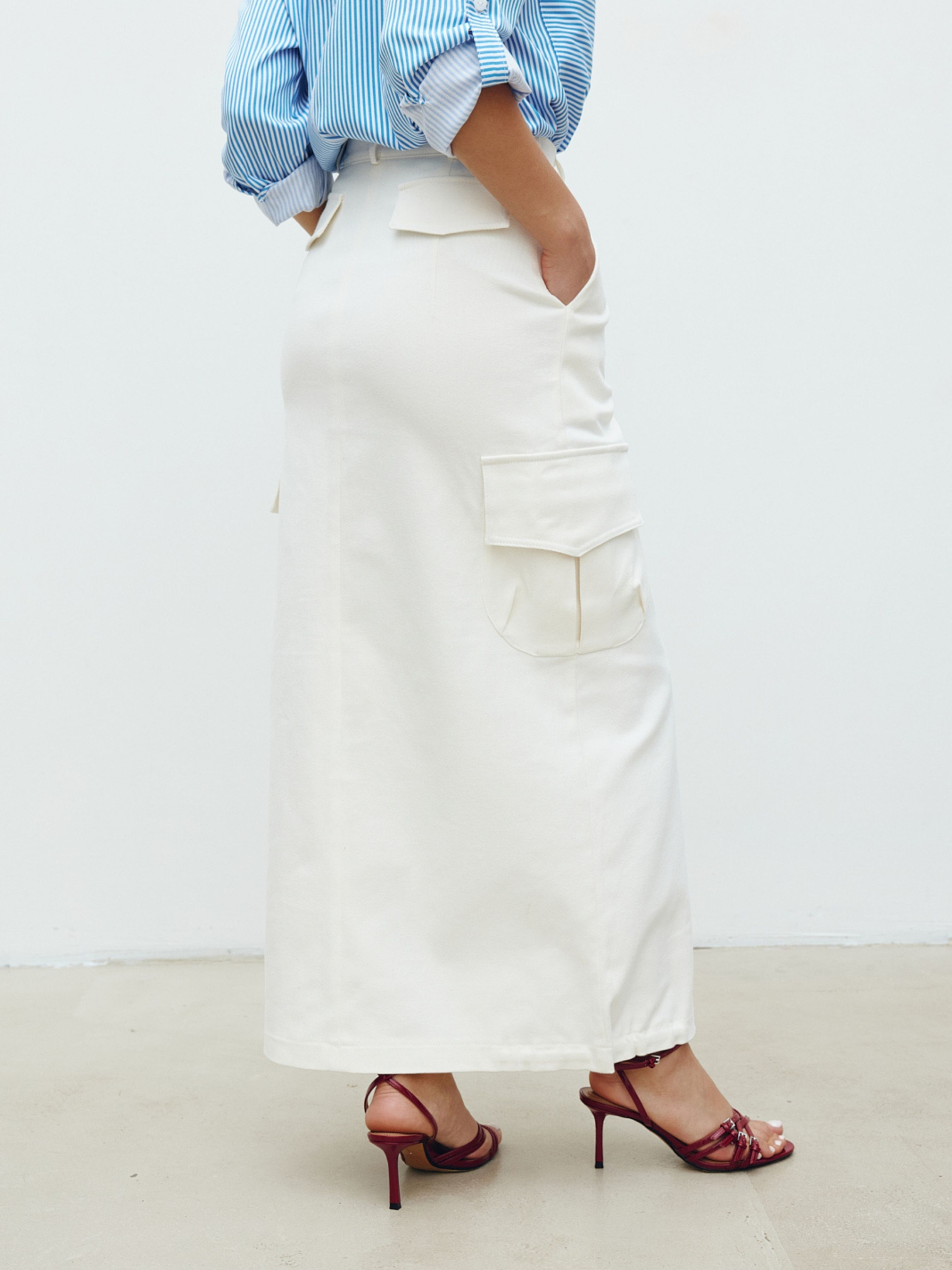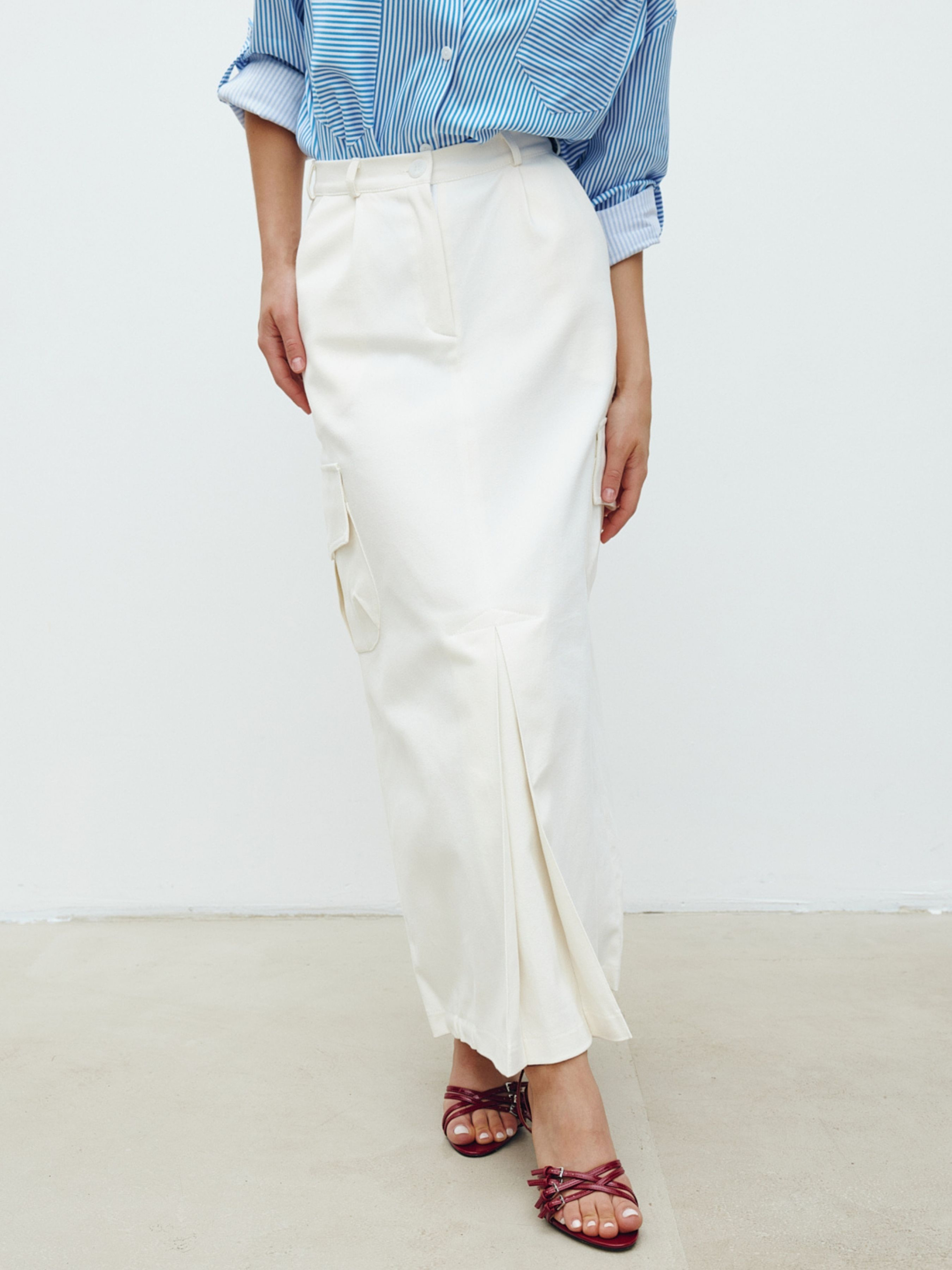 Молочна спідниця-карго із защипами із щільної джинсової тканини з додаванням котону. Прямий силует у довжині максі. Має середню посадку. Лінію талії доповнено шлевками для використання додаткових аксесуарів. Застібка на гудзик та блискавку. Стилізована акцентними кишенями з клапаном з боків, у верхній частині – прорізними. Позаду клапани-обманки. Наявність конструктивного елемента у вигляді зустрічної склади надає оригінальності моделі. Поділ спідниці підхоплений прихованою лаштункою, яку за бажанням можна регулювати. Склад: бавовна 97%, еластан 3%.