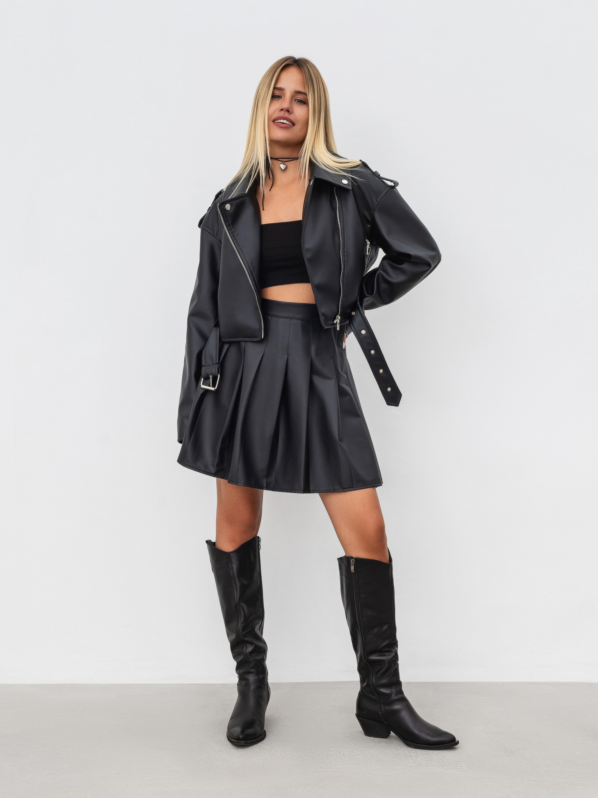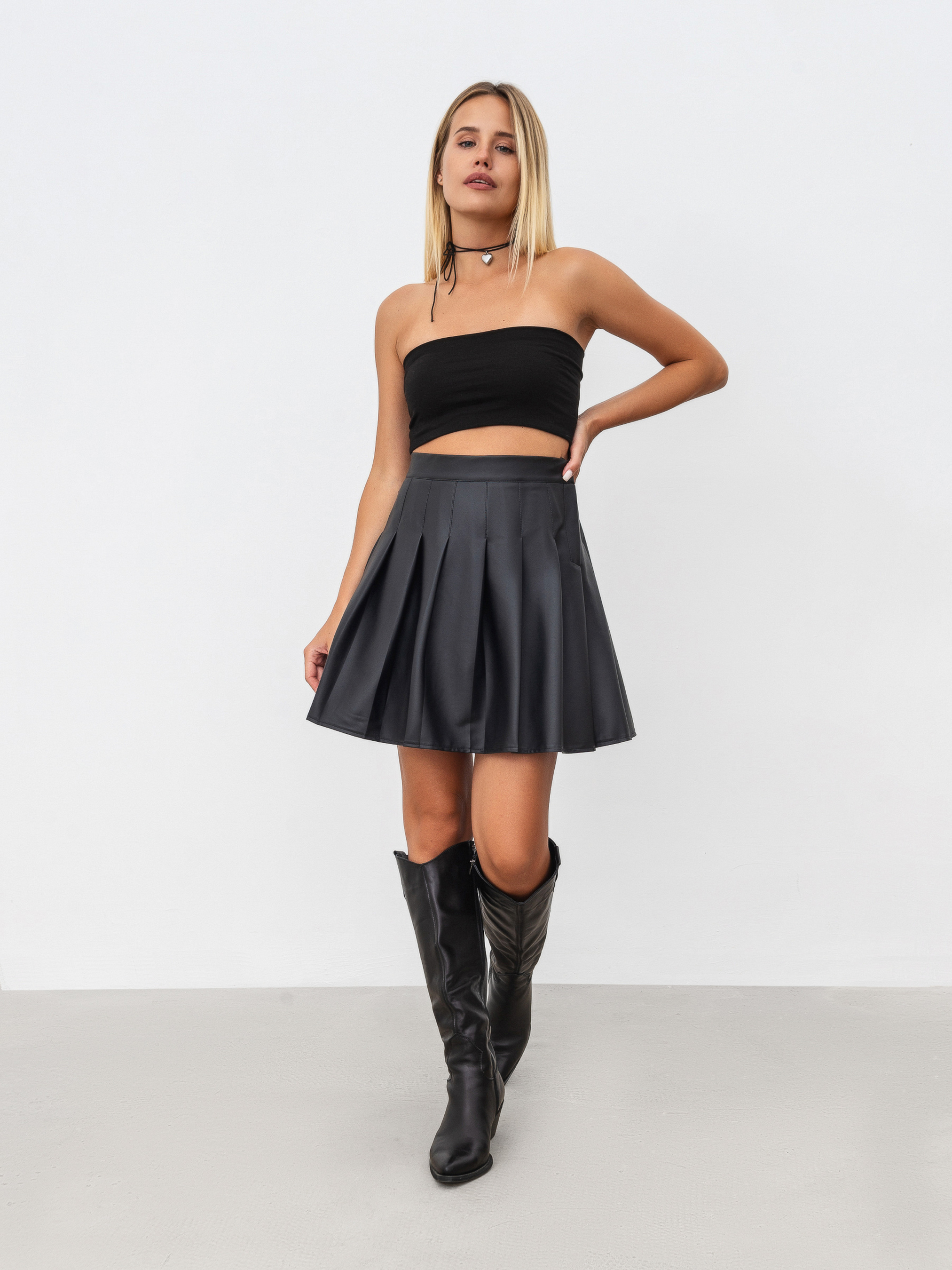 Спідниця зі складками із матової шкіри. Резинка ззаду добре фіксує спідницю на талії. Модель оформлена зі складками та вільним низом. Легкий та романтичний варіант для прогулянок чи побачень. З нею можна носити будь-які елементи гардеробу: светри, фуболки, боді, сорочки тощо. Доповнити можна непомітними прикрасами та маленькою сумкою. XS : Довжина по спині : 46 см Напівобхват талії : 29-34 см (максимально) S : Довжина по спині : 46 см Напівобхват талії : 29-35 см (максимально) M : Довжина по спині : 46 см Напівобхват талії : 33-38 см (максимально) L : Довжина по спині : 46 см Напівобхват талії : 34-41 см (максимально)