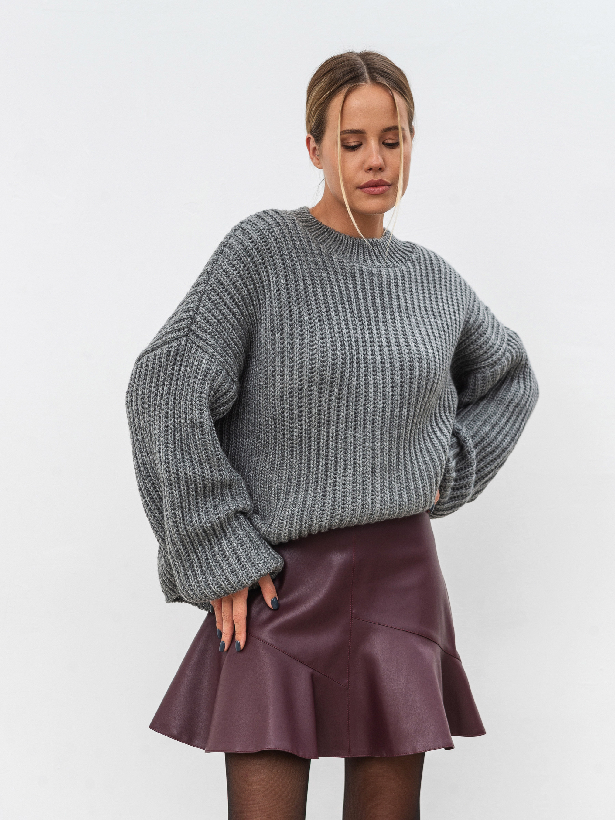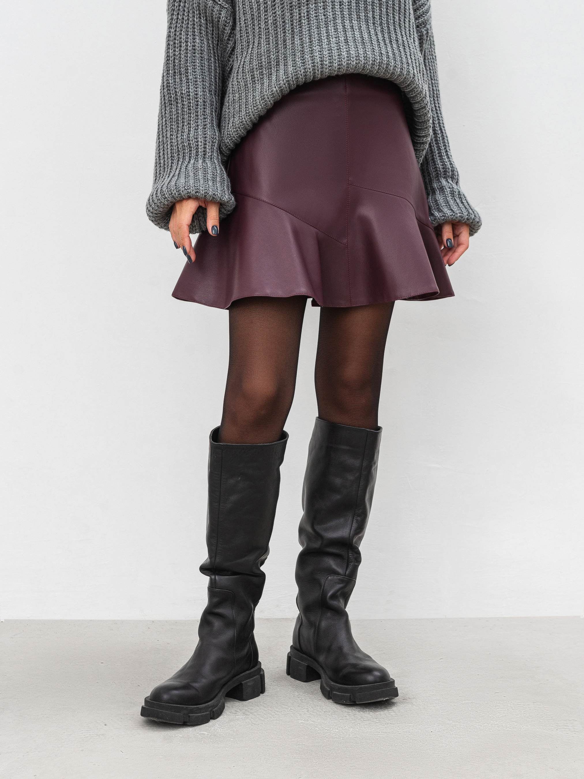 Трендова спідниця міні А-силуету. По низу спідниці є асиметричні волани. Застібається на приховану блискавку. Виготовлена з якісної, приємної на дотик екошкіри. Комбінувати спідничку можна з різним об ємним верхом, створюючи жіночні та цікаві луки. Особливо виграшні поєднання будуть з високими чобітками, светром та пальто стильно, актуально й зручно. ХS Довжина по зовнішньому шву : 41 см Напівобхват стегон : 47 см Напівобхват талії : 30 см S Довжина по зовнішньому шву : 41 см Напівобхват стегон : 48 см Напівобхват талії : 32 см М Довжина по зовнішньому шву : 41 см Напівобхват стегон : 49 см Напівобхват талії : 34 см L Довжина по зовнішньому шву : 42 см Напівобхват стегон : 47 см Напівобхват талії : 36 см ХL Довжина по зовнішньому шву : 42 см Напівобхват стегон : 48 см Напівобхват талії : 37 см