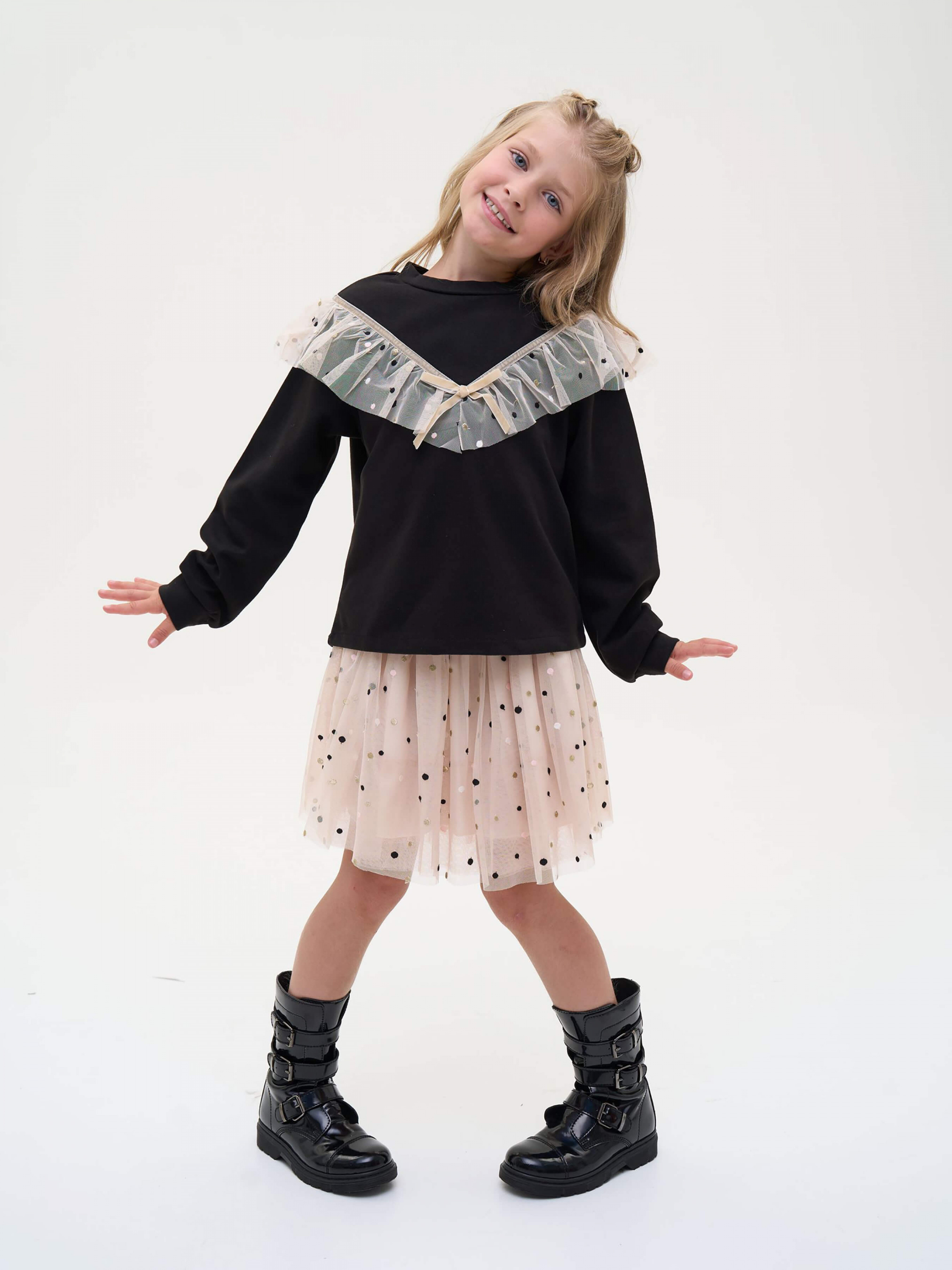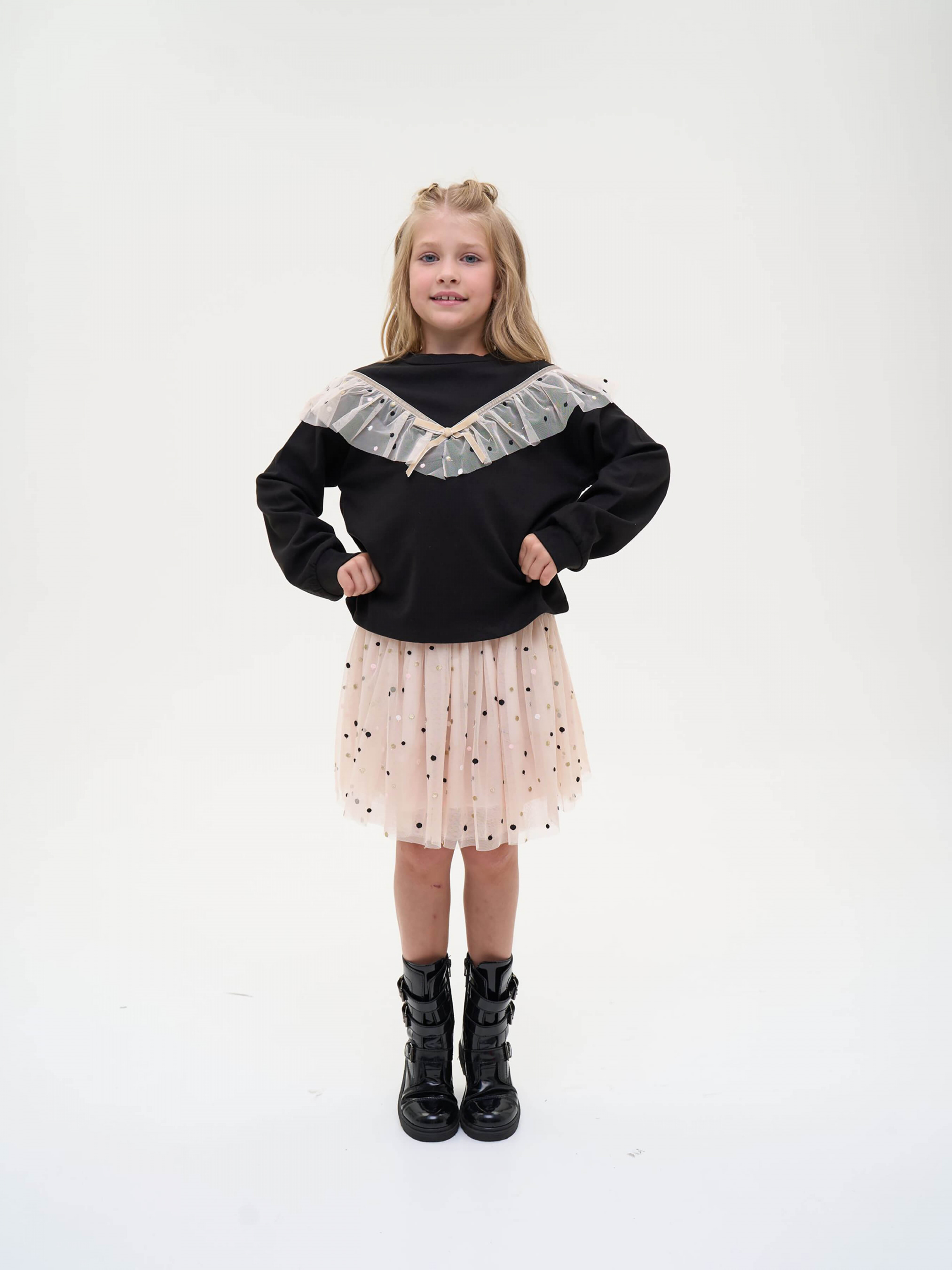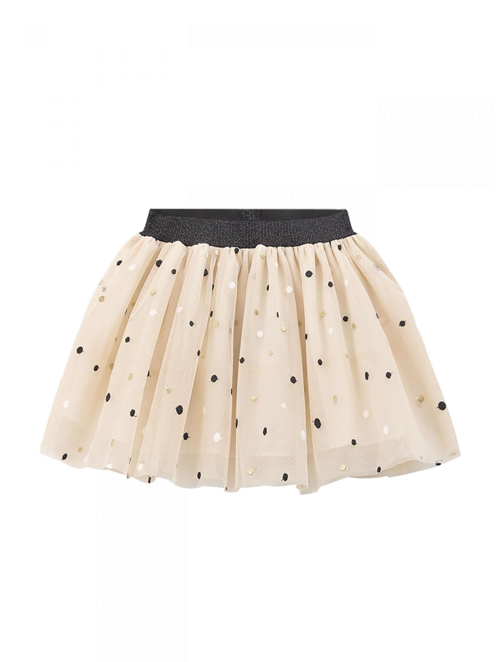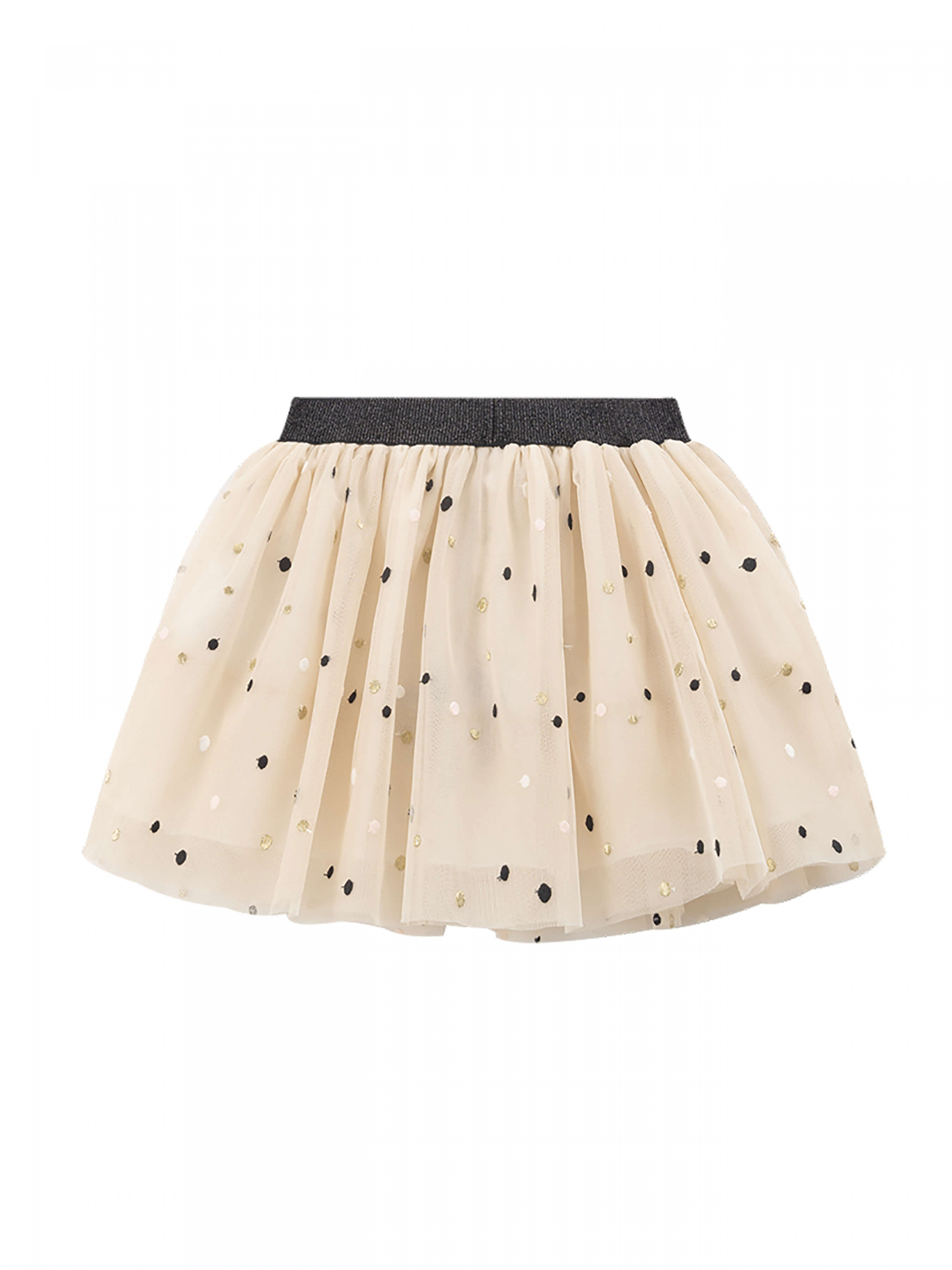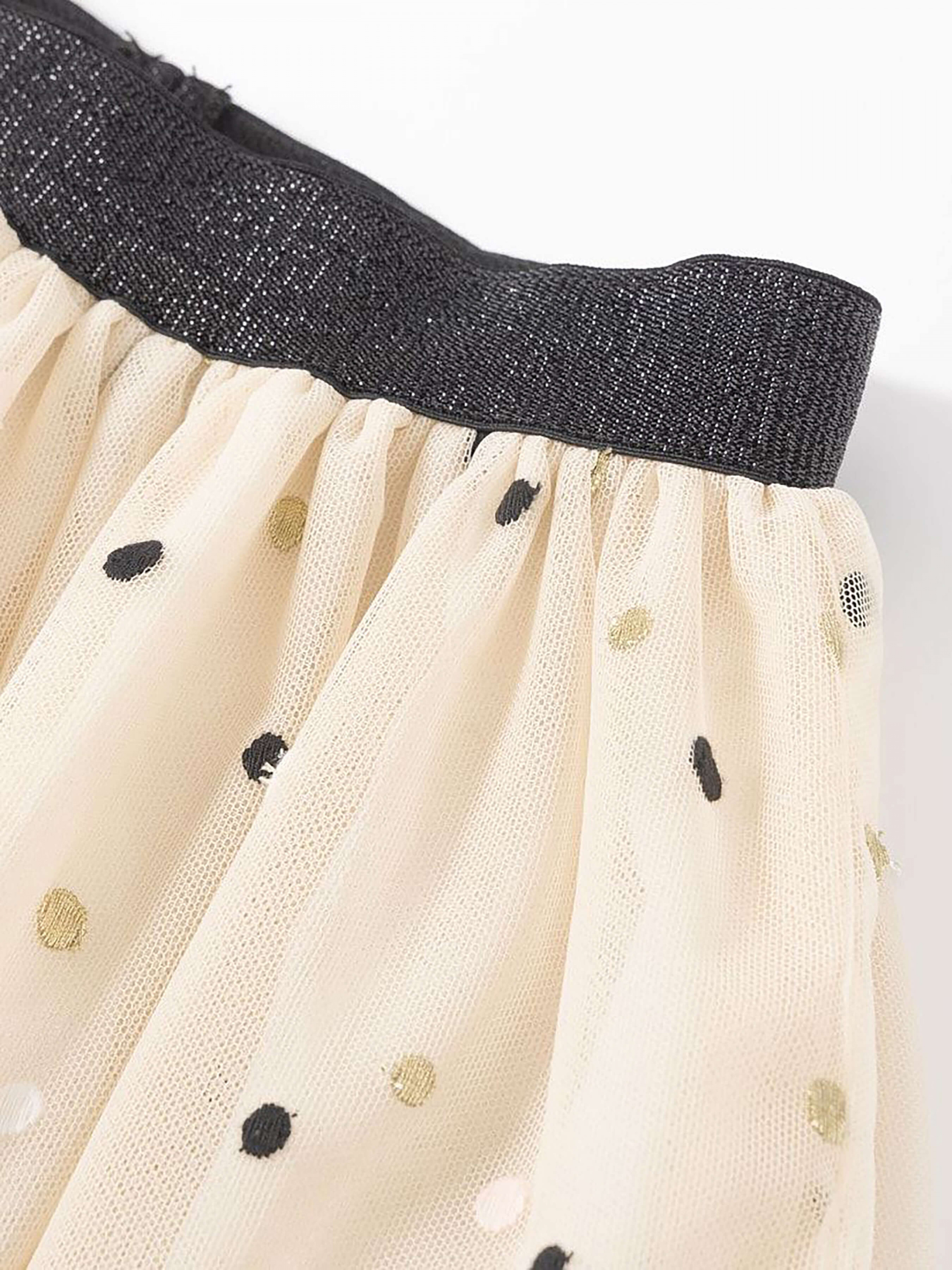 Деталі моделі: спідниця світло-бежевого кольору. Пояс на резинці, чорного кольору з глітером. Довжина спідниці до колін. Є білий, непрозорий під’юбник. Верхній шар спідниці декорований дрібним горохом.