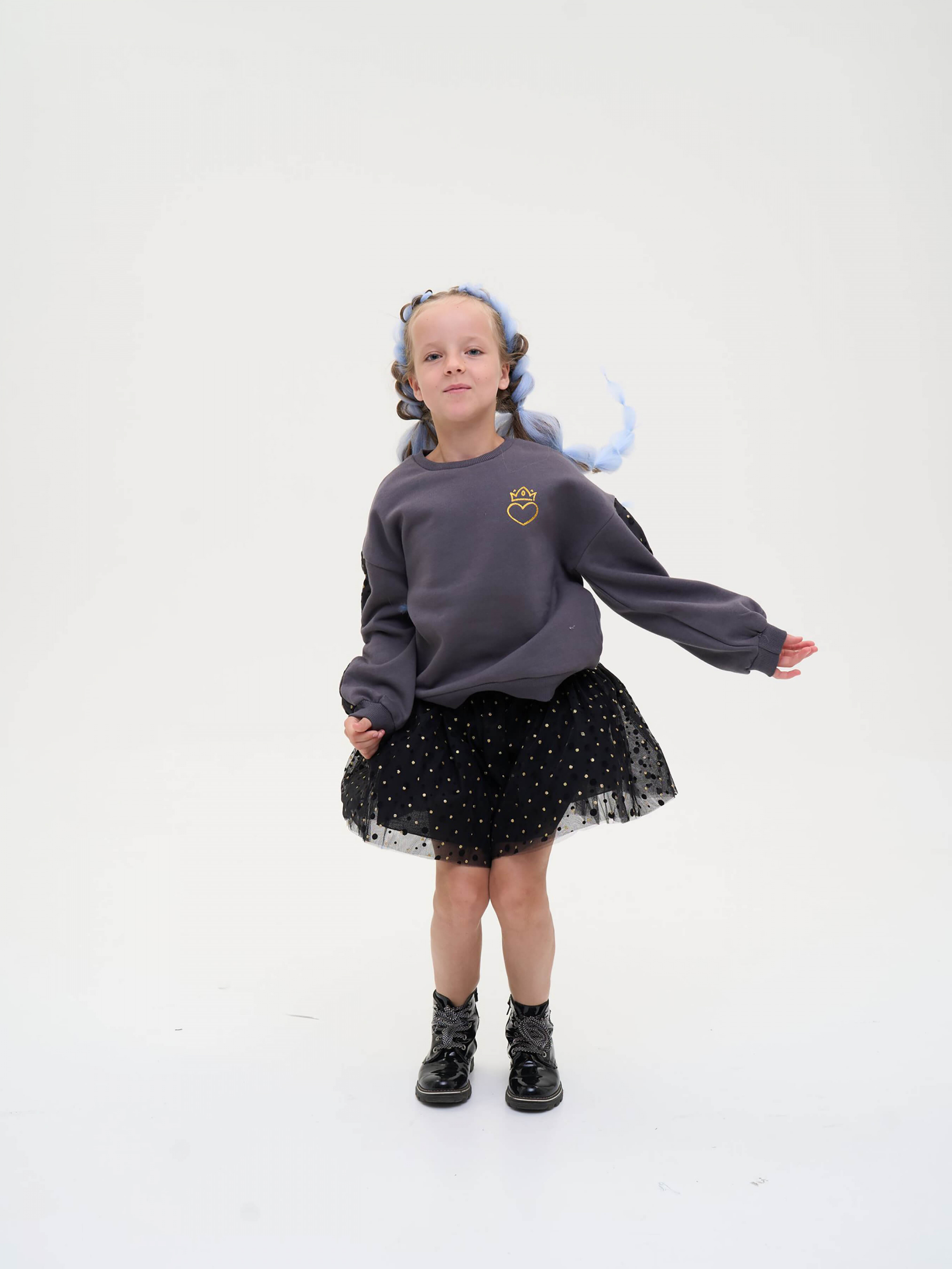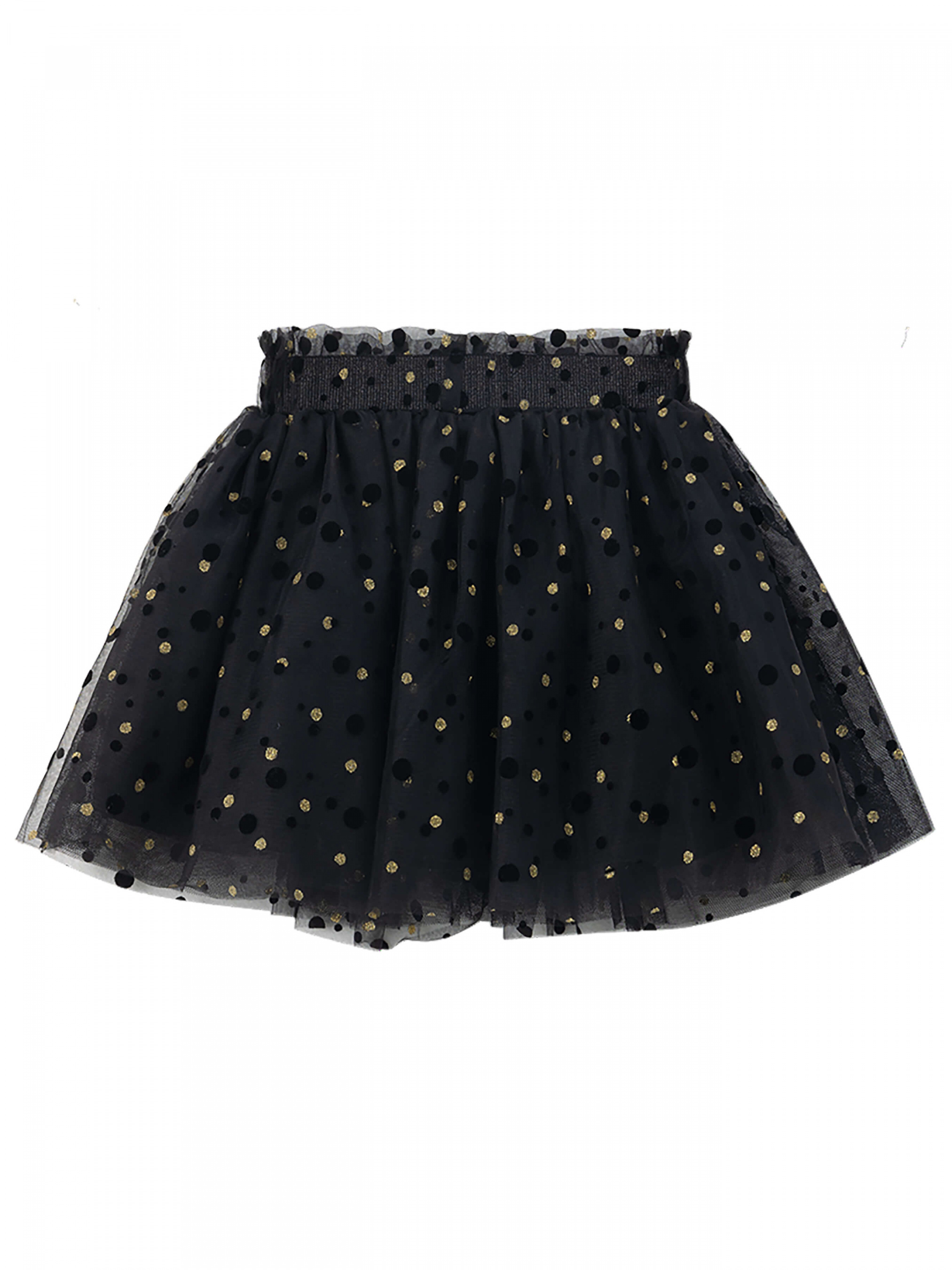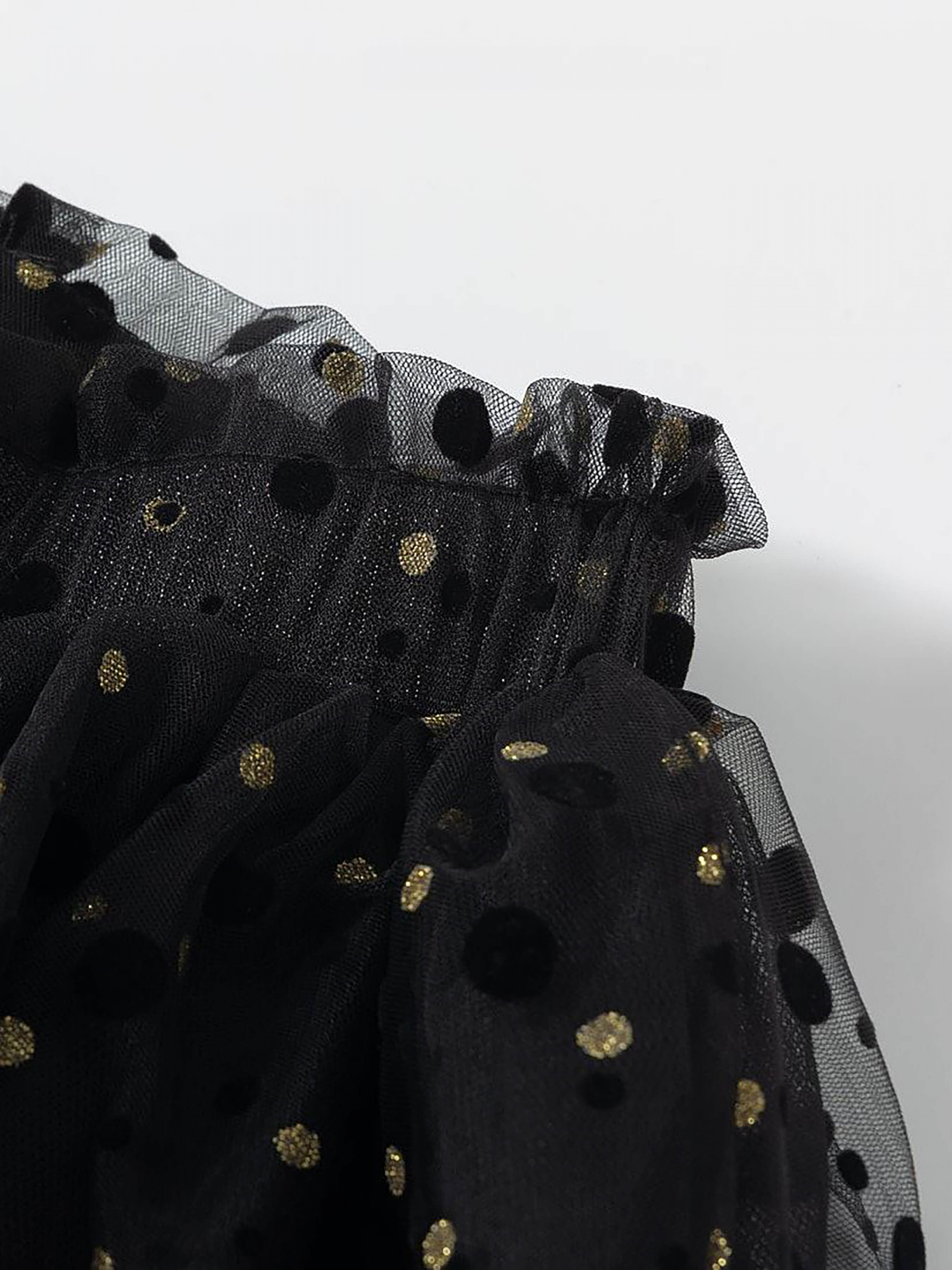 Деталі моделі: спідниця чорного кольору. Пояс на резинці. Кілька ярусів фатина + непрозорий під’юбник чорного кольору. Декор - напилення золотого та чорного кольору у вигляді дрібного горошку.