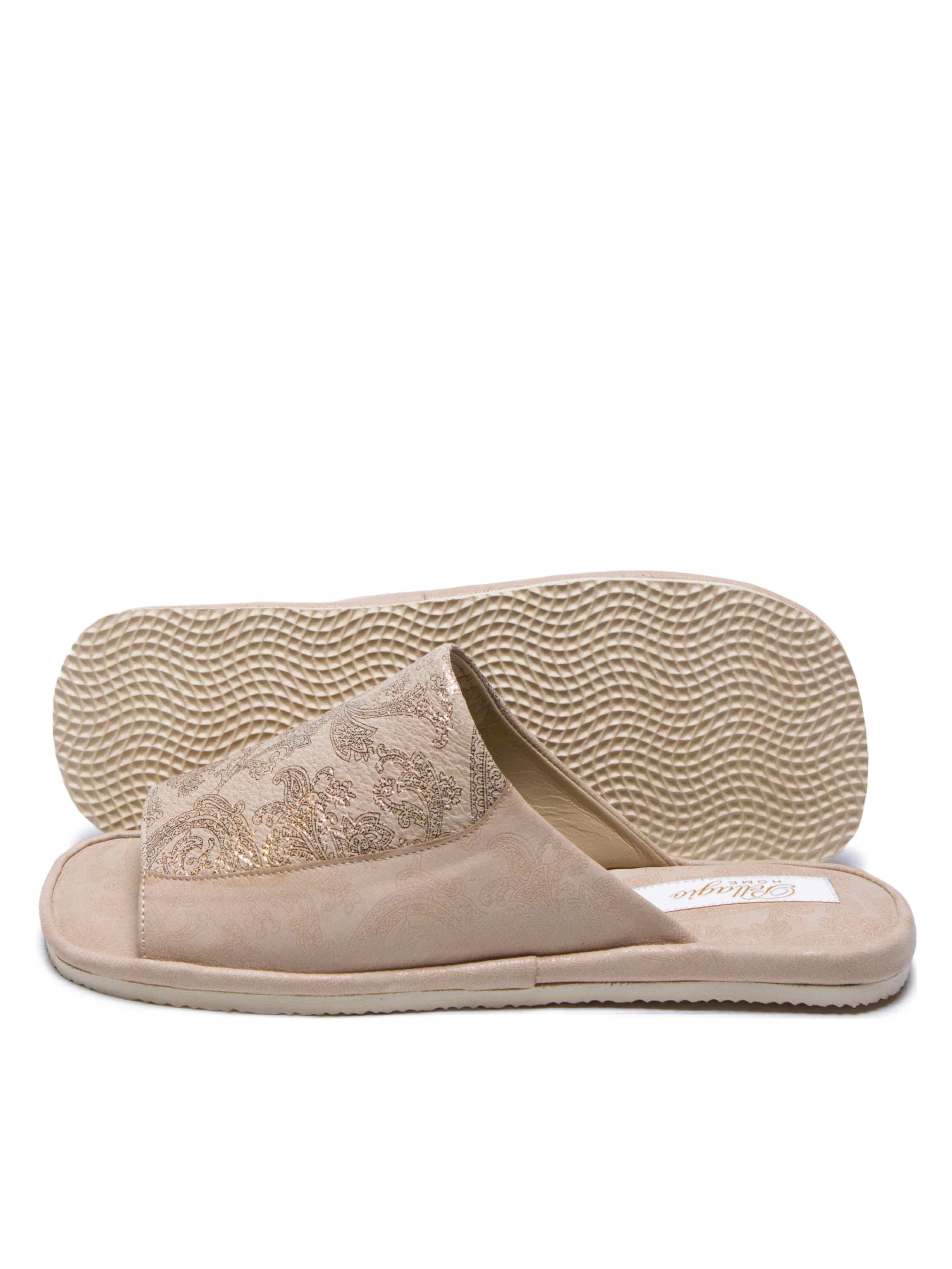 Класична модель відкритих жіночих капців, виконана в м'якій шкірі пісочного кольору з золотистим бароковим візерунком. Візуально модель виглядає більш вишукано та струнко завдяки вставці зі шкіри з більш вираженим по кольору візерунком. Дана модель капців відмінно підійде на широку стопу, стопу з високим підйомом або ж з віковими змінами (кісточки, викривлення пальців). Капці гармонійно доповнює легка і безшумна підошва з EVA бежевого кольору , яка дозволить вийти в капцях навіть на відкриту терасу. Рекомендуємо купувати розмір в розмір