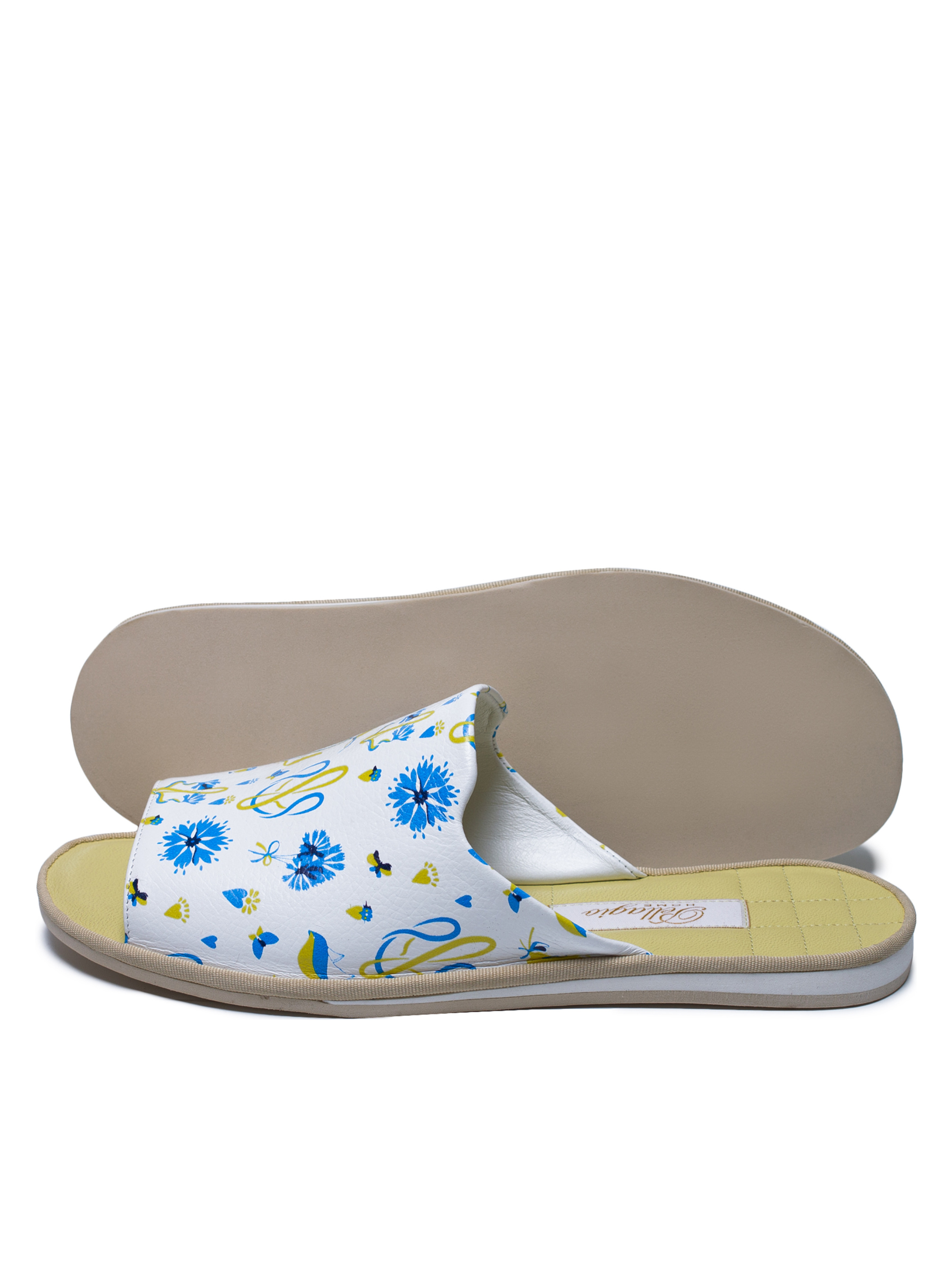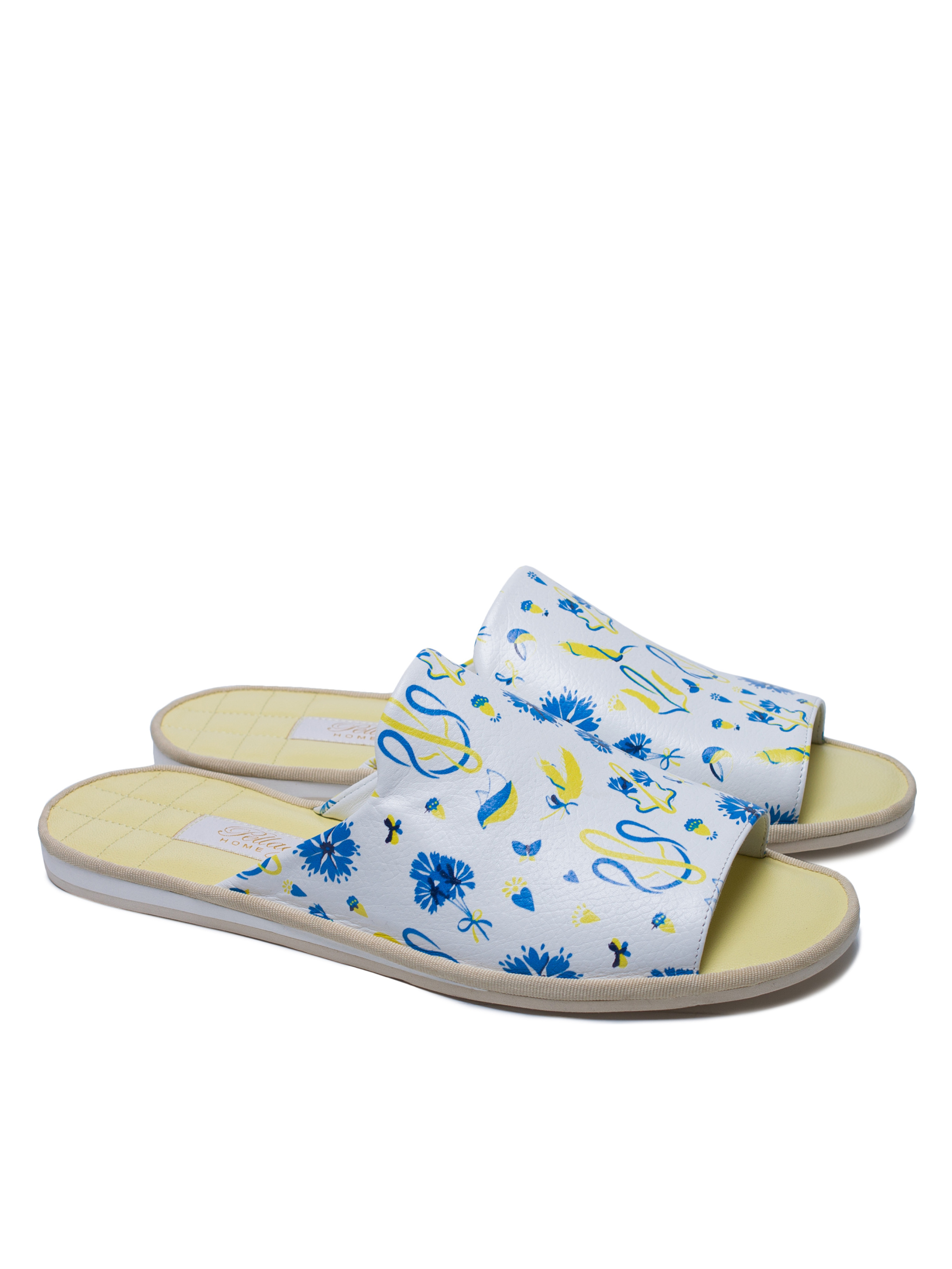 Класична модель відкритих жіночих капців чорного кольору з оригінальним патріотичним принтом та яскравою жовтою устілкою. Капці виконані з усією увагою до комфорту. Дана модель капців відмінно підійде на стандартну стопу або стопу з високим підйомом. Легка і безшумна підошва з EVA дозволить вийти в капцях навіть на відкриту терасу. Рекомендуємо купувати розмір в розмір