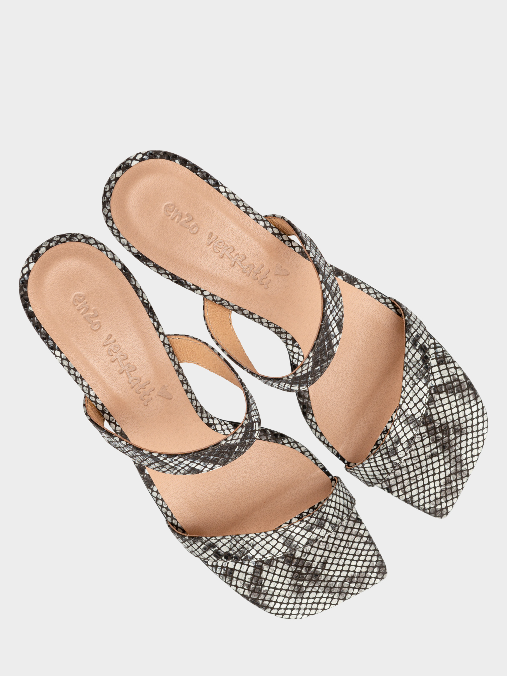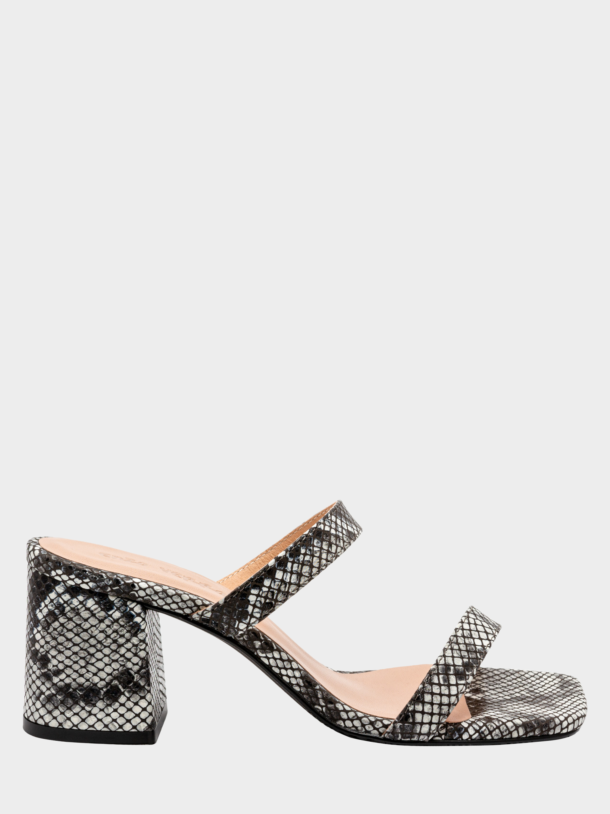 Елегантні жіночі шльопанці, на підборах заввишки 6 см, виготовлені з м'якої шкіри італійського виробництва з тисненням під шкіру пітона. Устілки мають латексну основу, що надає парі м'якості. Союзка виконана з двох тонких смужок, які розташовані в місцях надійної фіксації стопи і підкреслюють жіночність і витонченість власниці цієї стильної пари. Мис має асиметричну квадратну форму. Стопа красиво і зручно викладається по підйому. Зручна колодка, сучасні форми і відкритість роблять цю пару невагомою і придатною для тривалих літніх прогулянок і приємних вечорів. Розмірна сітка по устілці: 35 р - 23,3 см, 36 р - 24 см, 37 р - 24,5 см, 38 р - 25,3 см, 39 р - 26 см, 40 р - 26,7 см.