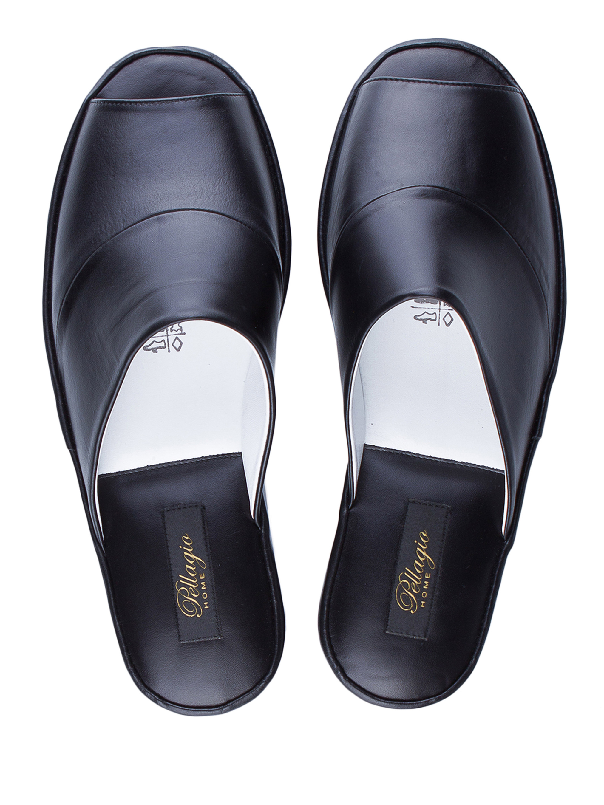 Чорні домашні капці без задника виконані з м'якої гладкої шкіри з глянцевим блиском. Комбінована союзка повторює форму стопи, тому капці ідеально сідають по нозі. Легка і безшумна підошва з EVA дозволить вийти в капцях навіть на відкриту терасу. Рекомендуємо купувати розмір в розмір