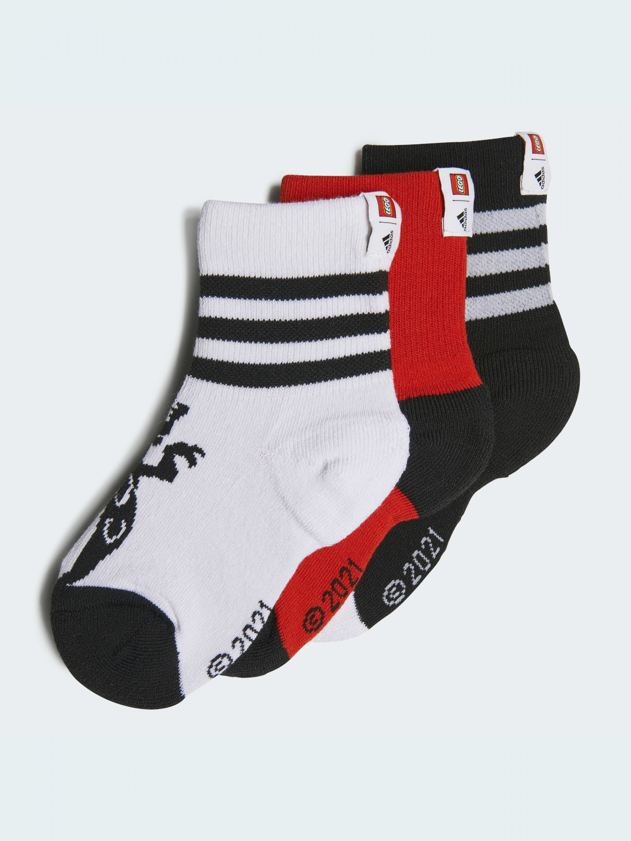 Фізкультура, тренажерний зал, веловихідні. Діти завжди в русі. Їм потрібно багато здорової їжі. Та багато шкарпеток. Дизайнери adidas подбали про це. Комфортні шкарпетки з колекції LEGO® Group х adidas прикрашені графікою від LEGO® NINJAGO®. На кожній парі свій малюнок. Шкарпетки продаються по три пари, а отже тобі менше клопоту із пранням. До складу моделі входить матеріал Primegreen, створений із перероблених волокон.