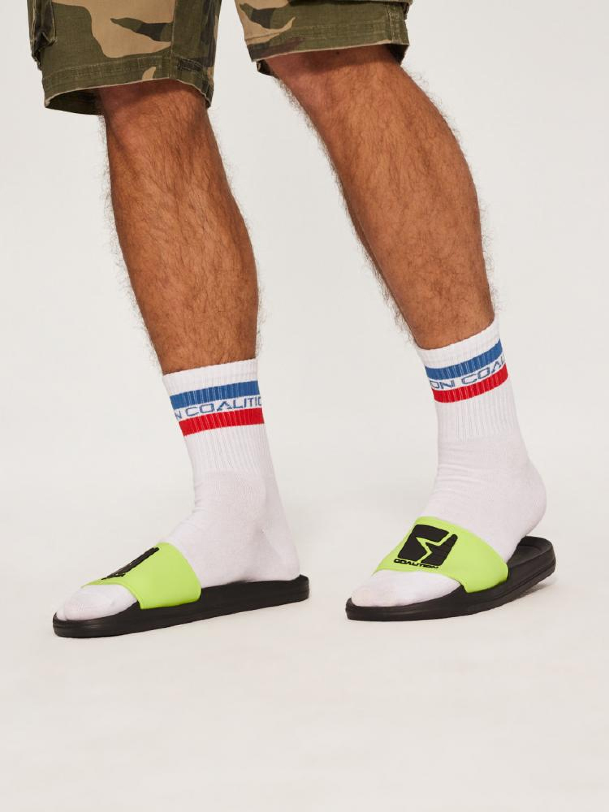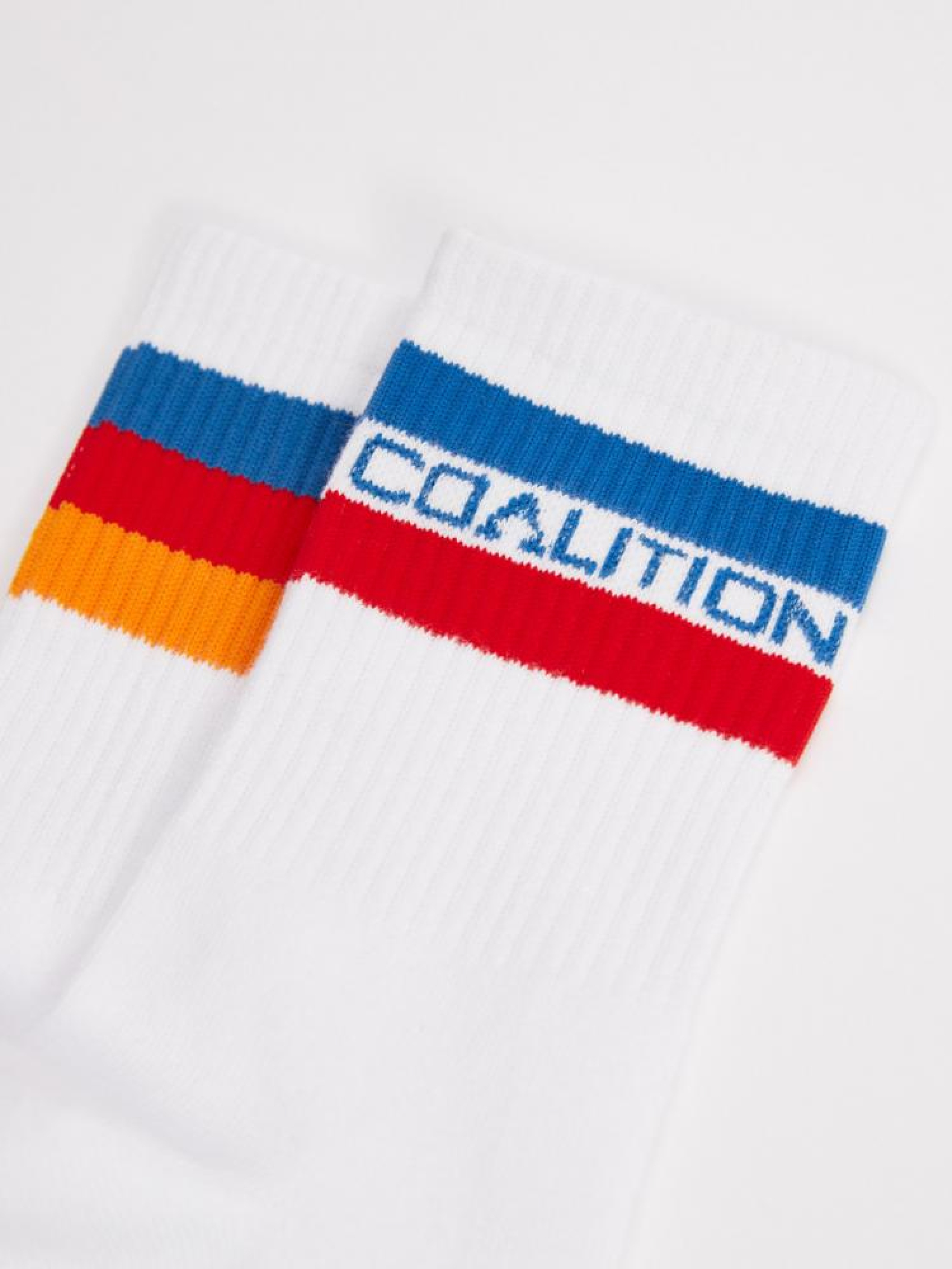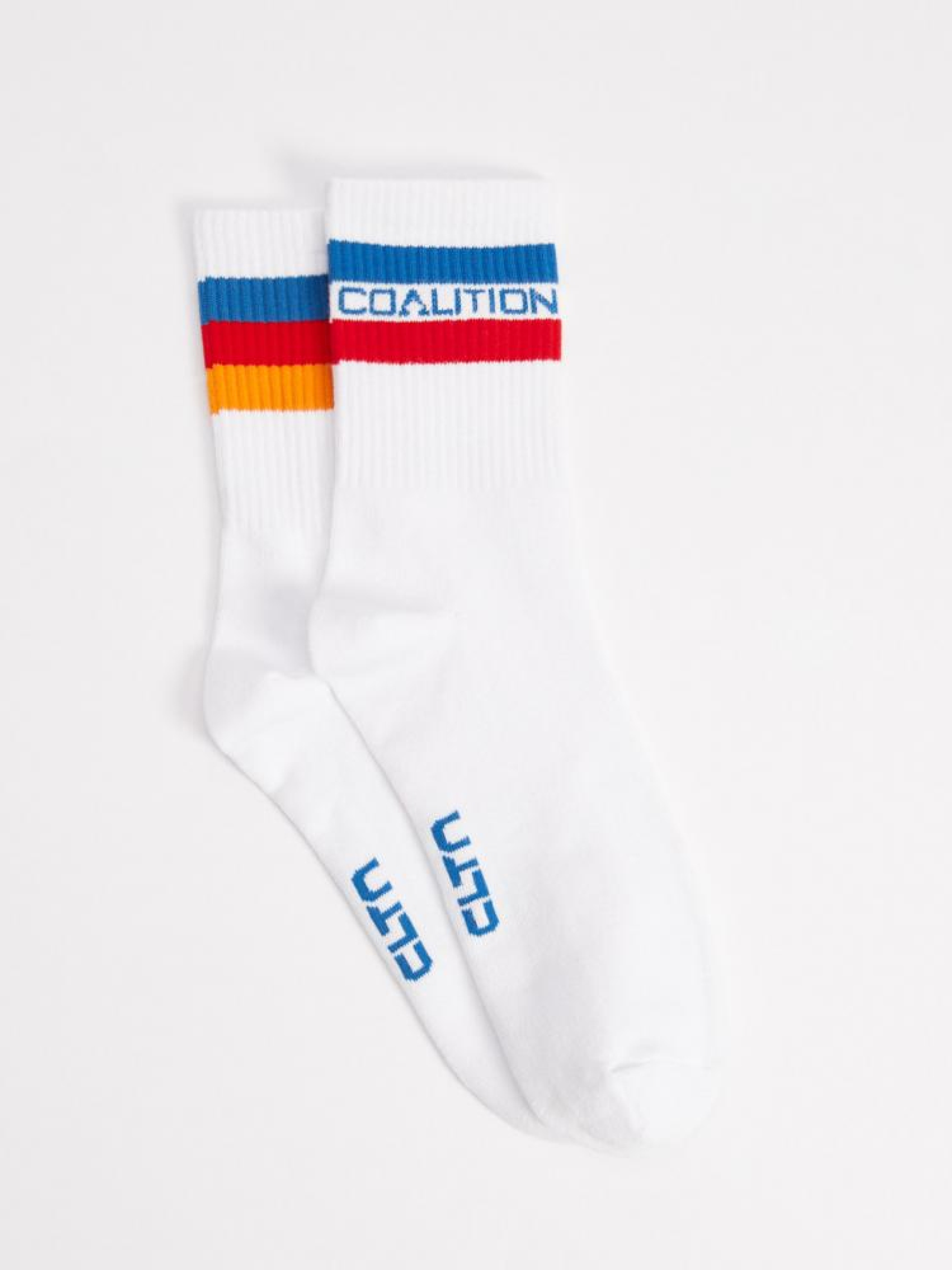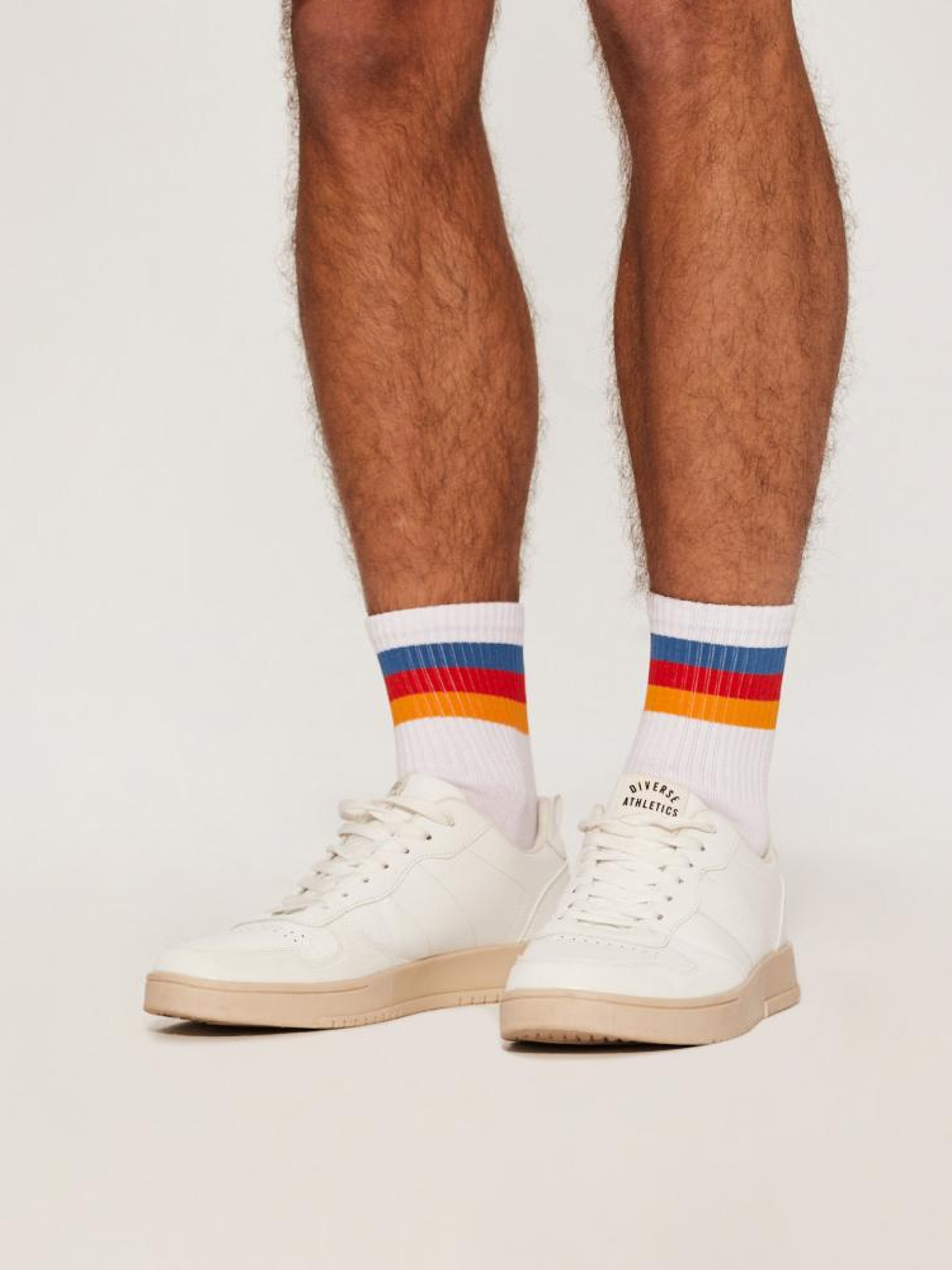 Чоловічі білі спортивні шкарпетки: - різнокольоровий знак унизу, - кольорові смужки вгорі, - дві різні пари в пачці. Сезон: Весна/Літо. Склад: 80% бавовна, 17% поліестер, 3% еластан.
