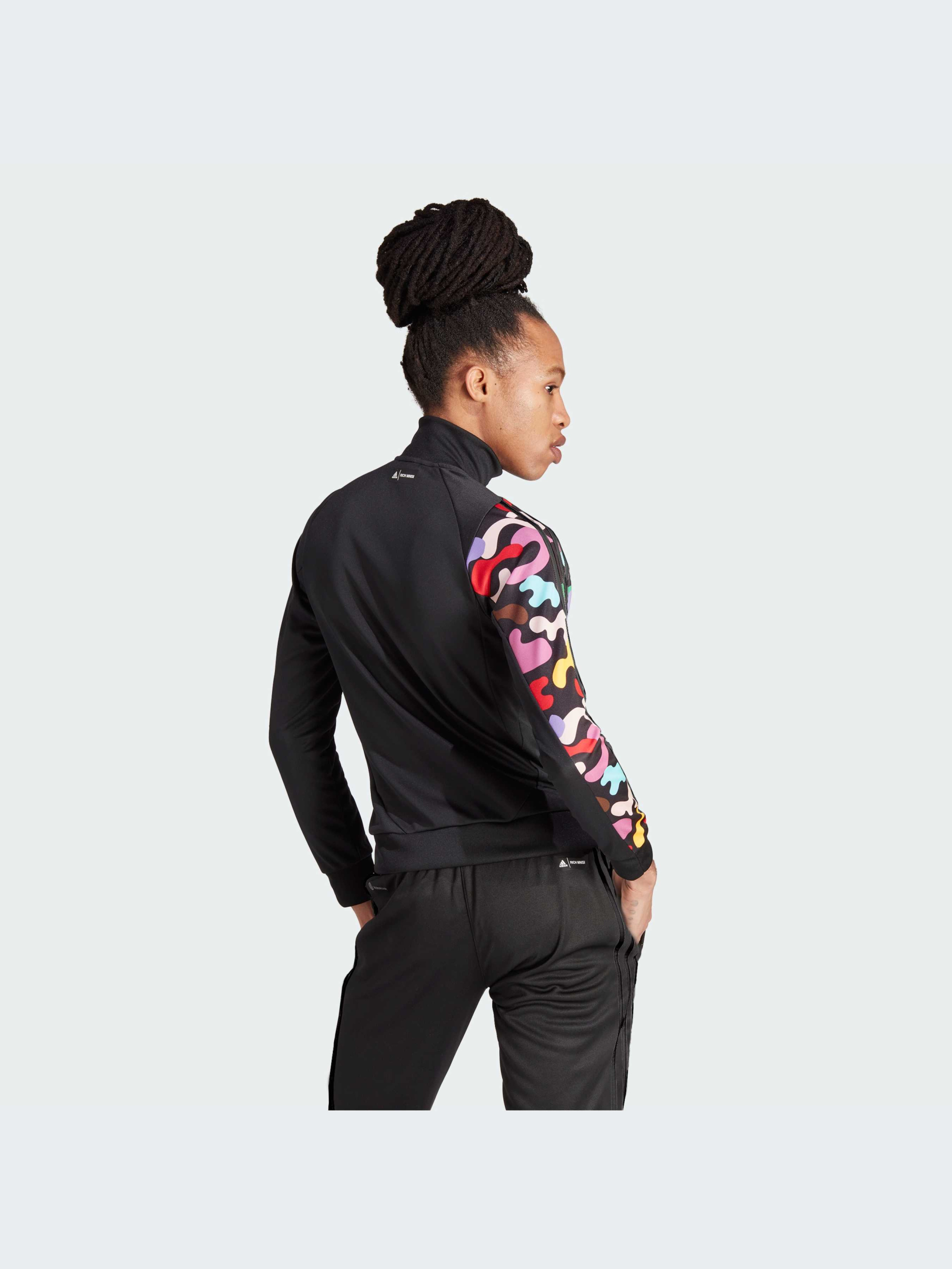 Характеристики AEROREADY Застібка на блискавку; комір-стійка Передні кишені на блискавці Щільний трикотаж: 100% перероблений поліестер Стандартний крій 3D структуровані стрічки з трьома смужками Рифлені манжети та нижній край Опис Нехай тобою рухає любов. Південноафриканський дизайнер Річ Мнісі одного разу написав це нагадування в листі собі минулому, і сьогодні це нагадування лежить в основі колекції adidas x Rich Mnisi Pride Collection. Торжество самовираження, уяви та непохитної віри в те, що любов об'єднує. Це партнерство - одна зі складових наших зусиль із підтримки спільноти LGBTQIA+ поряд із нашим партнером із глобальних цілей, Athlete Ally. Ця спортивна олімпійка adidas створює настрій. Ти виконуєш роботу. По-бунтарськи оптимістична, вона має передні кишені на блискавці для зручності та AEROREADY для комфорту при вологовідведенні. Застібка-блискавка з коміром-стійкою дає змогу піддівати шар одягу, щоб не замерзнути під час тренування. Різнокольорова графіка на одному рукаві являє собою абстрактний, натхненний містом підхід до сміливого анімалістичного принту. Модель на 100% складається із перероблених матеріалів і представляє одне з наших рішень зі скорочення пластикових відходів.