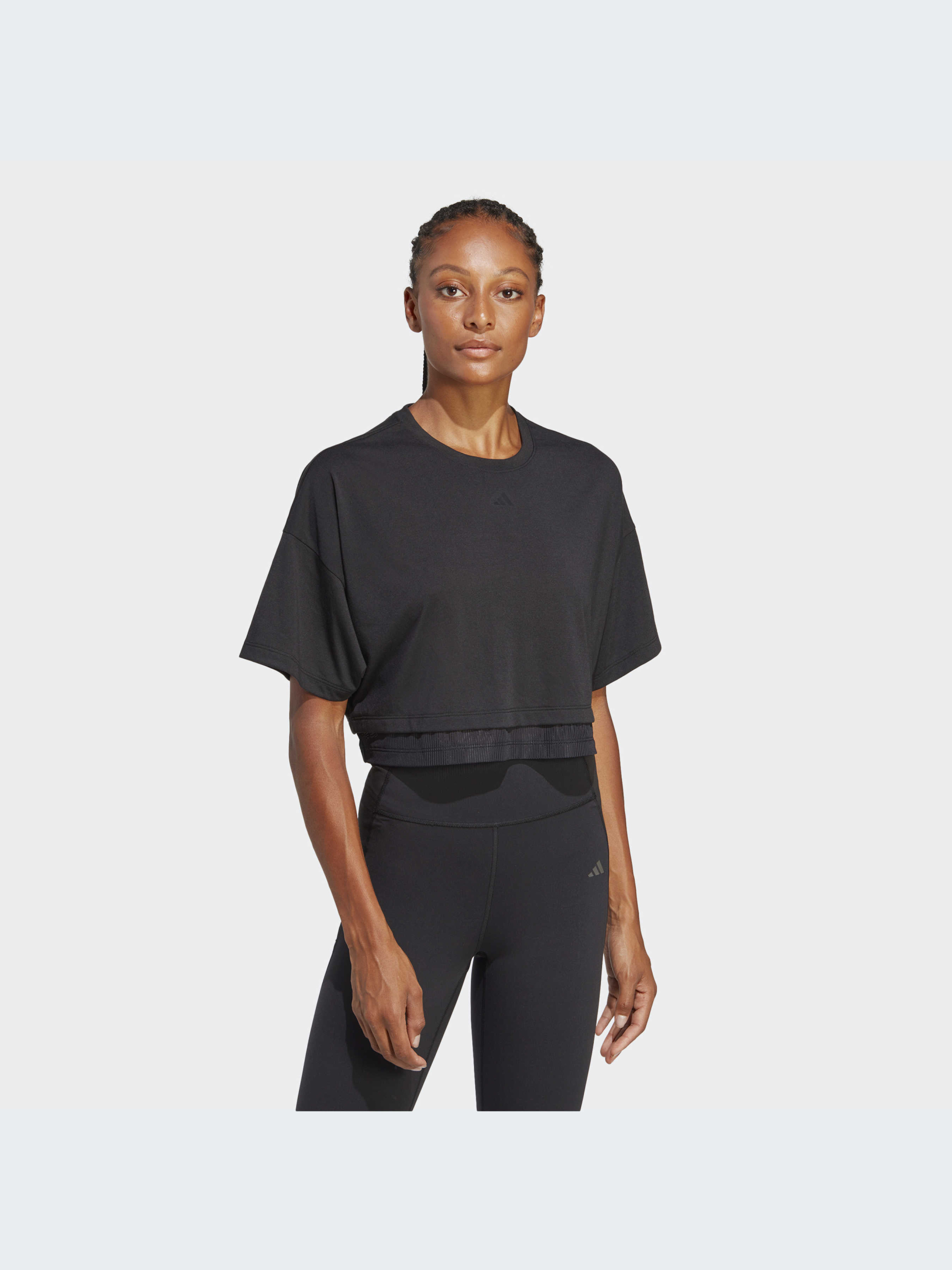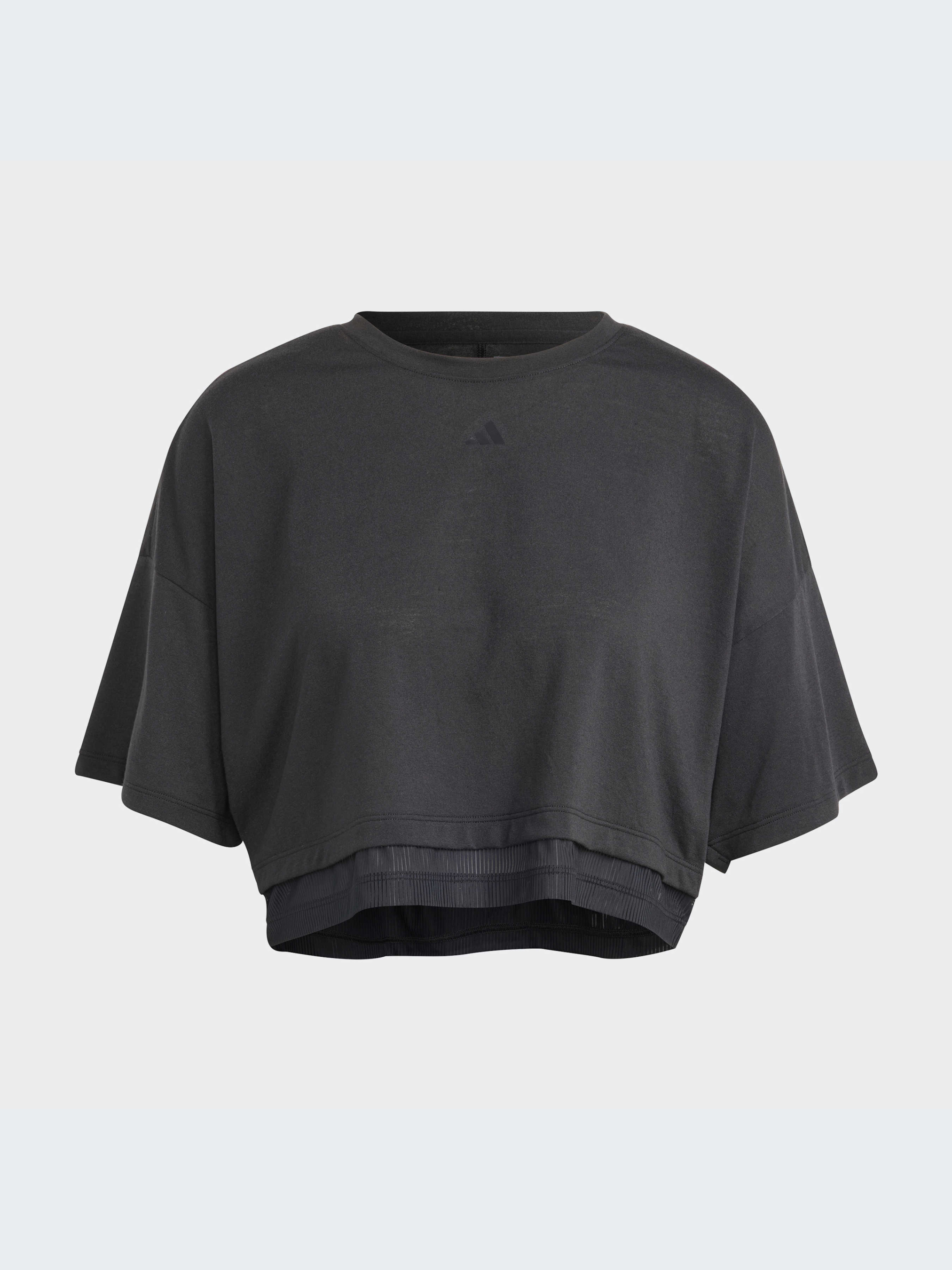 Характеристики AEROREADY Круглий виріз горловини Вільний крій Тонкий трикотаж: 100% перероблений поліестер Вкорочена довжина Двошарова сітчаста тканина Опис Змішуй. Поєднуй. Змінюй образи. У цій футболці adidas ти зможеш бути у своєму ритмі в будь-який час. Вона вільного крою, тому ти можеш рухатися з повним комфортом. Займайся у спеку, бо система AEROREADY забезпечує відведення вологи. Сітка проглядає знизу, щоб надати багатошарового вигляду та відчуття легкості. Модель на 100% складається із перероблених матеріалів і представляє одне з наших рішень зі скорочення пластикових відходів. Йде розмір в розмір. Ми радимо замовити цю модель в твоєму звичайному розмірі.