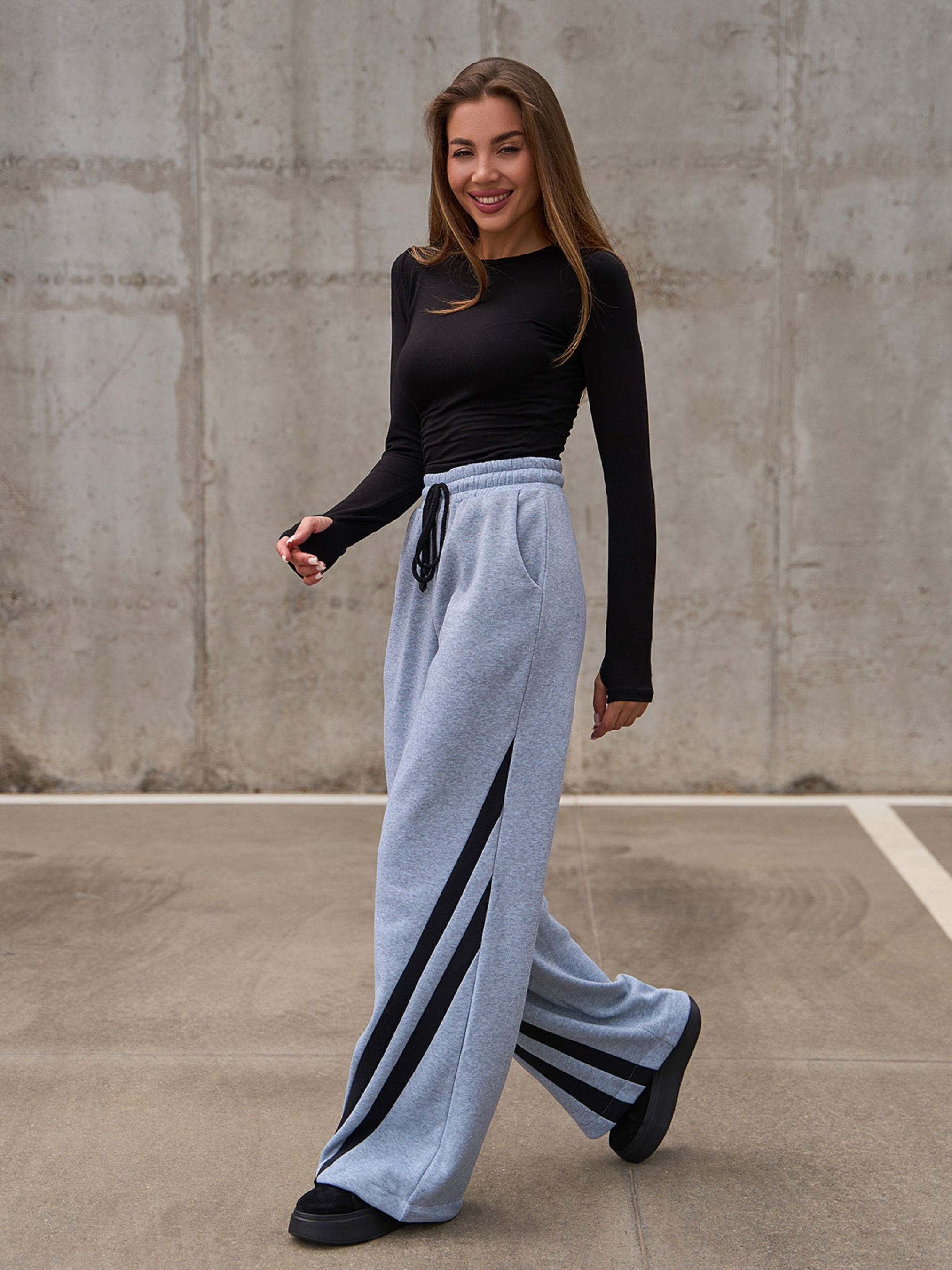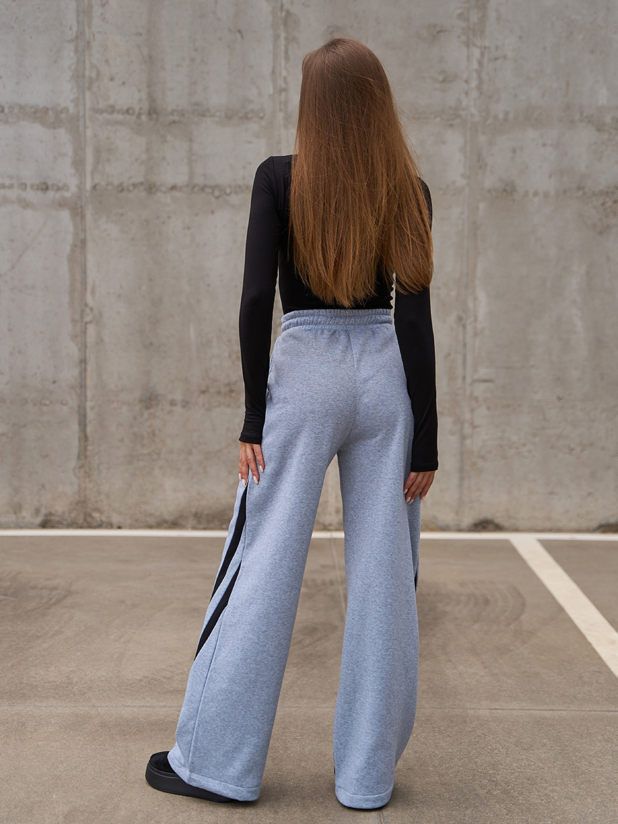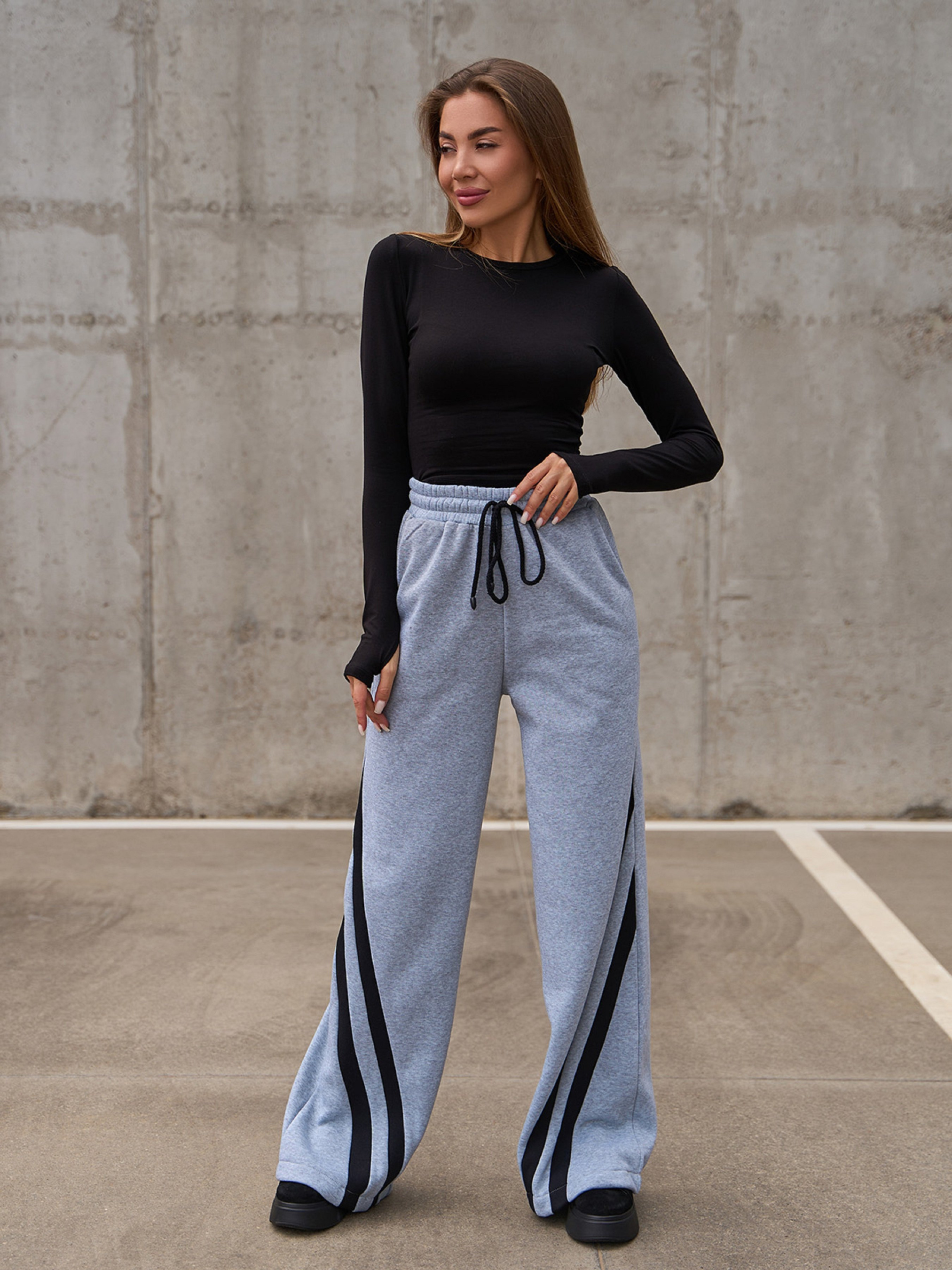 Широкі спортивні штани на поясній гумці, виготовлені зі світло-сірого трикотажу на флісі. Модель високої посадки прямого вільного крою з кишенями та шнурком на поясі. Штани декоровані бічними діагональними смужками. Напівобхват: Талія: S (32-38), M (34-40), L (36-42), XL (38-44), Стегна: S (50), M (52), L (54), XL (56), Довжина виробу - 108, Довжина внутрішнього шва - 78, Тканина: Середньої еластичності