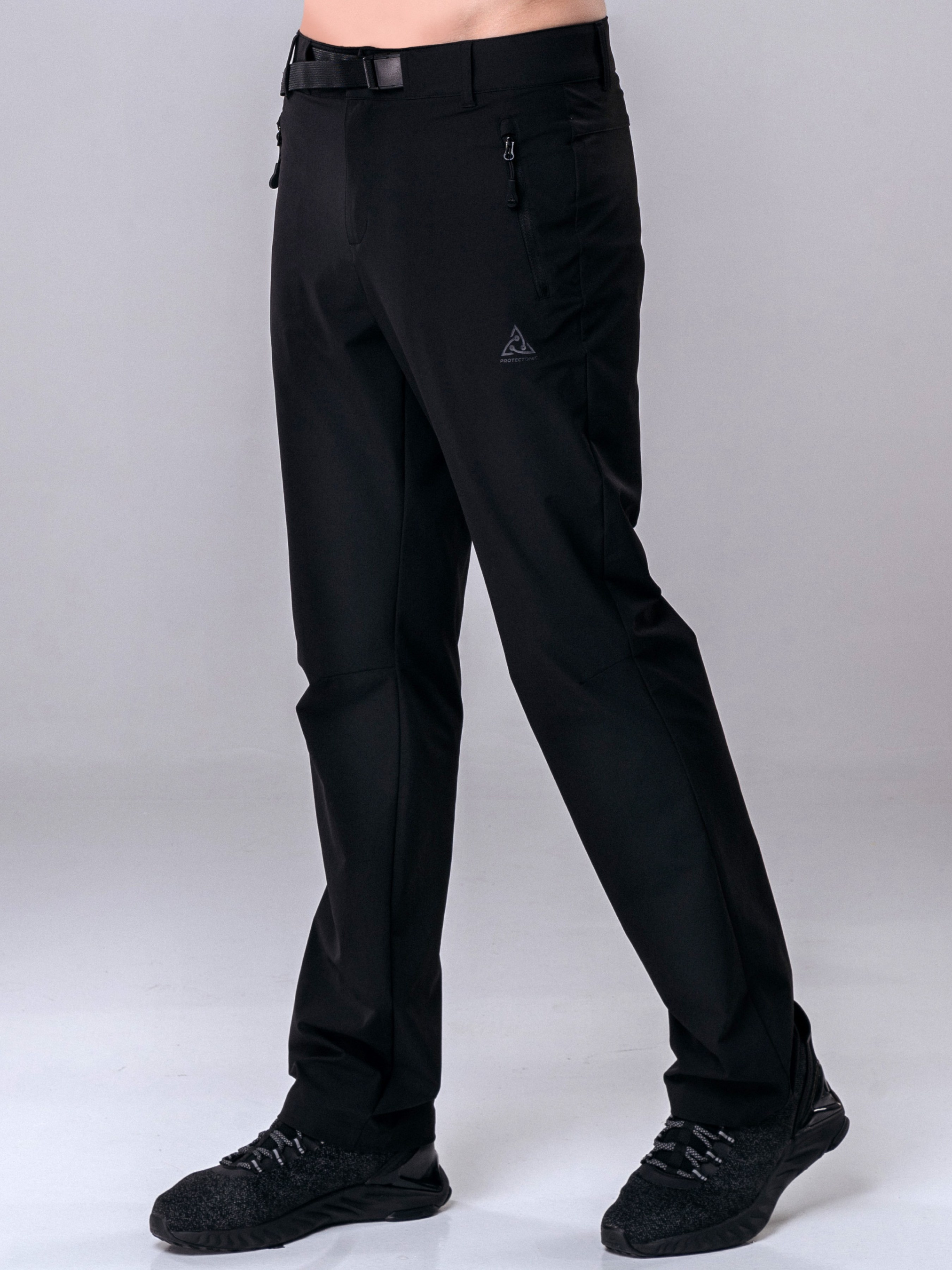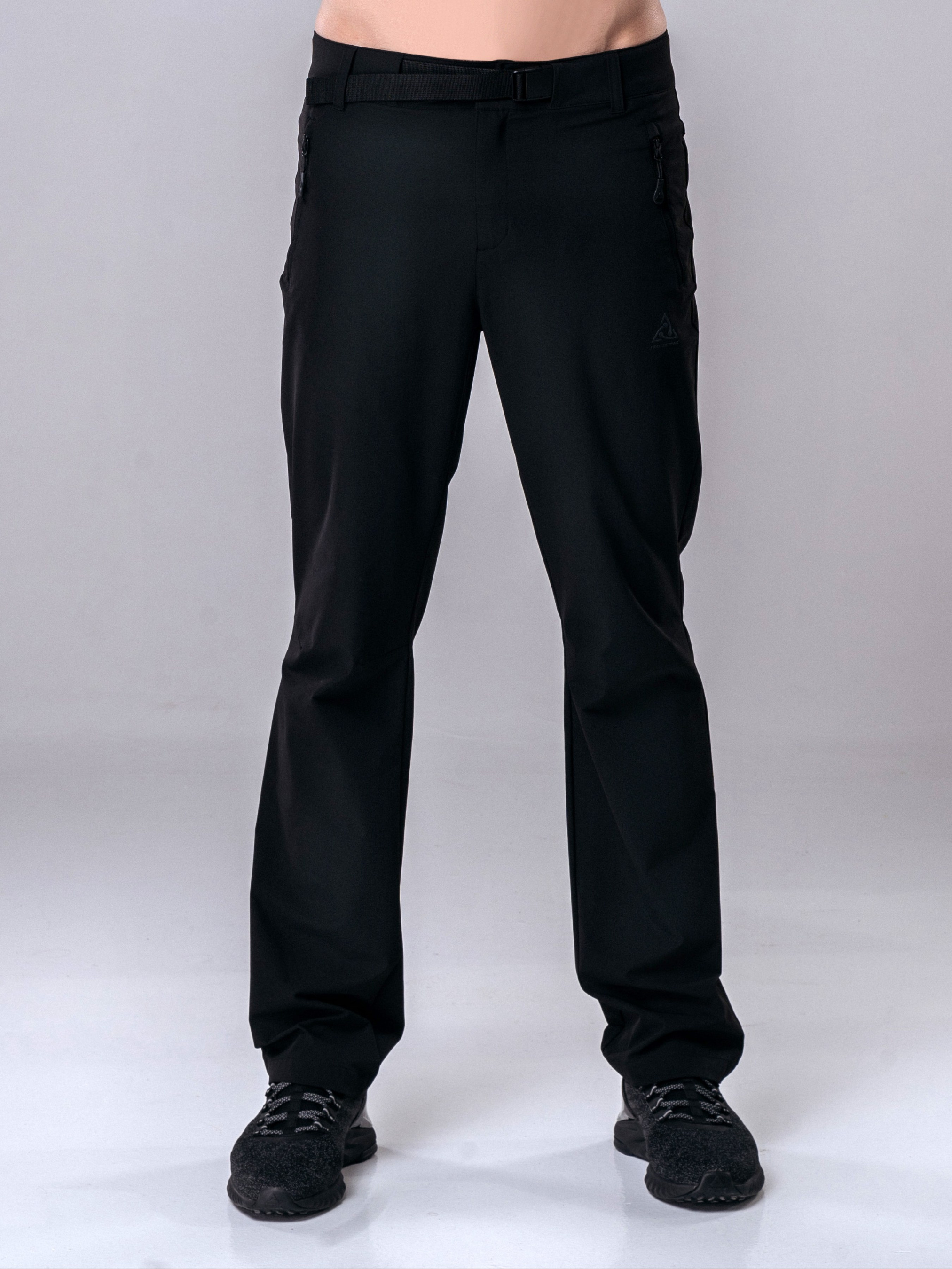 Штани спортивні чоловічі, чорного кольору. - Штучний матеріал, середньої щільності та середнього рівня еластичності. Тканина швидко сохне та характеризується високою формостабільністю. - Фіксуються в зоні поясу за допомогою кнопки з блискавкою, а також мають ремінець. - Присутні три кишені на блискавці (дві кишені збоків та одна позаду). - Модель прямого крою з середнею посадкою. - Відмінно підійдуть для активного відпочинку та прогулянок містом на весні та теплої осені. Матеріал: 92% нейлон 8% спандекс