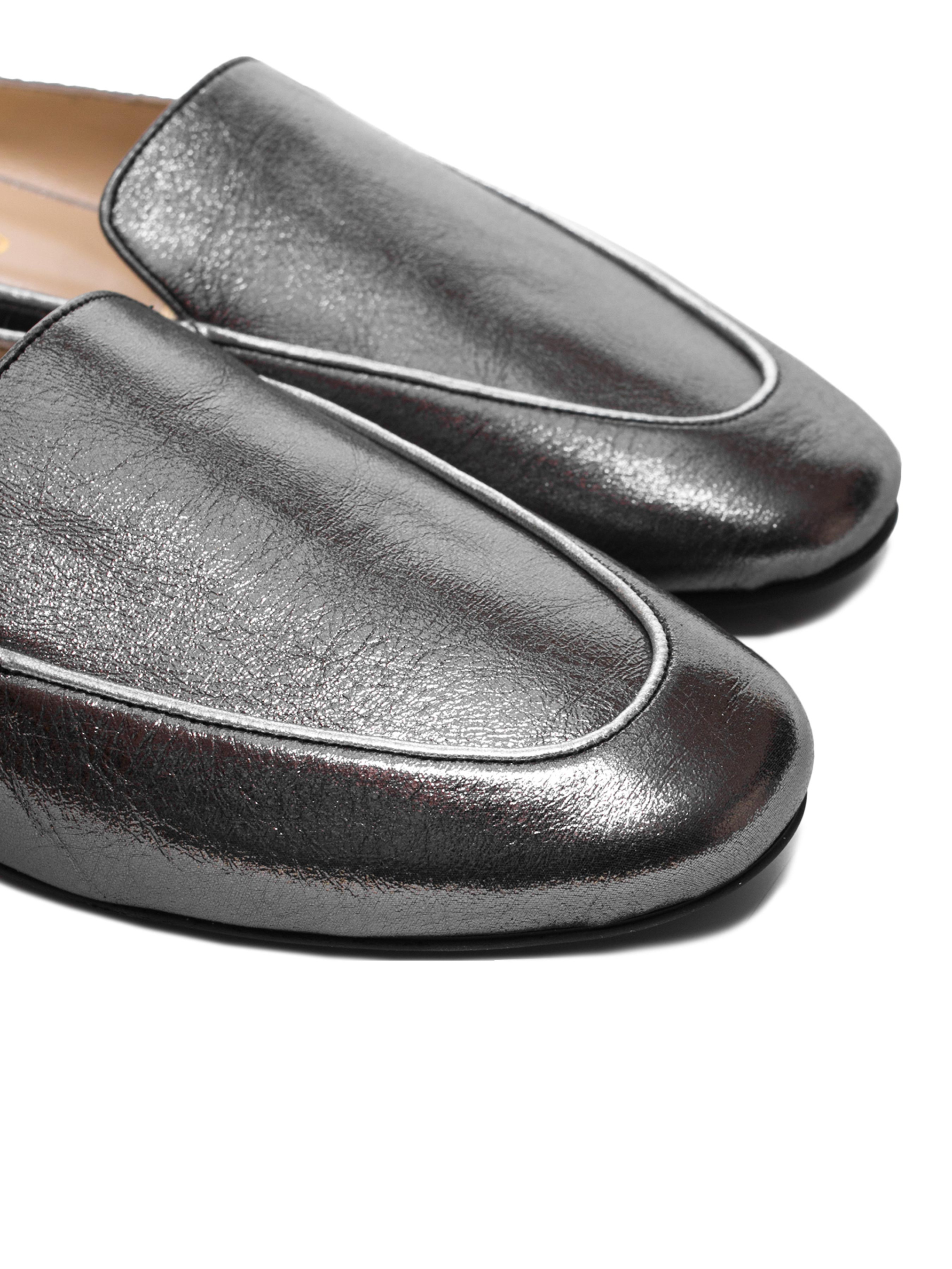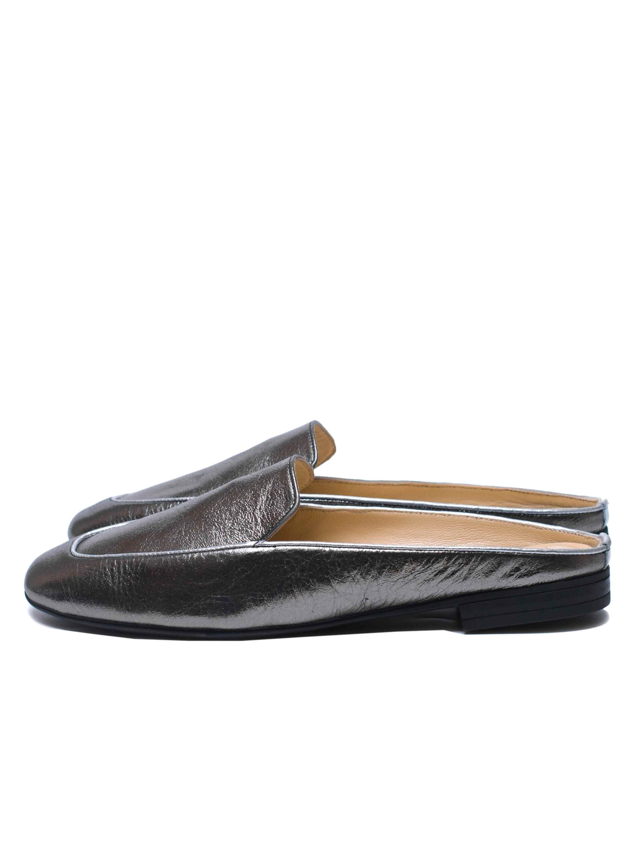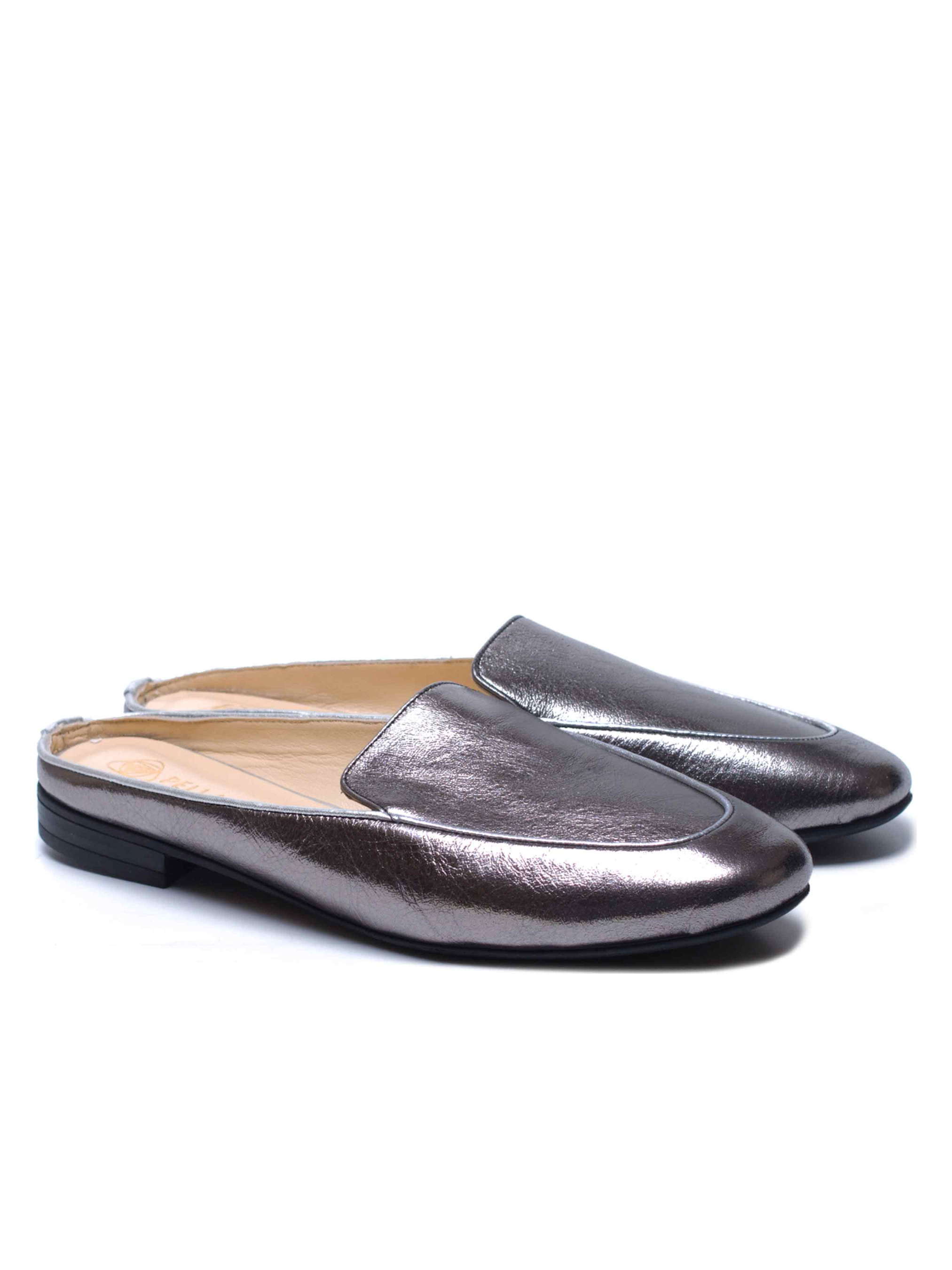 Вишукані жіночі мюлі кольору темного срібла. Світлий кант робить модель більш сучасною. Виконані з м'ягкої та еластичної шкірі. Конструкція данної моделі візуально робить іі більш стрункою та витонченою. Особливу увагу приділили матеріалу підошви, завдяки гнучкості та еластичності обраної гуми- мюлі вийшли дуже комфортними, в них ногам зручно протягом всього дня.