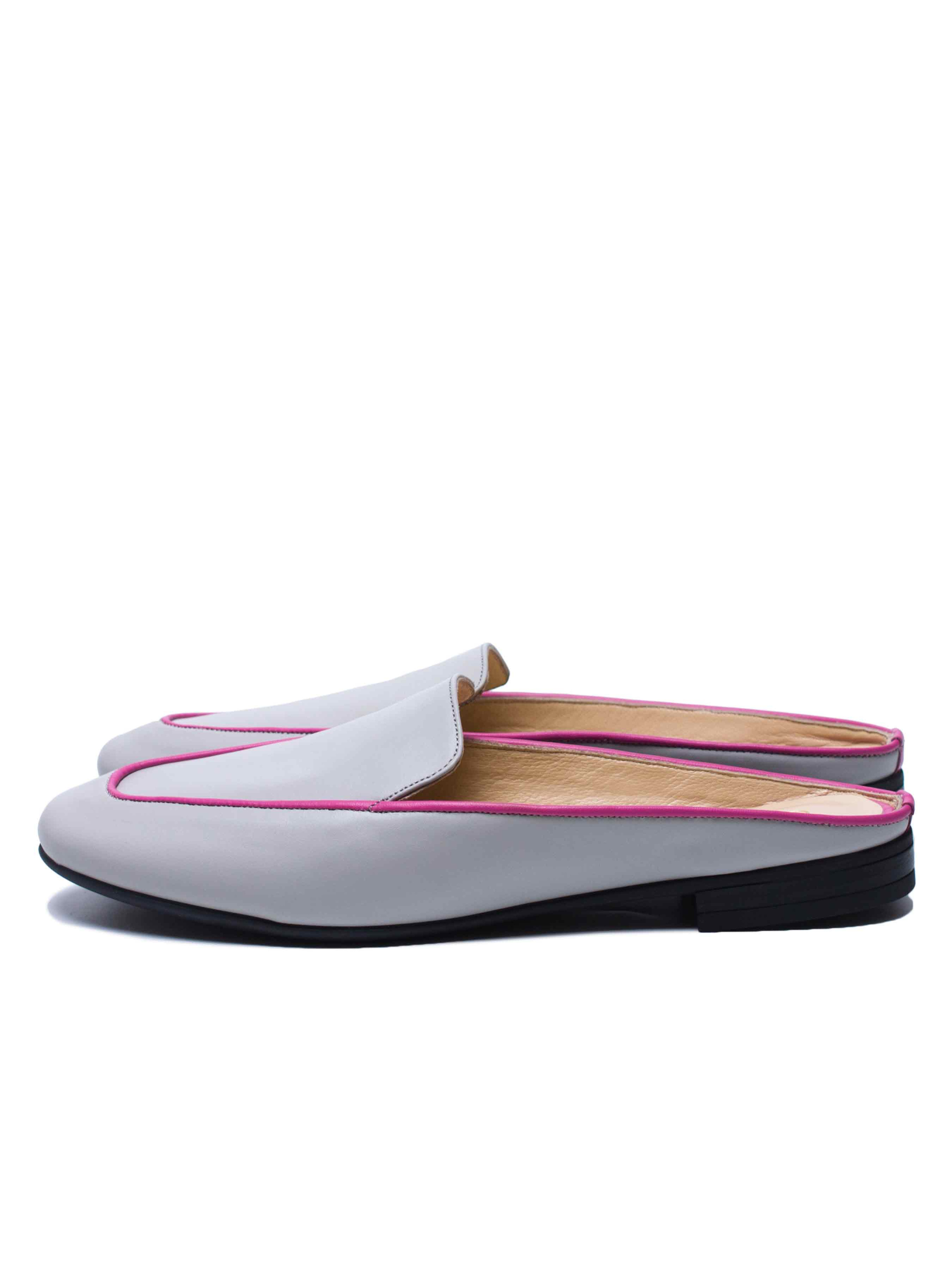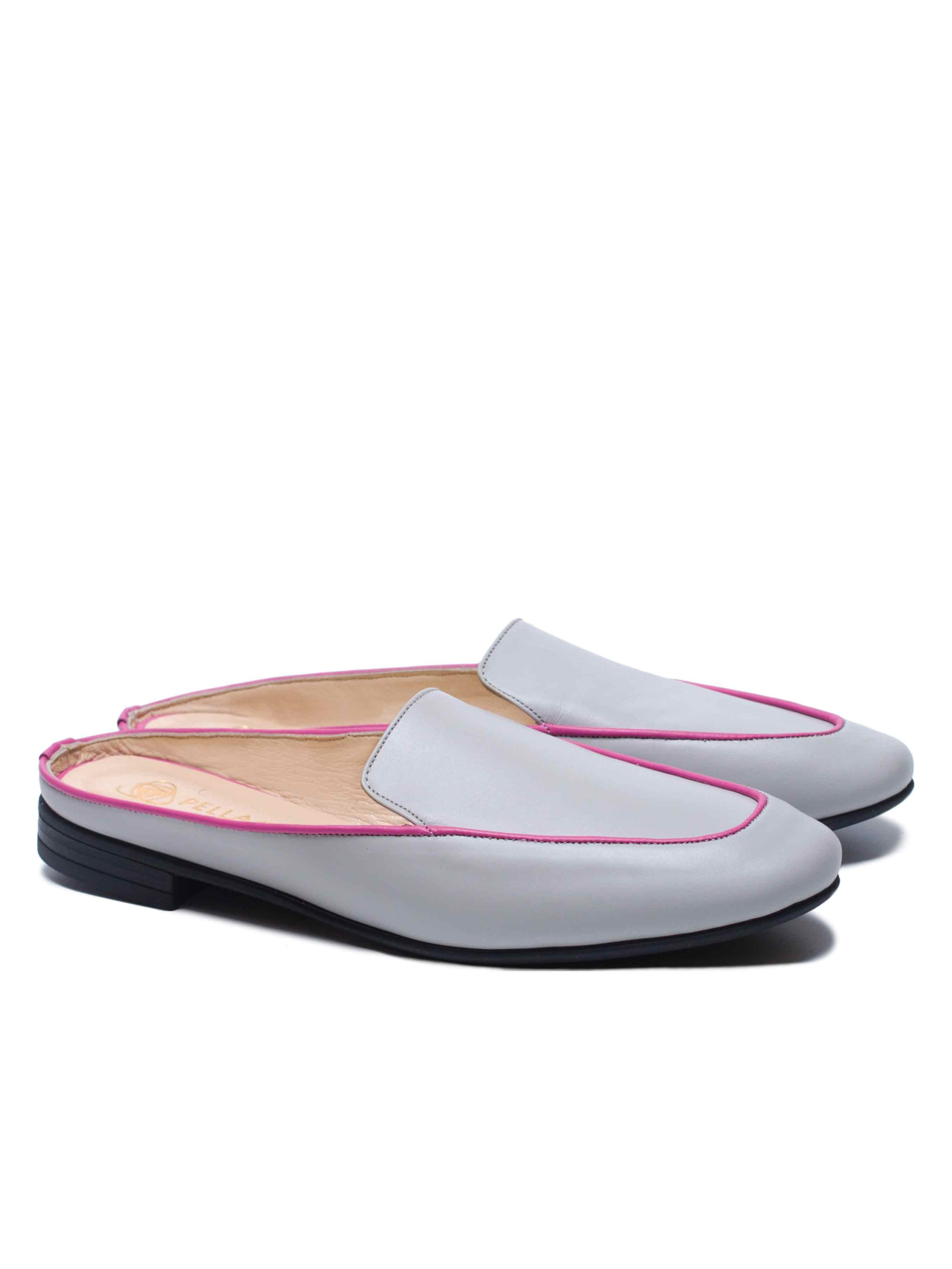 Вишукані жіночі мюлі світло-сірого кольору. Яскравий кант робить модель більш сучасною. Виконані з м'ягкої та еластичної шкірі. Конструкція данної моделі візуально робить іі більш стрункою та витонченою. Особливу увагу приділили матеріалу підошви, завдяки гнучкості та еластичності обраної гуми- мюлі вийшли дуже комфортними, в них ногам зручно протягом всього дня.