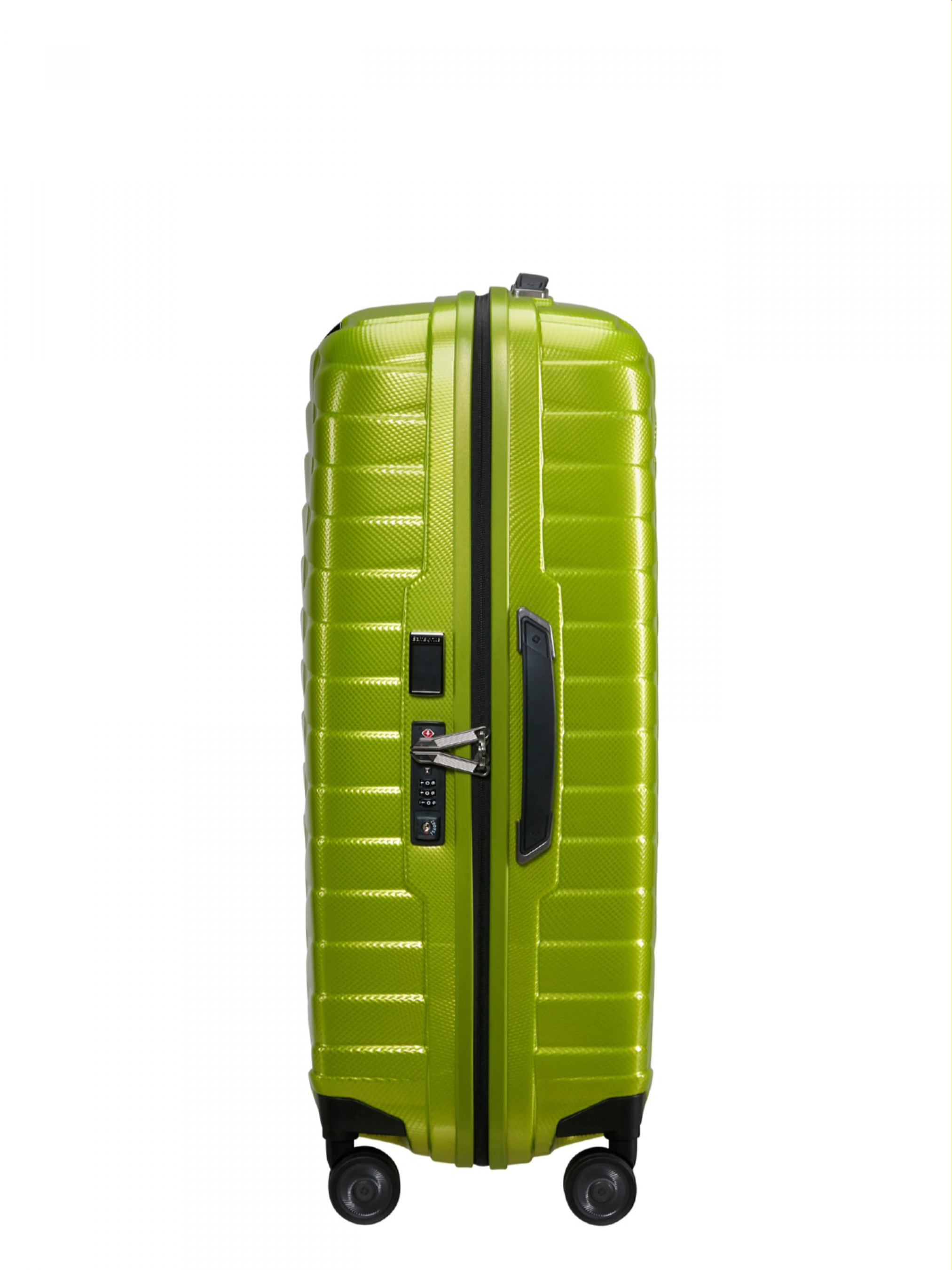 Валіза PROXIS LIME 69x48x29 Екстер’єр: розкішний дизайн з металевим логотипом; ударостійкий корпус виготовлений з багатошарового поліпропілену Roxkin, який відновлює свою форму; кодовий замок із функцією митного огляду TSA, в якому фіксуються бігунки блискавки; висувна бирка для ідентифікації власника. Інтер'єр: два відділення, які закриваються міцною підкладкою преміум-класу із застібкою-блискавкою; велика кишеня із сітки на блискавці; дно валізи вкрите текстильною сіткою; знімні перехресні ремені з регулюванням по висоті. Комфортне транспортування: легка вага – всього 2,7 кг; висувна алюмінієва ручка, на якій можна додатково зафіксувати рюкзак або сумку; подвійні колеса з плавним ходом, що обертаються на 360 градусів; заглиблення в нижній частині валізи і прогумовані ручки для транспортування у вертикальному і горизонтальному положеннях.