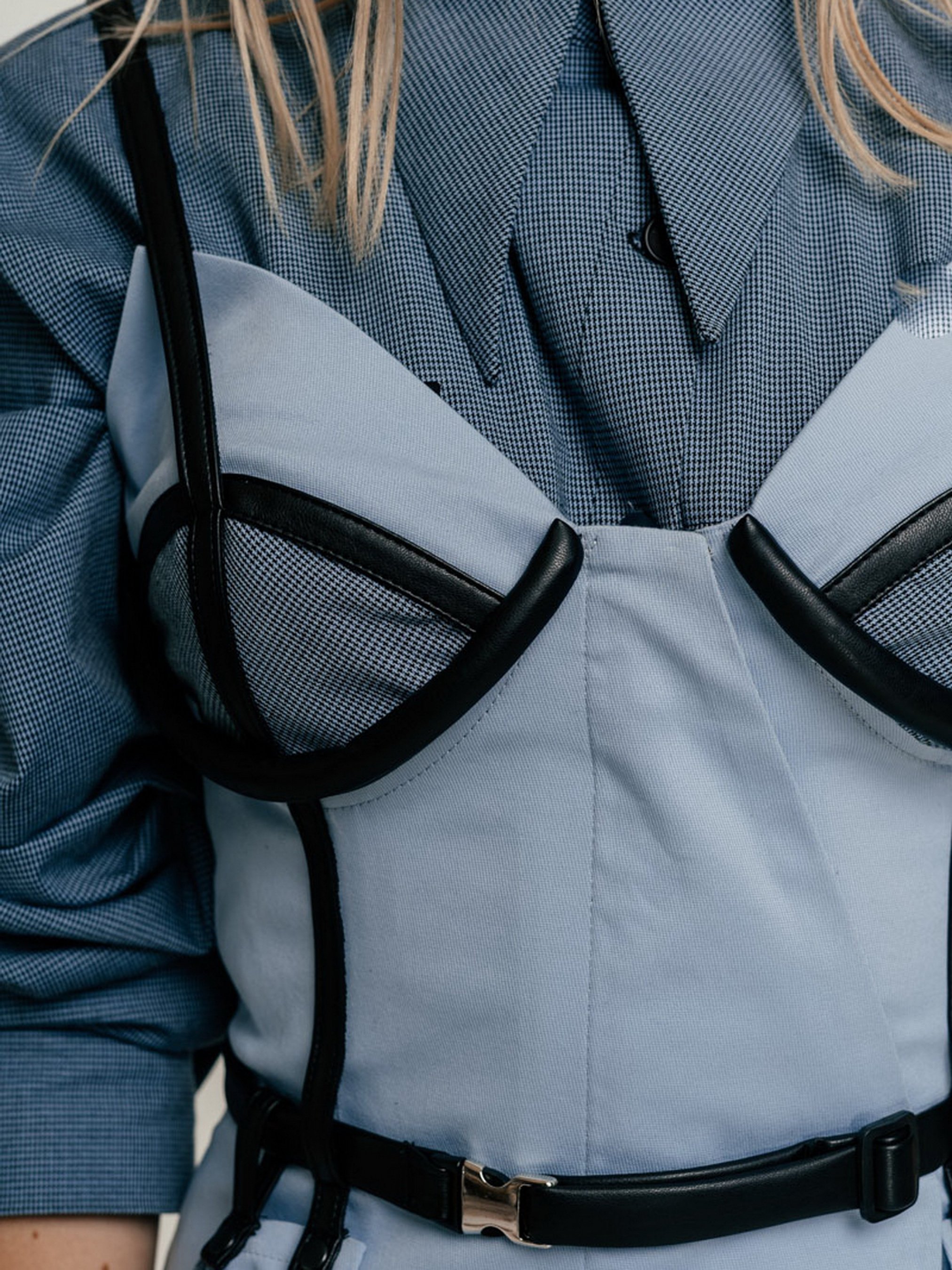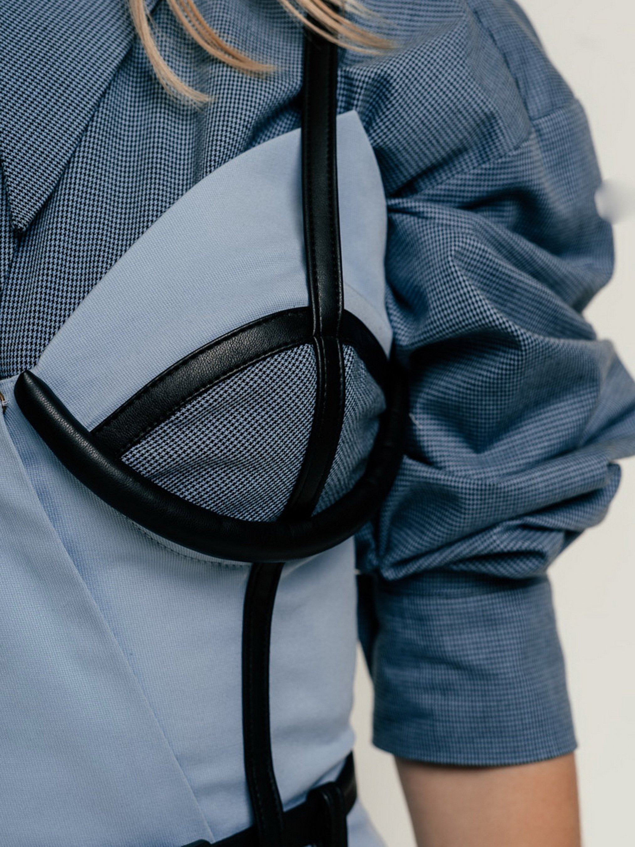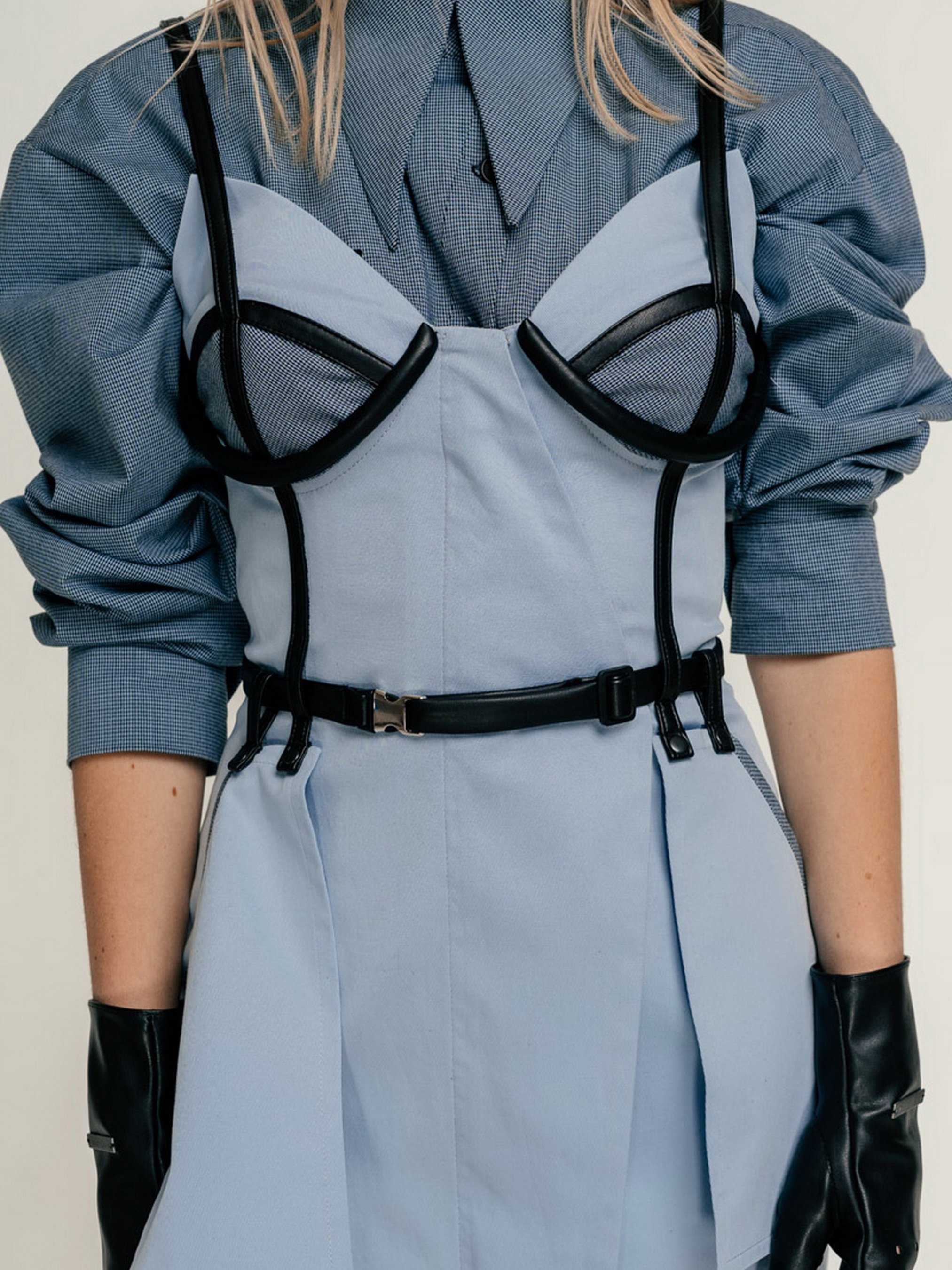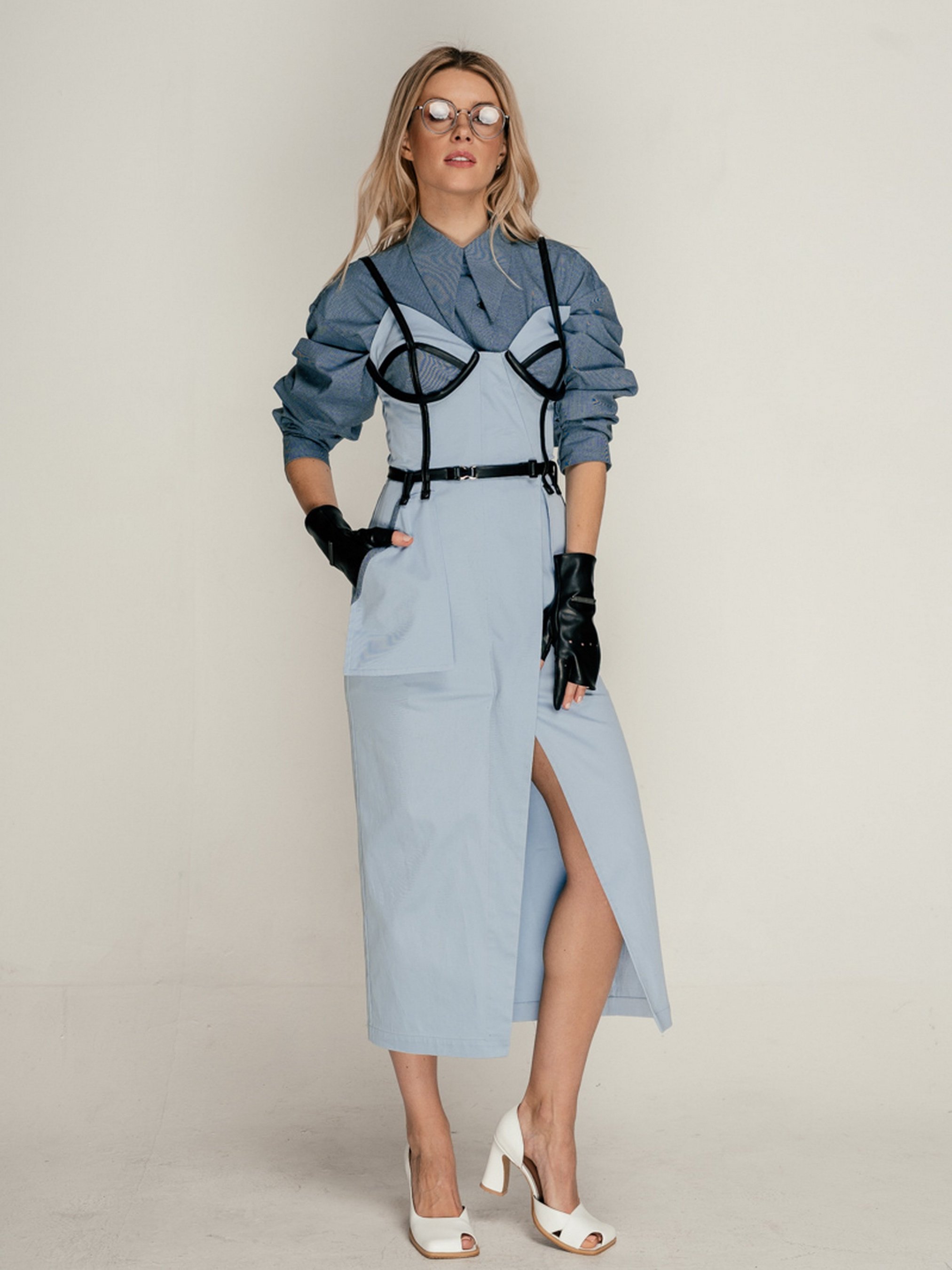 Сарафан приталеного силуету з чашками на кісточках, виконаний з платтяної тканини. Ассиметричная застібка попереду на замку. По ліфу чашки обробні смужки з веганської шкіри, які переходять у бретелі. Відлітні кишені тримаються на поясі.