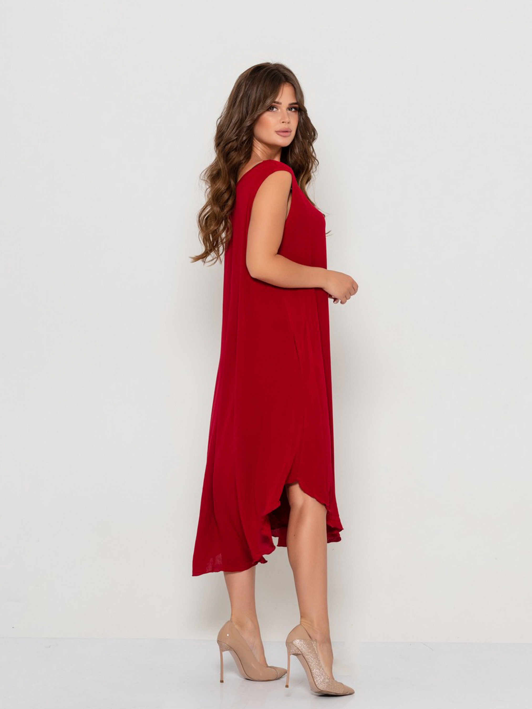 Літній сарафан виконаний з крепдешина з розкльошеним асиметричним вільним кроєм та заокругленими нижніми зрізами. Виріб без рукавів, міді довжини з зручними бічними кишенями і заглибленою горловиною-човником. Склад: 79% поліестер, 21% еластан. Розтяжність: груди: S (80), M (84), L (88), XL (92), талія: S (68), M (72), L (76), XL (80), стегна: S ( 150), M (154), L (158), XL (162), Довжина-94. рукав 58.