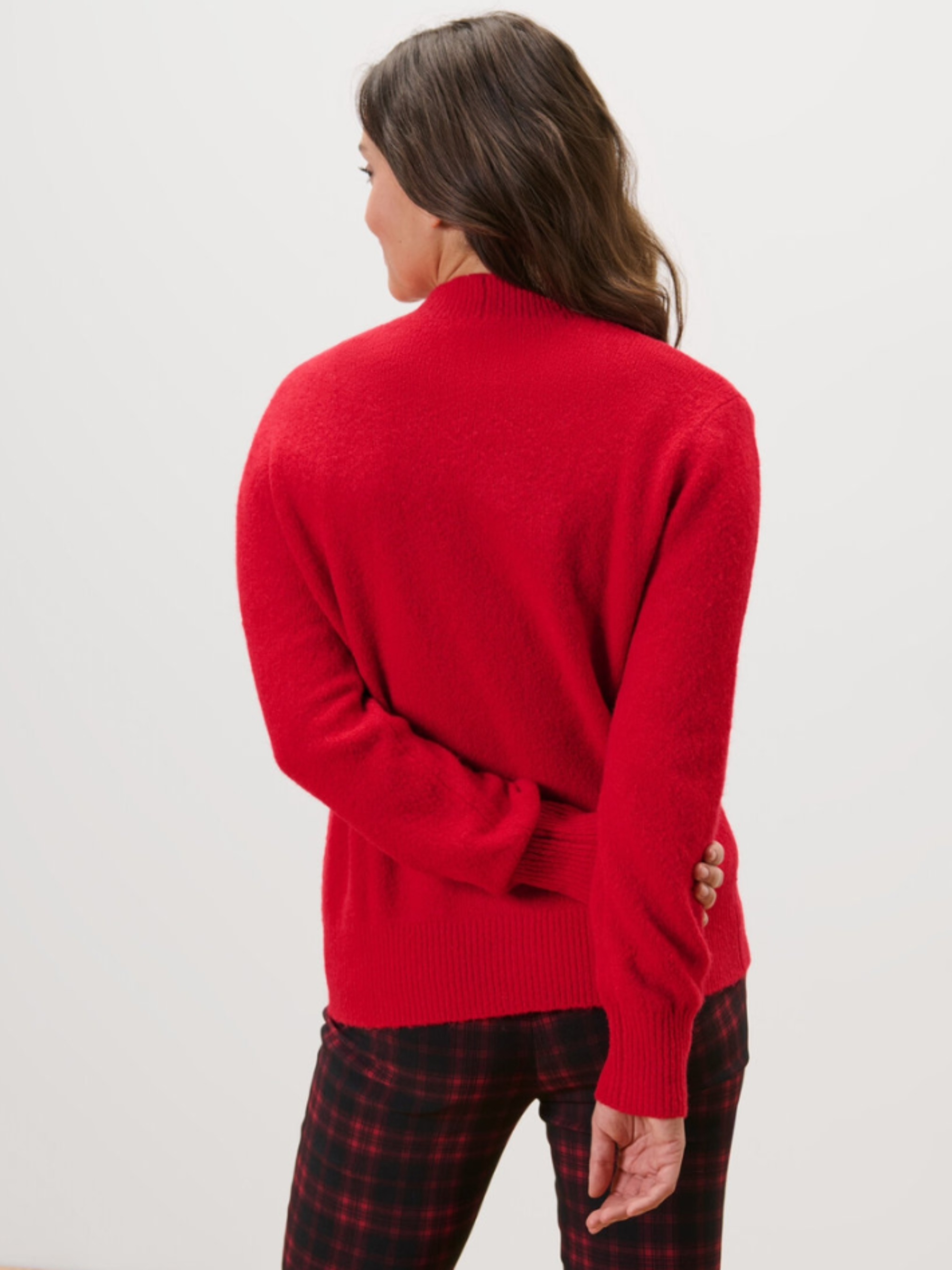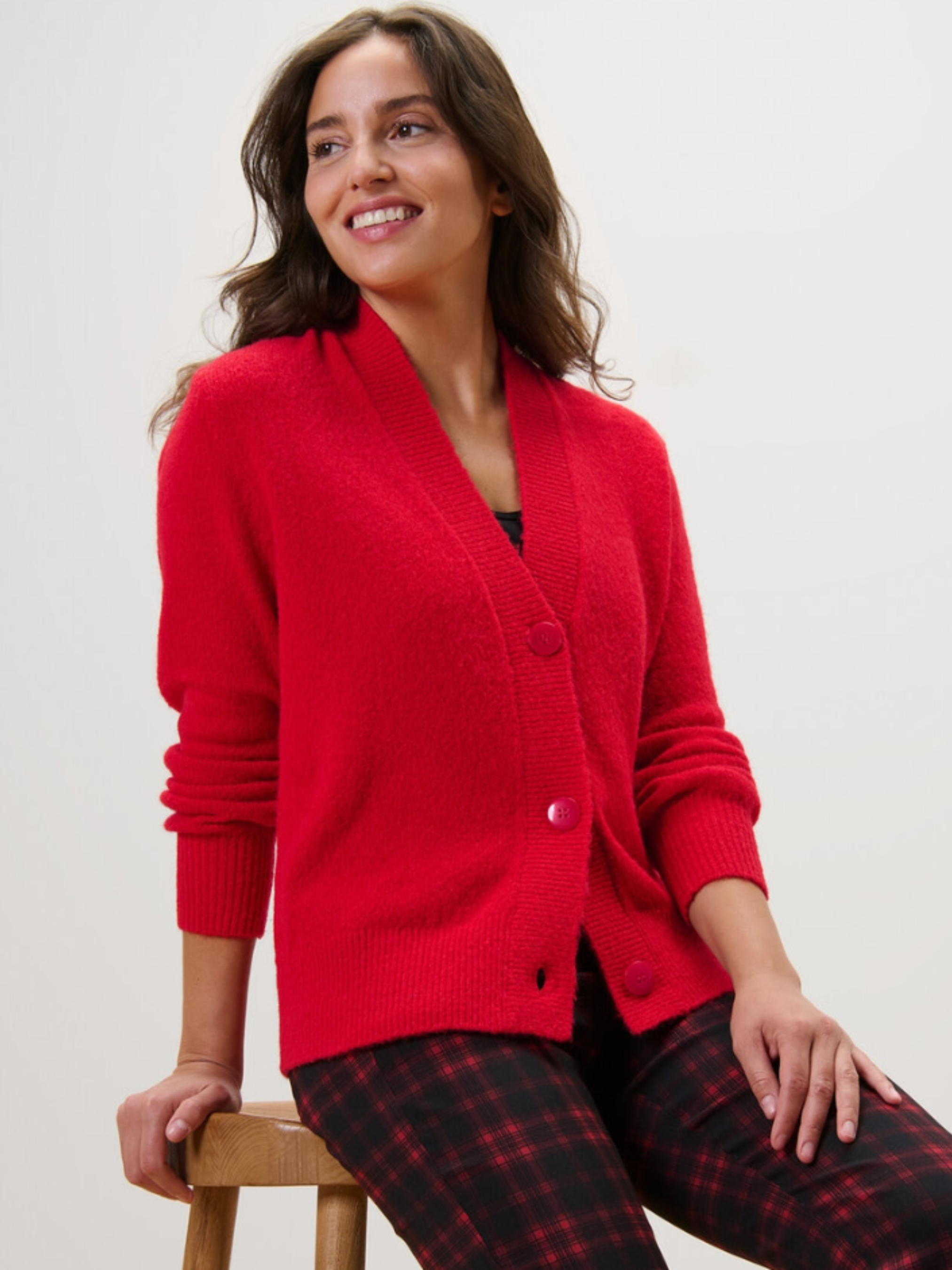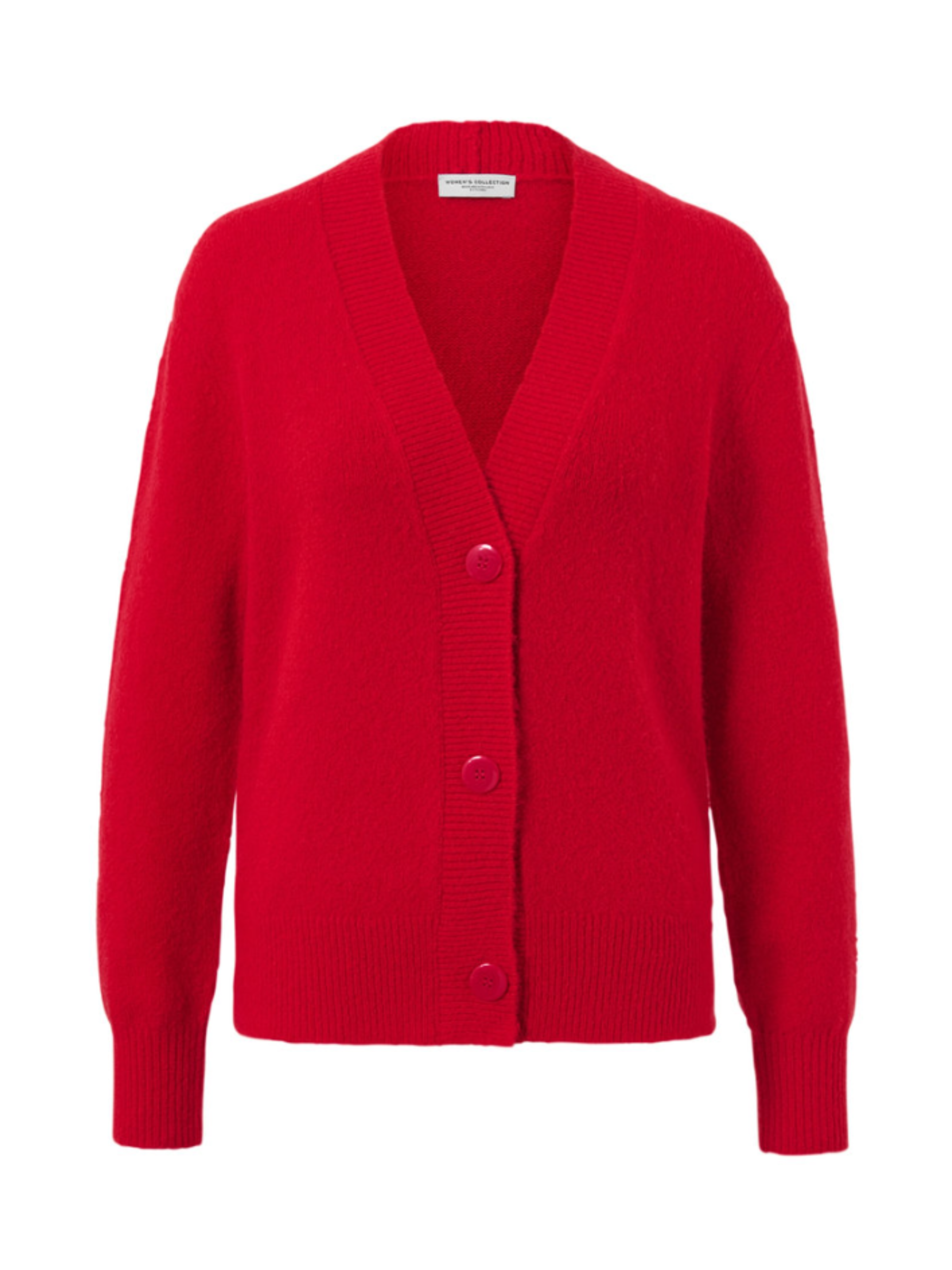 Кардиган із м’якої та теплої вовняної пряжі має приємну на дотик текстуру й забезпечує комфорт у прохолодну погоду. Модель виконана у класичному стилі з передньою планкою на ґудзиках і V-подібним вирізом, що робить її універсальною для поєднання з різними образами. Еластичні ребристі манжети на горловині, рукавах і подолі допомагають кардигану зберігати форму. Трохи спущені плечі й об’ємні рукави додають сучасного акценту, а волохата фактура надає м’якості та затишного вигляду. Завдяки наявності еластану кардиган добре тягнеться, не втрачає форму та зберігає первинний вигляд навіть після прання. Містить 18% вовни, сертифікованої за стандартом RWS (Responsible Wool Standard), що підтверджує етичне походження матеріалу. Колір: червоний Матеріал: 45% поліамід, 35% поліакрил, 18% вовна (RWS), 2% еластан Перевірено на наявність шкідливих речовин зовнішніми акредитованими інститутами. Розміри готового виробу: M/L (європейський 40–42 / український 46–48): ПОГ 56 см, довжина рукава 66 см, довжина 70 см. Одяг бренду Tchibo зазвичай не має паперових етикеток. У більшості випадків внутрішні бірки зі складом тканини, назвою бренду або розміром зрізані частково або повністю.