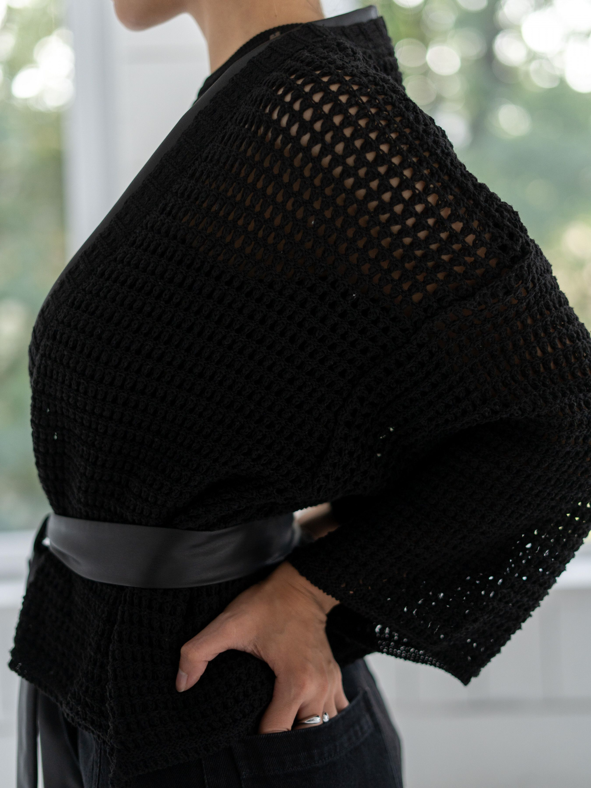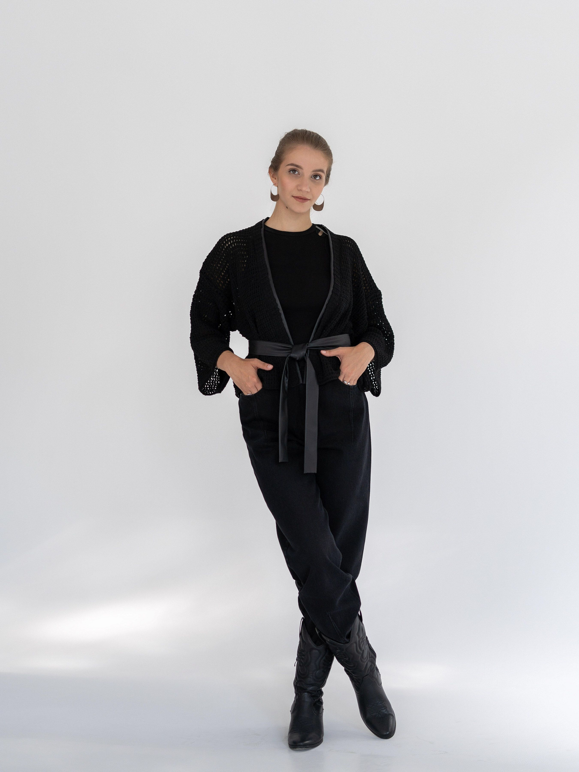 Кардиган кимоно з широкими рукавами три чверті, виготовлений із в'язаного чорного трикотажу, без застібки.
