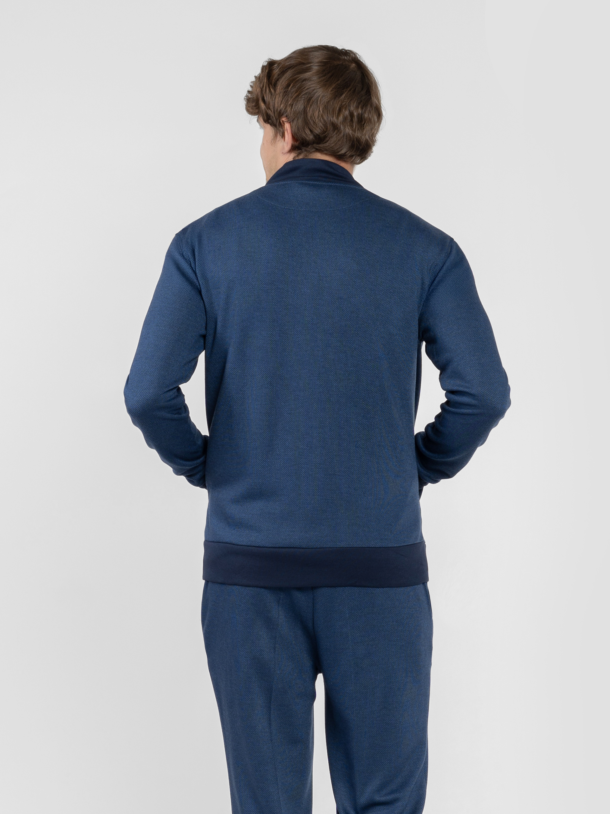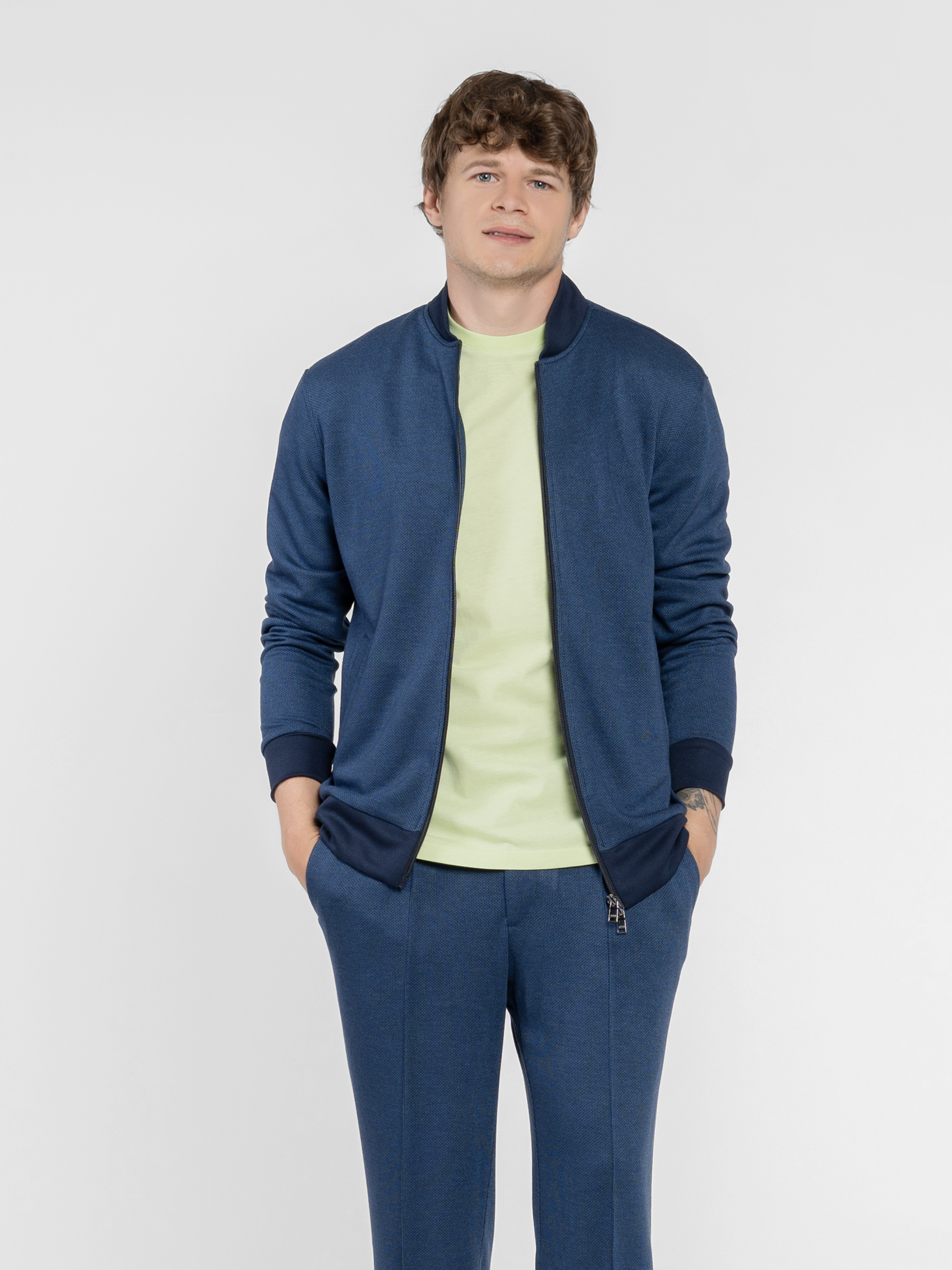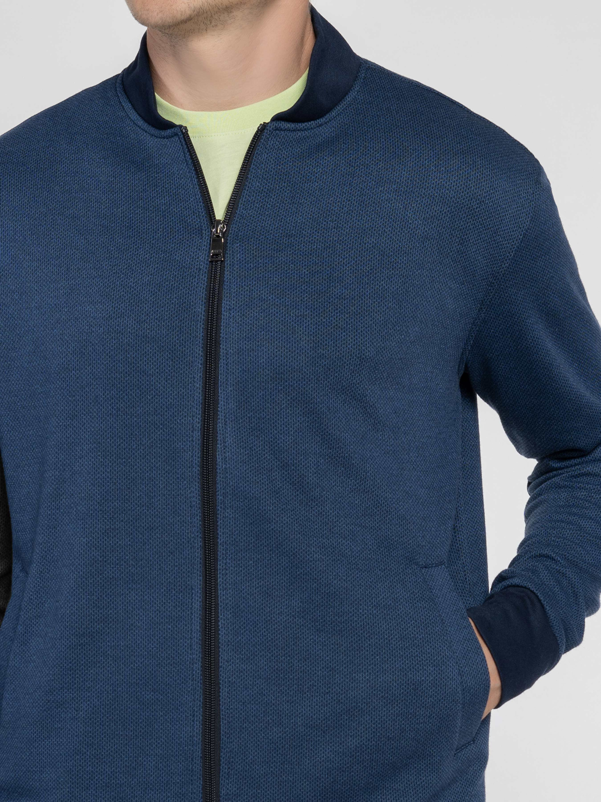 Чоловічий синій бомбер Arber виготовлений із м’якої трикотажної тканини з додаванням віскози, що забезпечує комфорт, еластичність і приємні тактильні властивості. Модель має застібку на блискавку, дві кишені та еластичні вставки на манжетах, комірі й понизу, які додають образу динамічності. Ідеально поєднується з брюками M01.31.09.511 з тієї ж тканини для створення стильного й зручного комплекту. Підходить для щоденних образів, вечірніх прогулянок і неформальних зустрічей. Модель на фото у розмірі 48. Зріст: 183 см. Параметри: 97/86/96