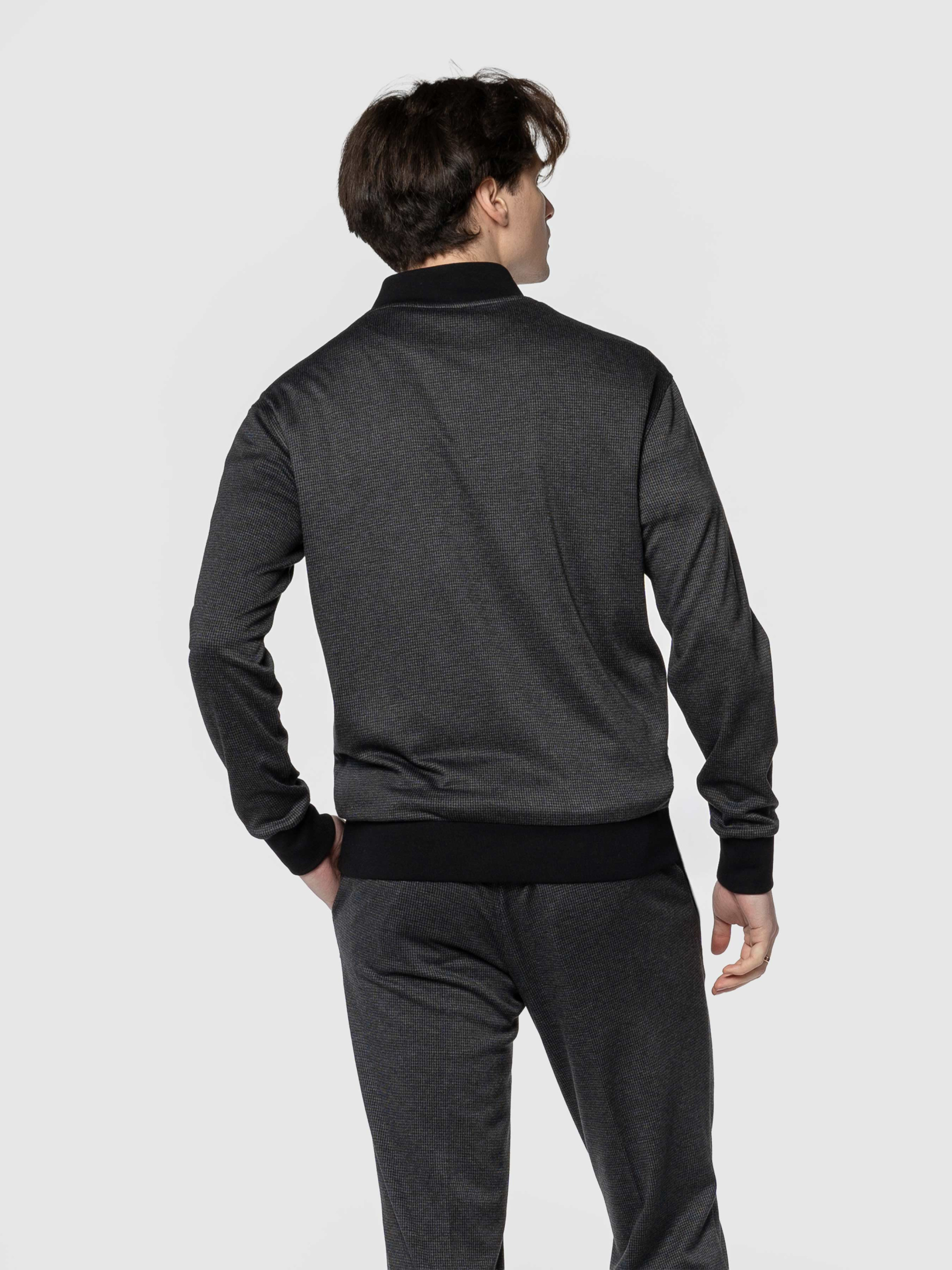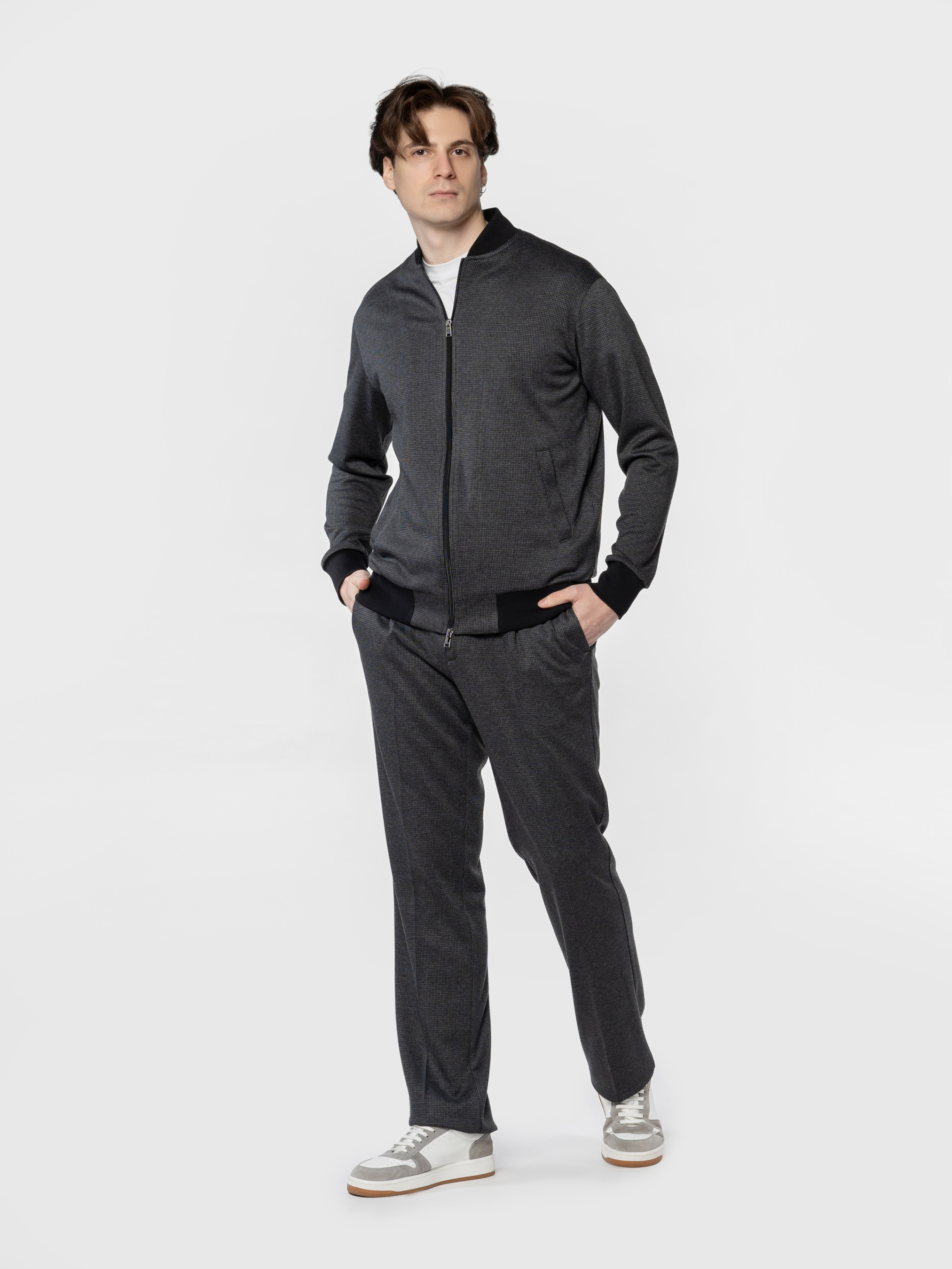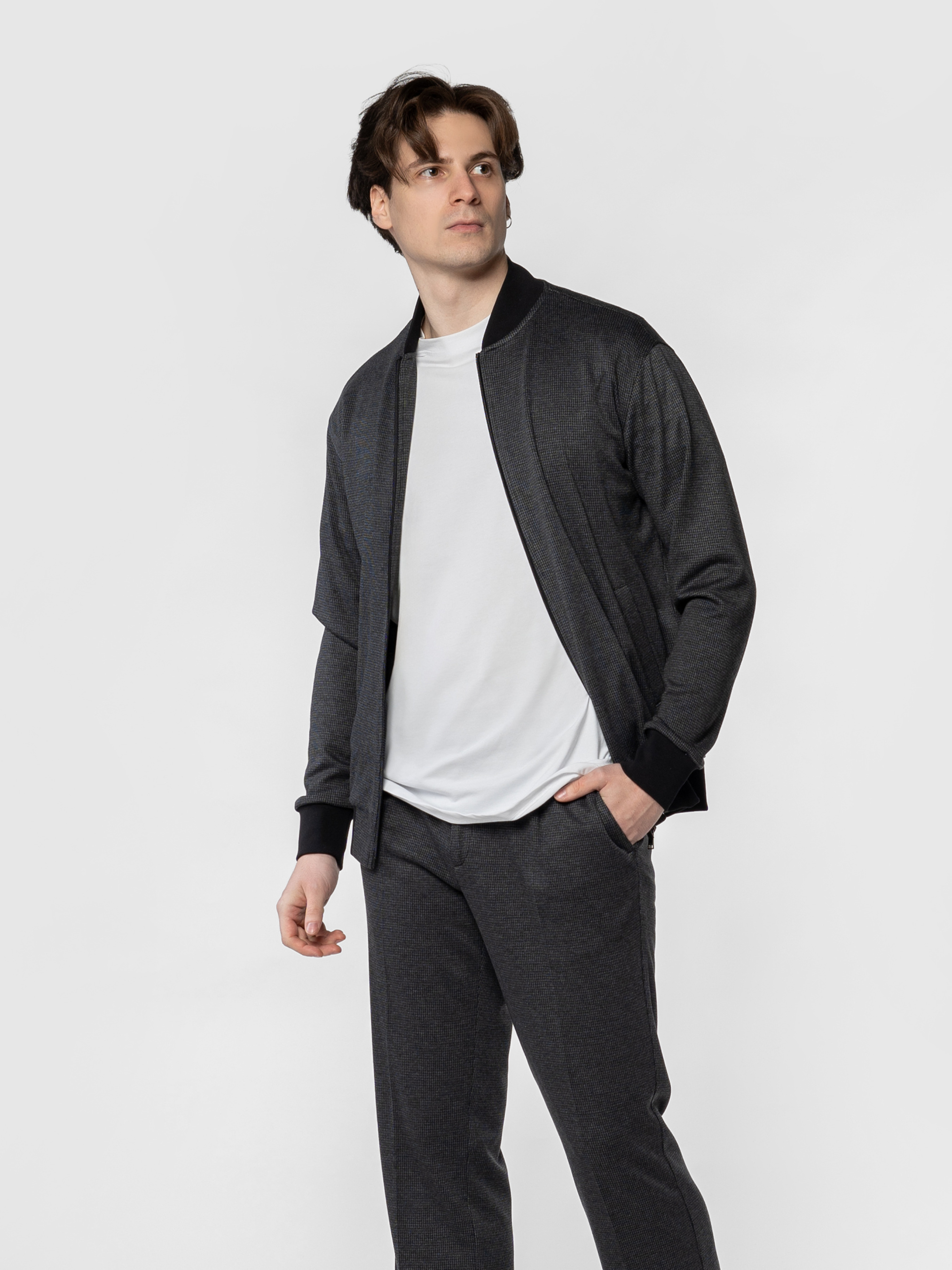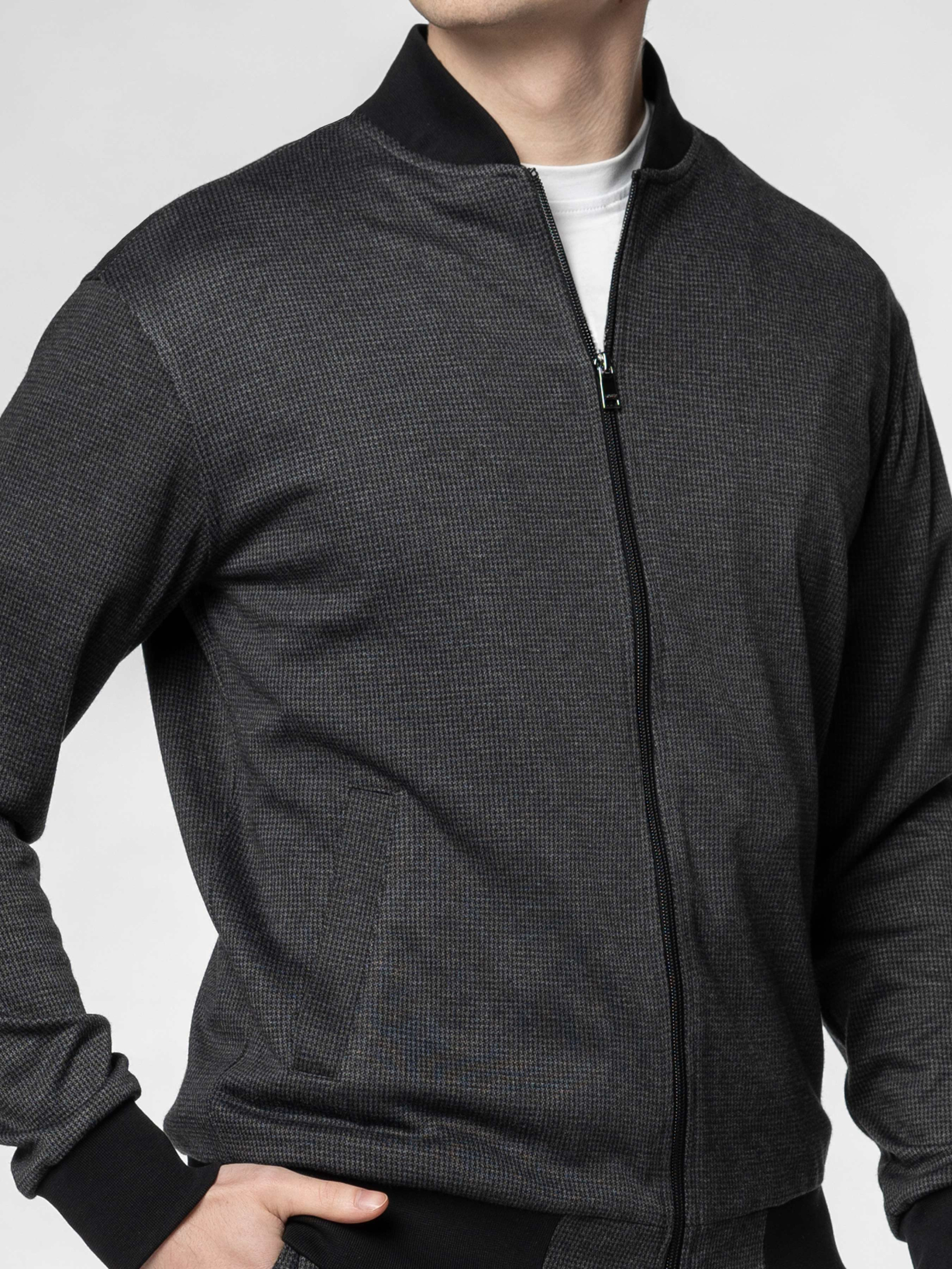 Чоловічий темно-сірий бомбер Arber з еластичного трикотажу на основі бавовни та віскози. М’яка, приємна на дотик тканина дихає, не мнеться, стійка до забруднень і забезпечує свободу рухів. Застібка на блискавку, дві кишені та еластичні вставки на манжетах, комірі й понизу додають комфорту й динаміки образу. Ідеально поєднується з брюками або джинсами для невимушеного повсякденного образу. Модель на фото у розмірі 48. Зріст: 185 см. Параметри: 103/78/100