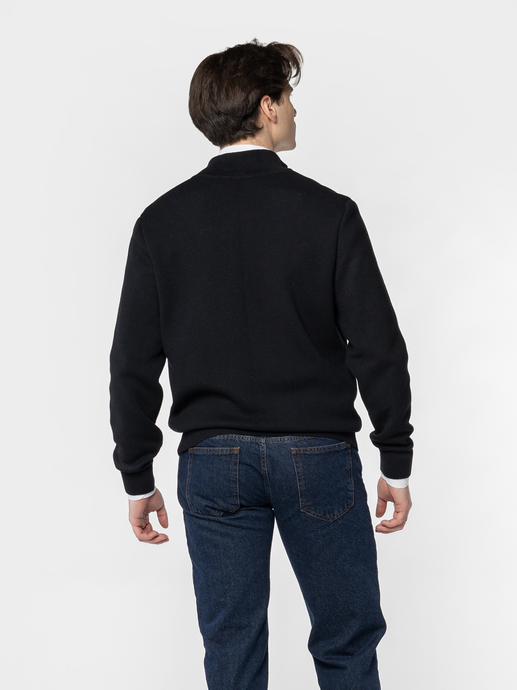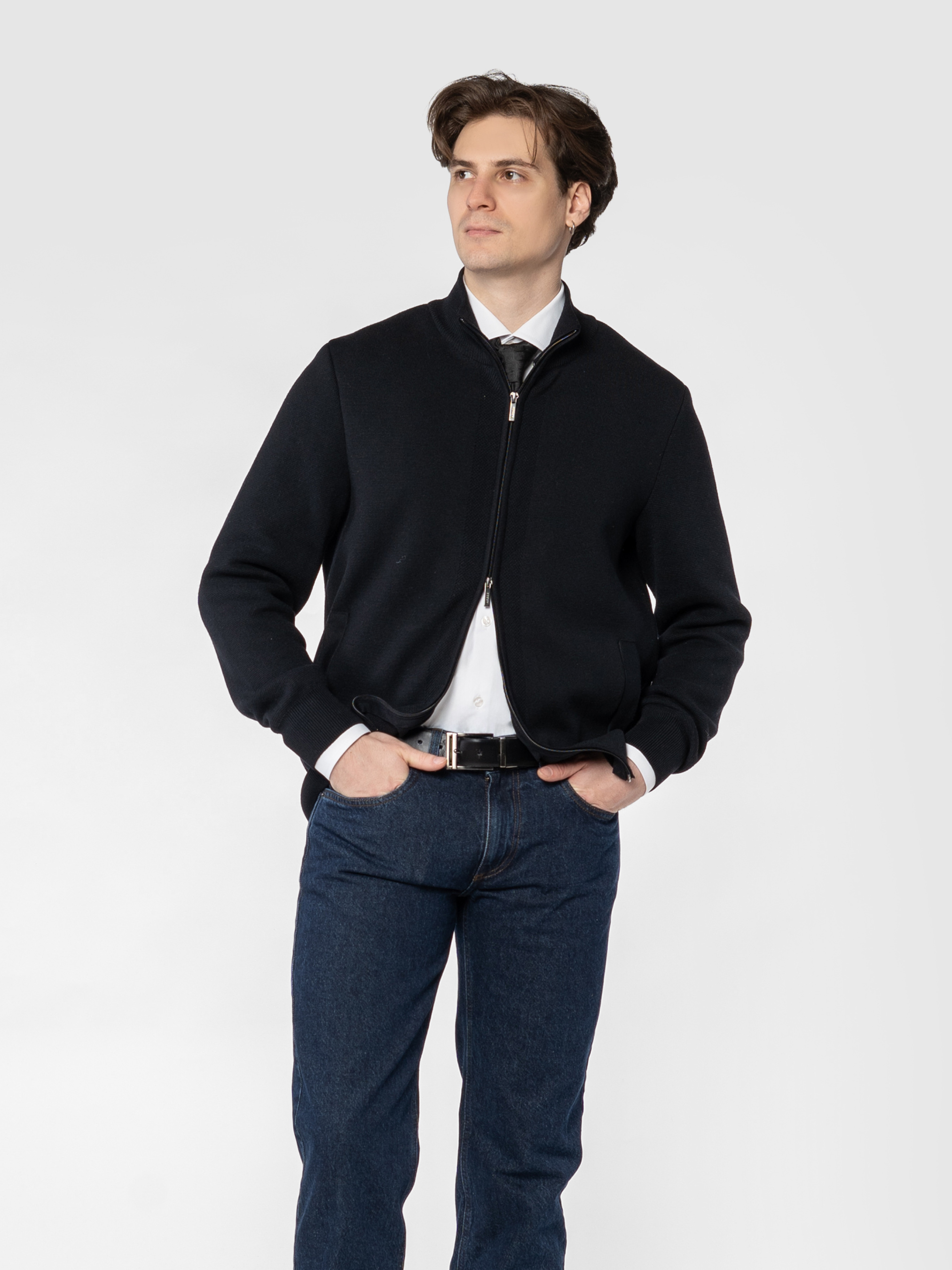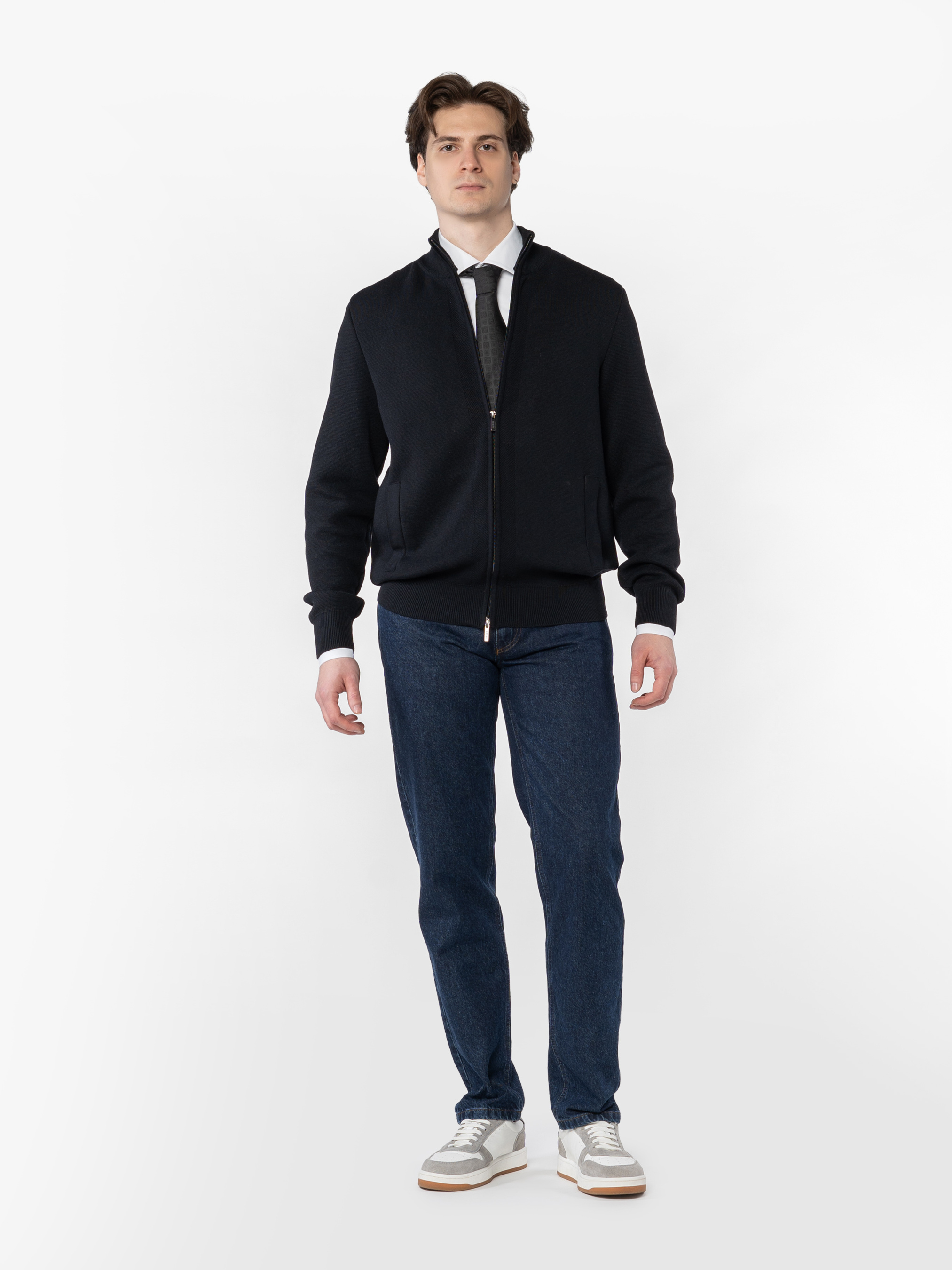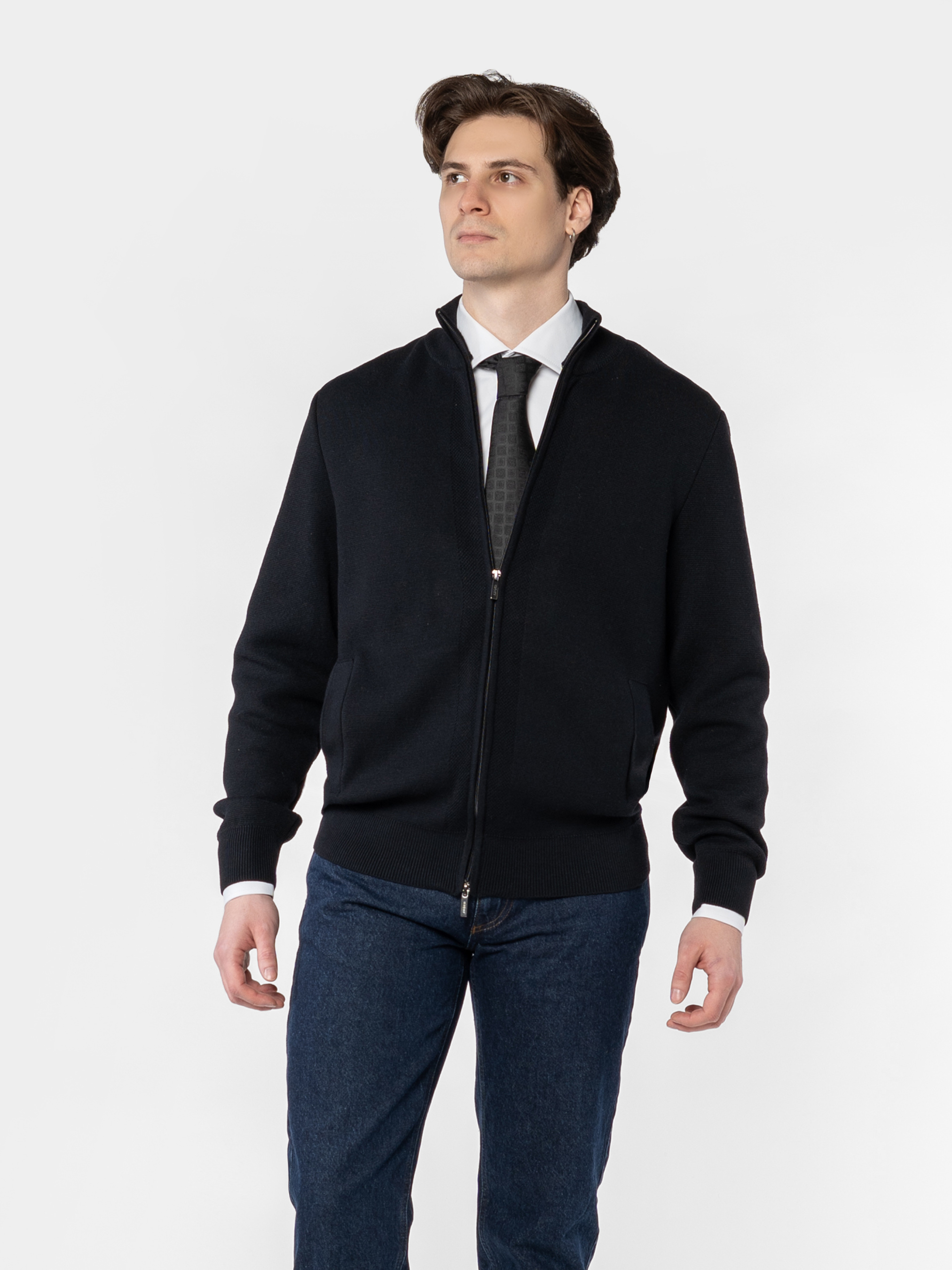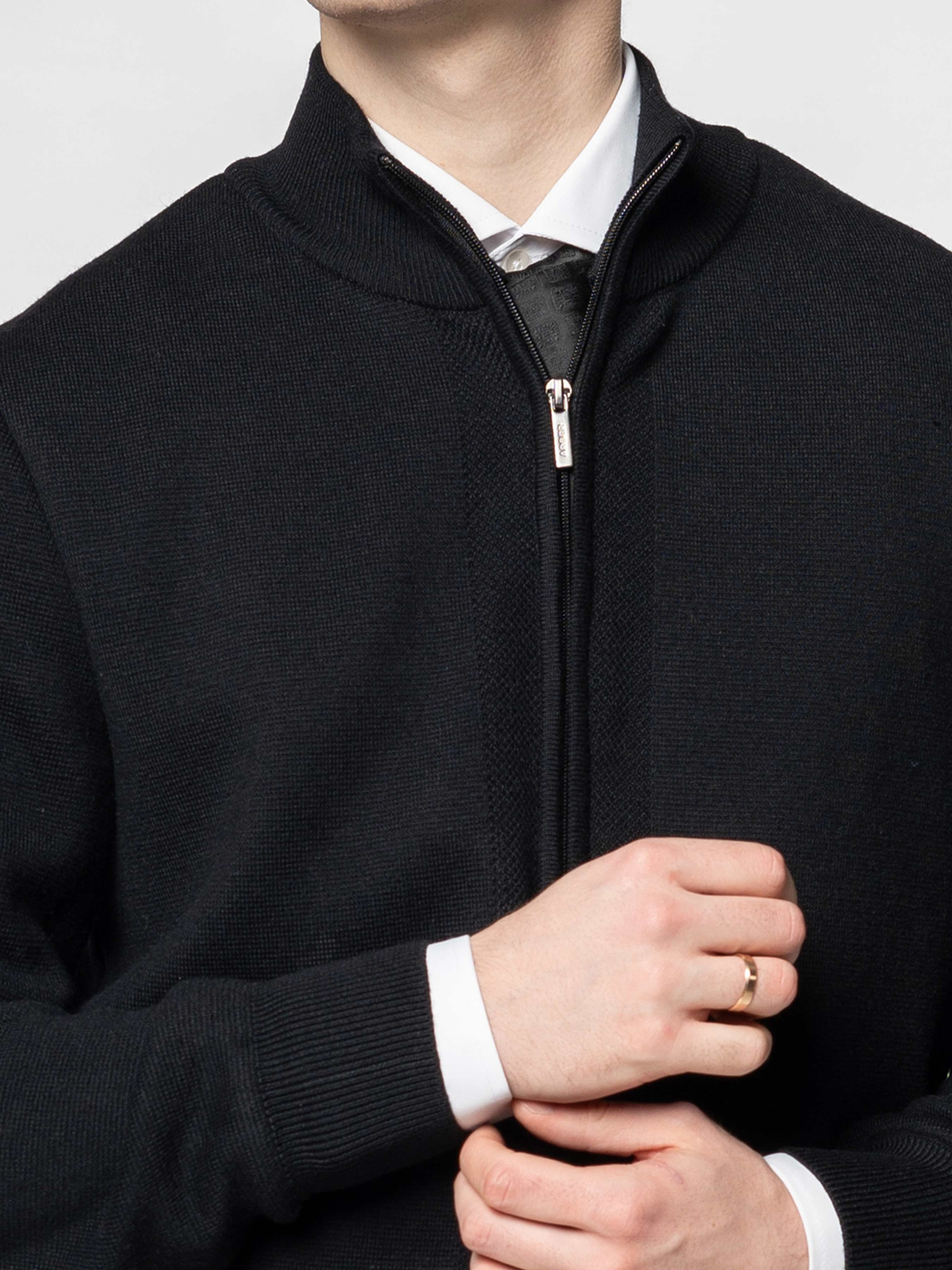 Чоловіча чорна кофта Arber на блискавці, створена з пряжі з додаванням волокон високоякісної меріно вовни з добавкам від відомого італійського виробника Miroglio, виріб м'який та приємний на дотик. Модель напівприлеглого силуету з високим коміром стійка. Кофта чудово поєднується як джинсами, так і з брюками. Універсальний чорний колір гармонійно доповнить гардероб сучасного чоловіка в поєднанні з брюками або джинсами. Модель на фото у розмірі 48. Зріст: 185 см. Параметри: 103/78/100.