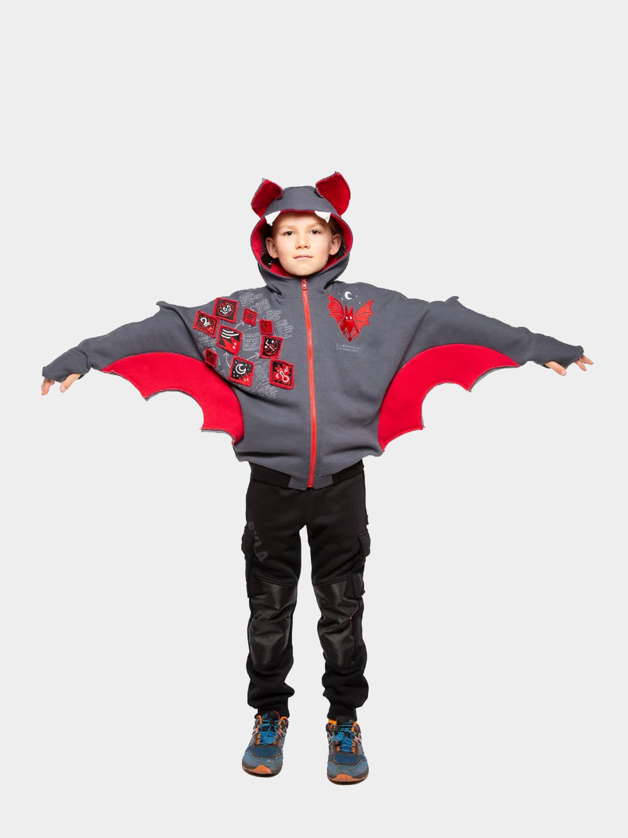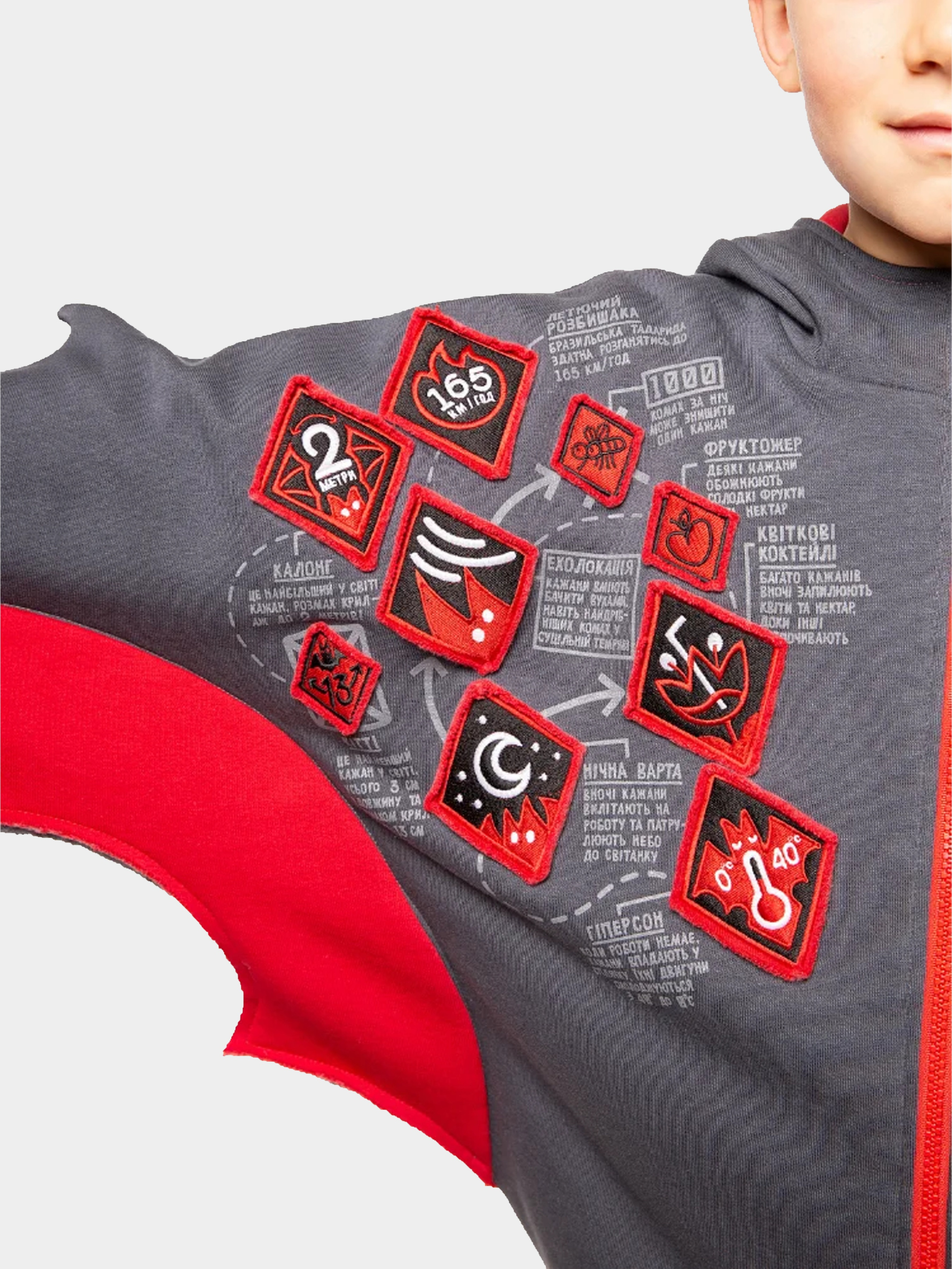 Перший з серії “Досліджуй завжди” — Кажан. То дуже цікава летюча тварина; а для нас — абсолютно фантастичне та надзвичайне дитяче худі. Таке, яке розповість про кажанів все найцікавіше. На грудях — купа нашивок, яка розкриває всю правду про кажанів: який кажан найбільший у світі, а який найменший; який найшвидший у світі, скільки й чого (чи кого) їсть, як спить та як полює… ліворуч на грудях — власне вишитий кажан. Але і це ще не все: капюшон — то справжня кажаняча печера, де повно принтованих кажанчиків, що дрімають. А сам капюшон має вуха та навіть вампірські ікла. Тому дітки можуть самі почутися малими кажанятами. Варто лиш розправити руки, і вони стануть крилами, ну а капюшон доповнить образ) Пасує як хлопчикам, так і дівчаткам.