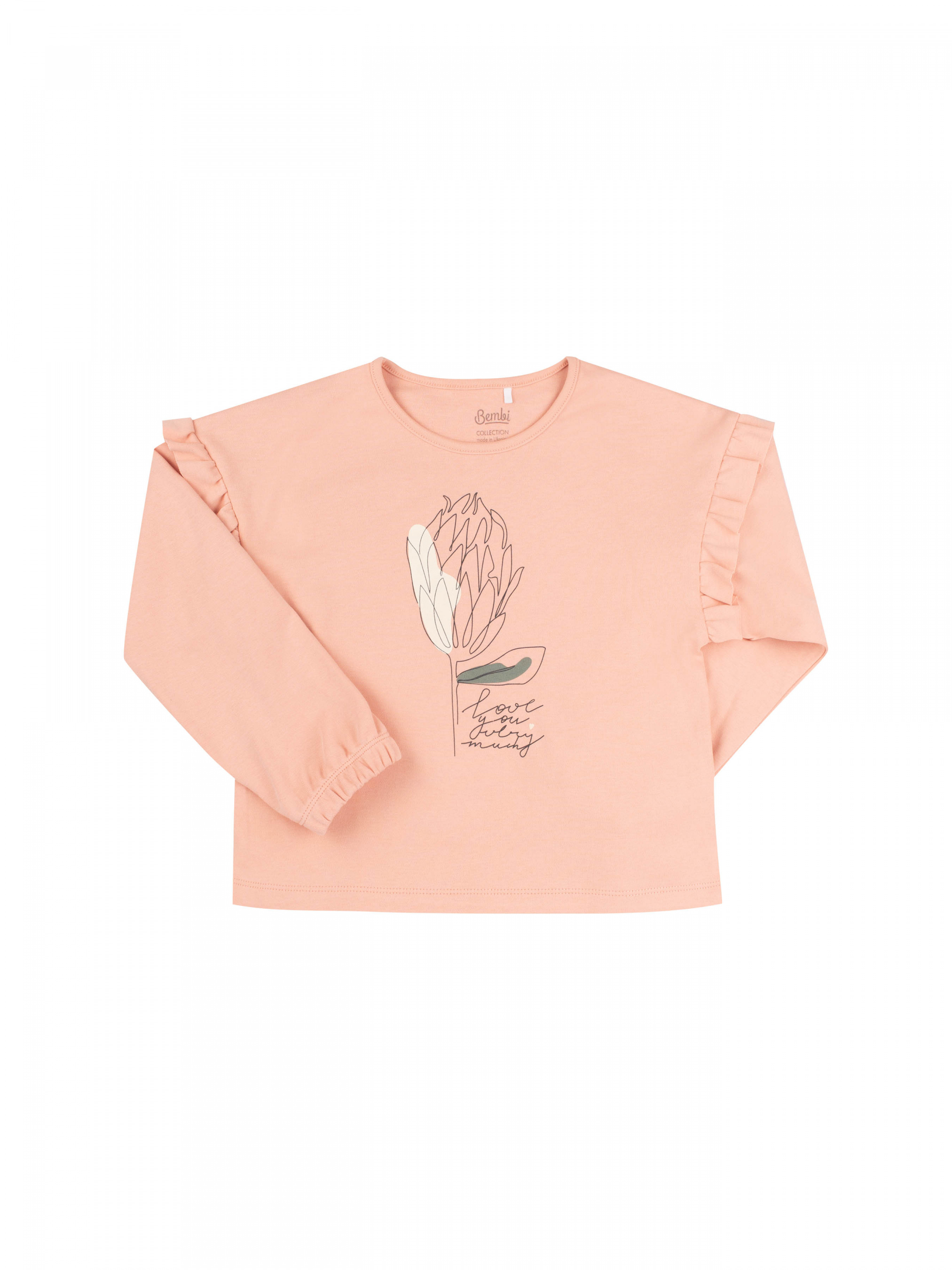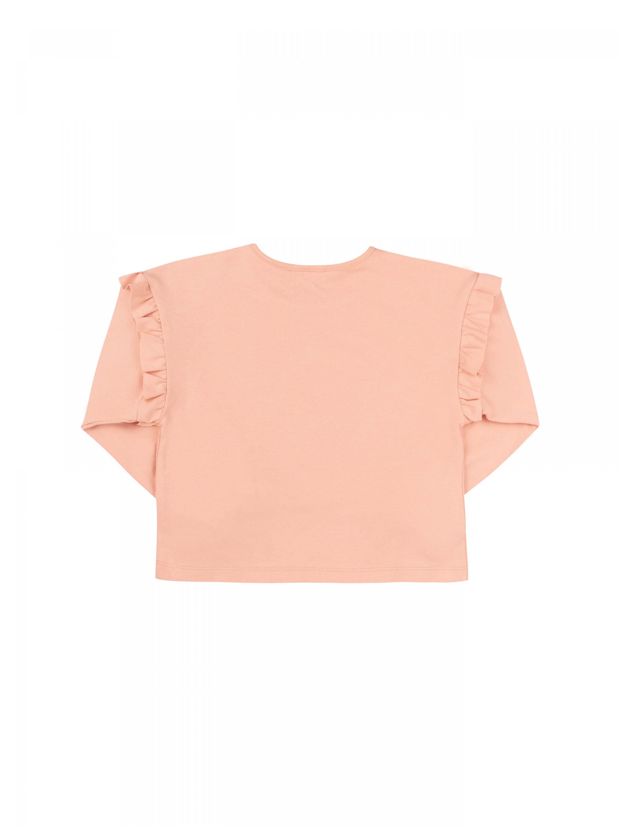 Світшот вільного крою для дівчинки. Рукав довгий широкий, внизу фіксується резинкою. Верхній зріз рукава прикрашений рюшею. Горловина кругла. На моделі з однотоної тканини лаконічний друк.
