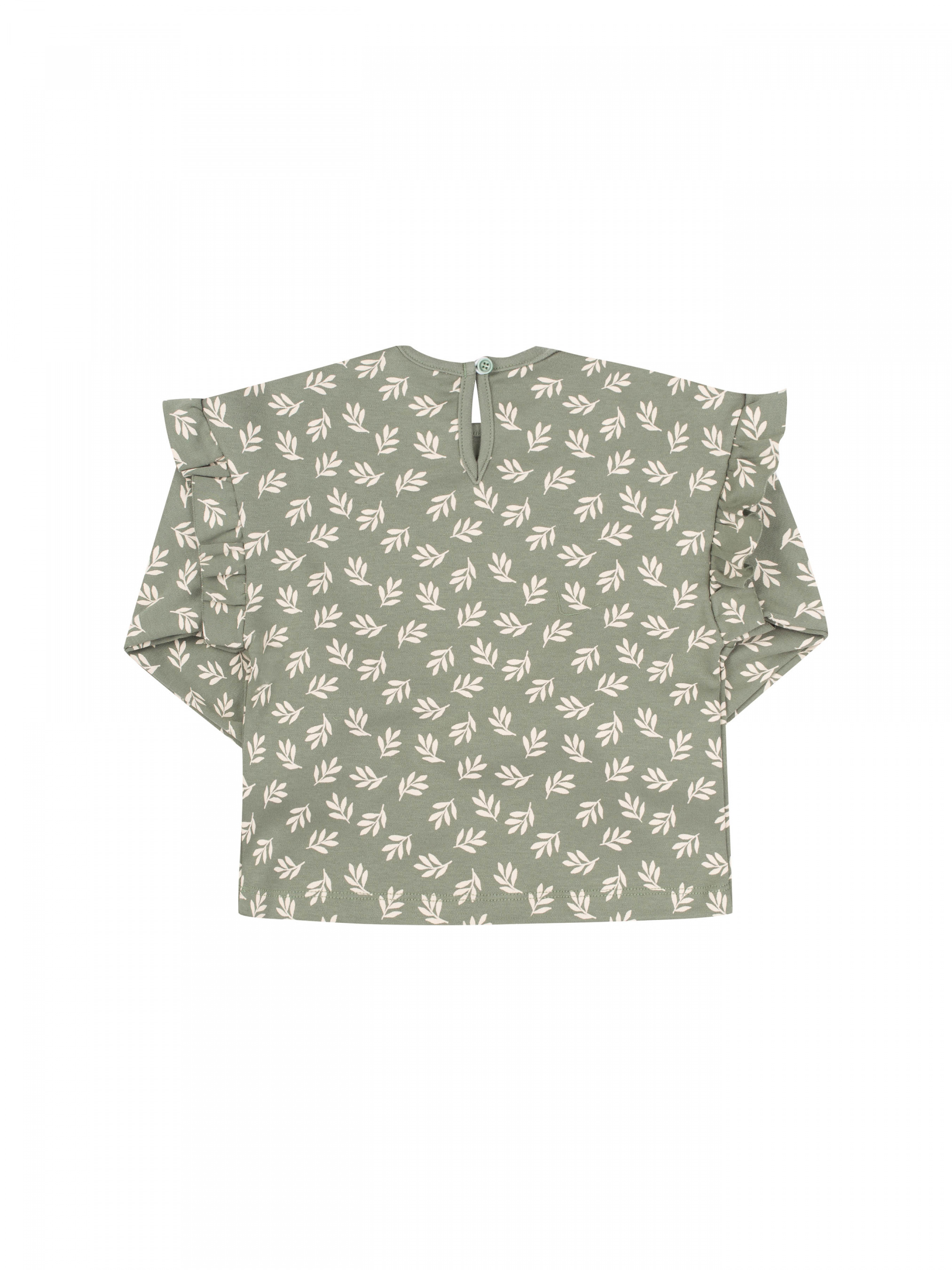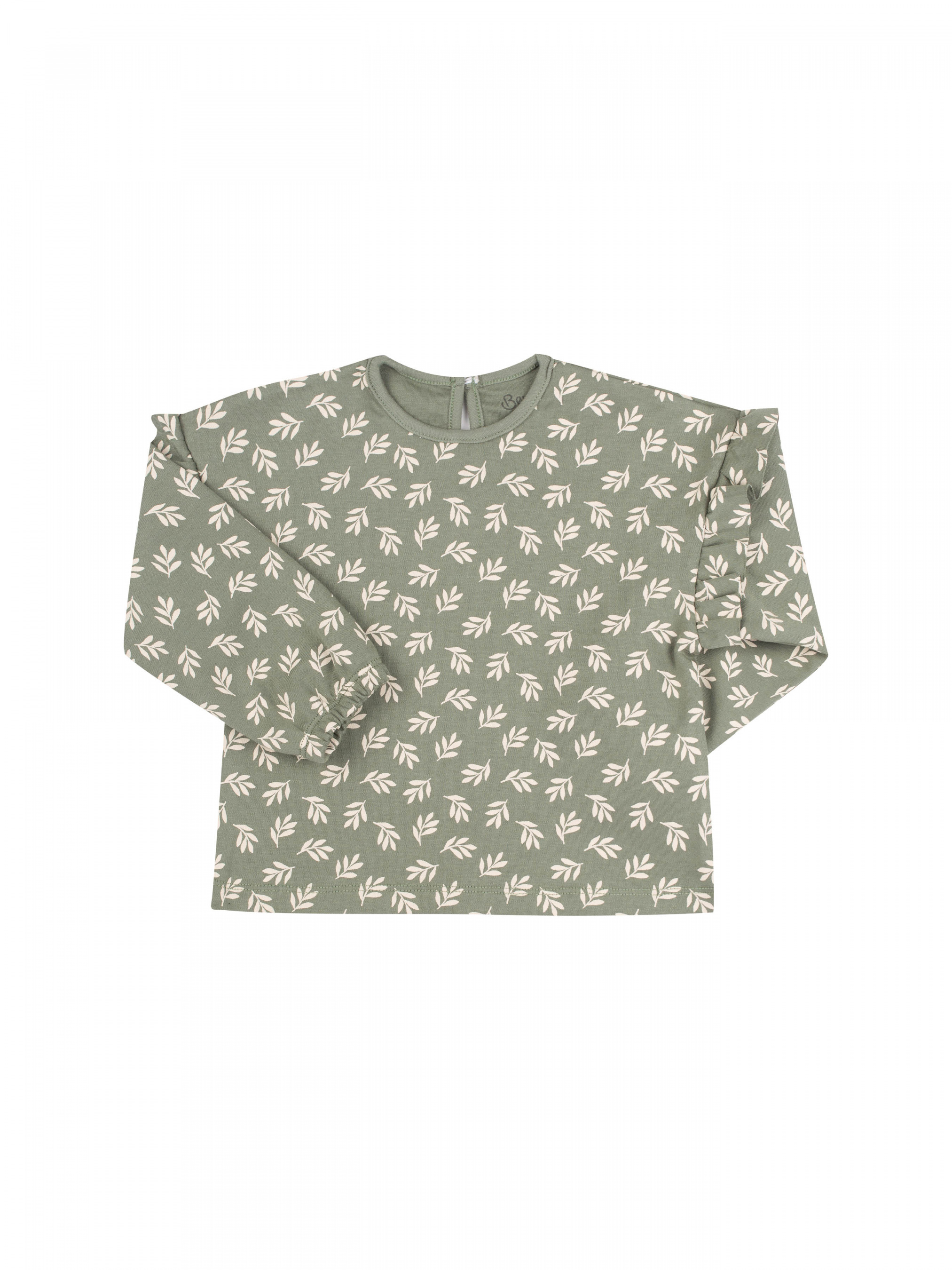 Лонгслів вільного крою для дівчинки. Рукав довгий широкий, внизу фіксується резинкою. Верхній зріз рукава прикрашений рюшею. Застібається ззаду на ґудзик. На моделі з однотоної тканини лаконічний друк.