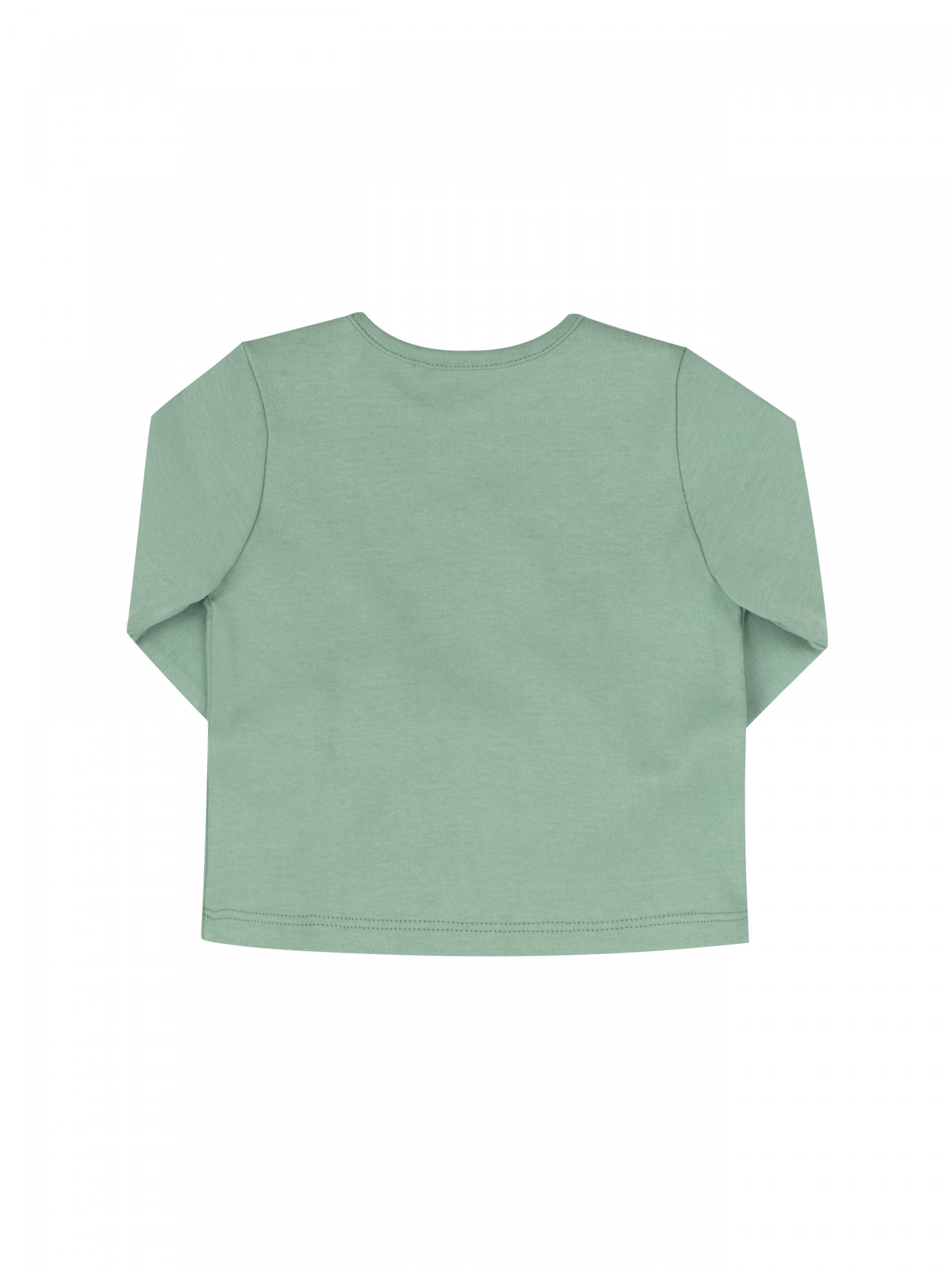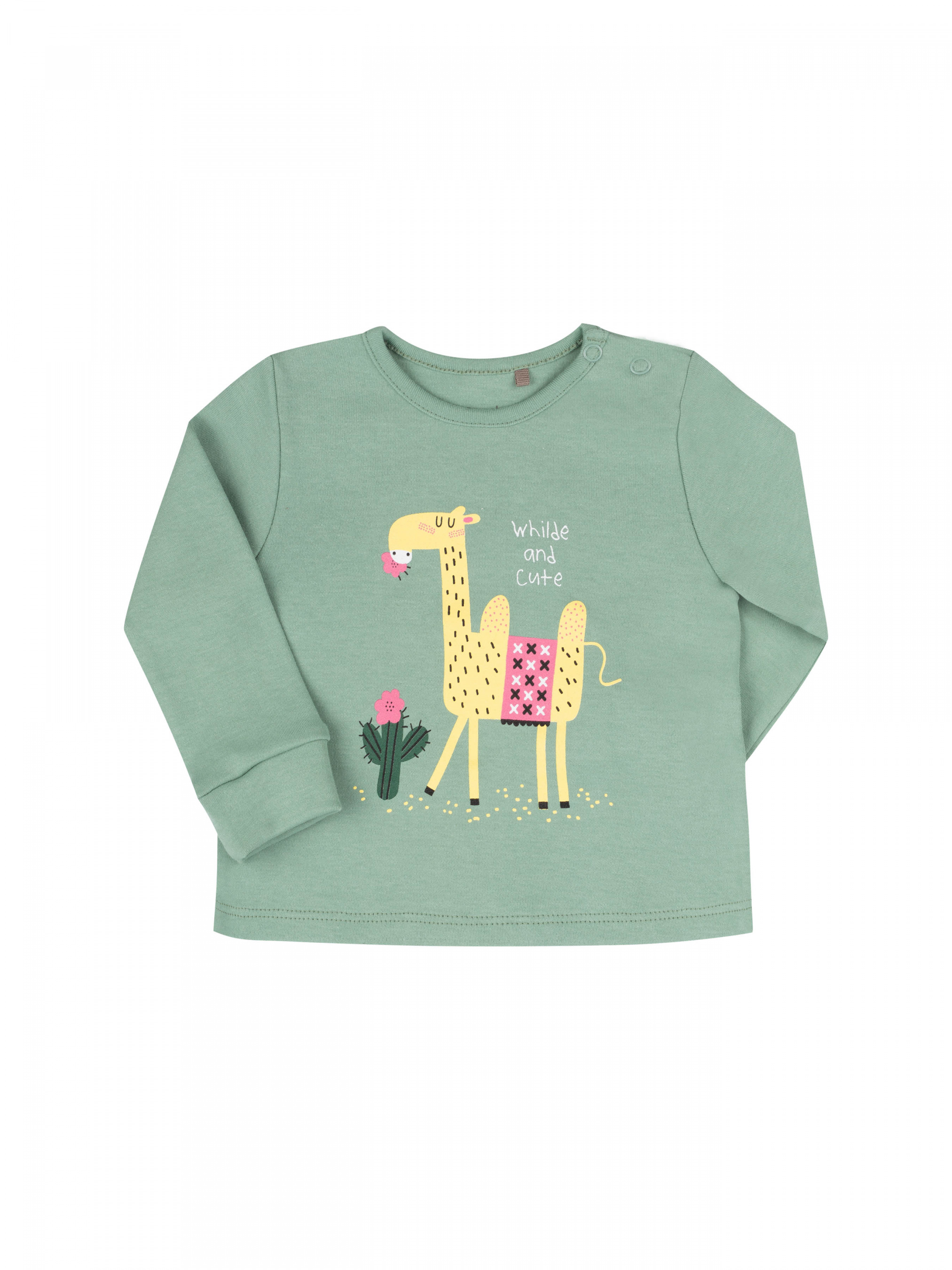 Лонгслів для дівчинки. Рукав довгий вшивний на манжеті. Горловина кругла. На плечі застібається кнопками. Спереду друк.