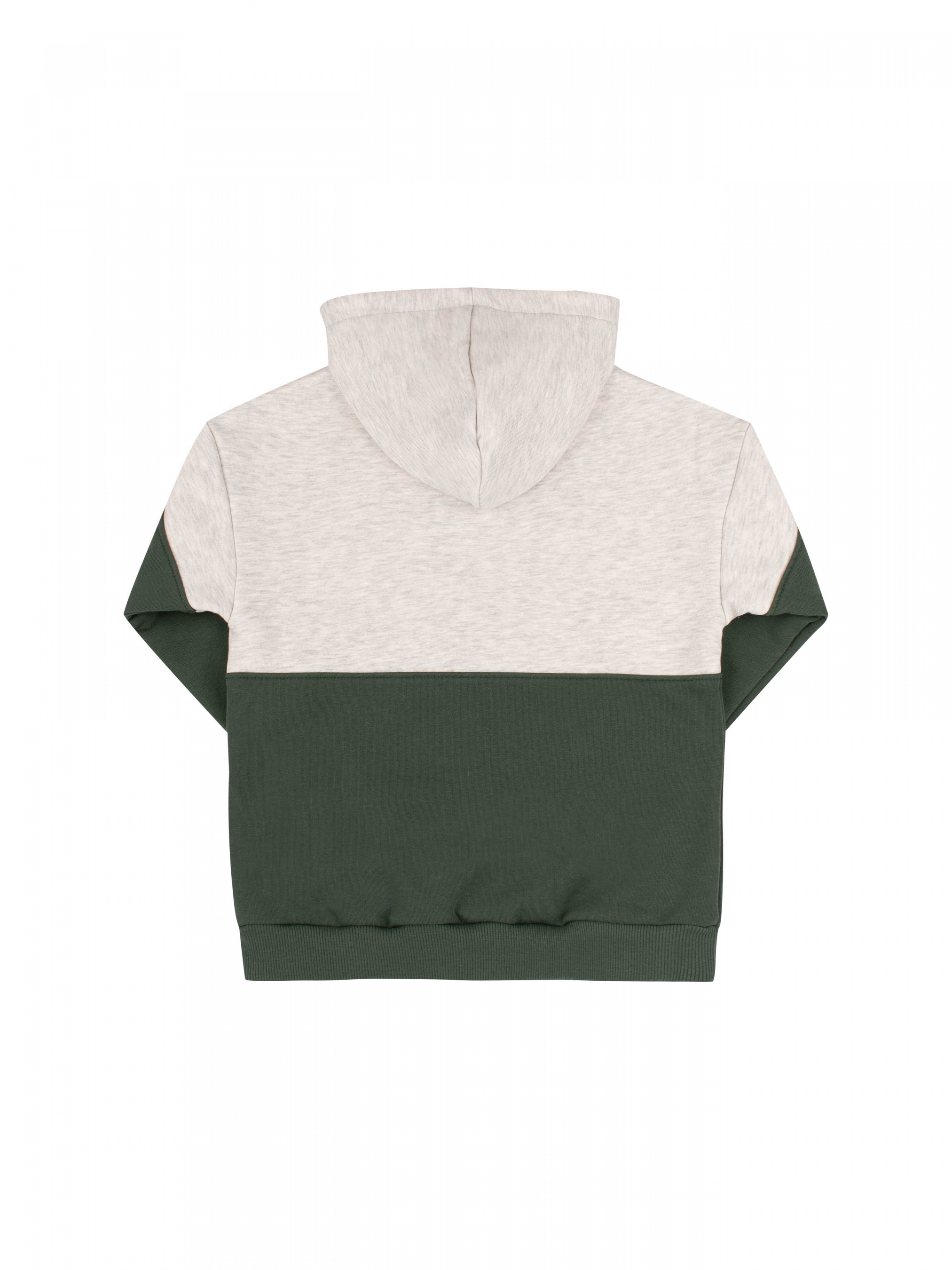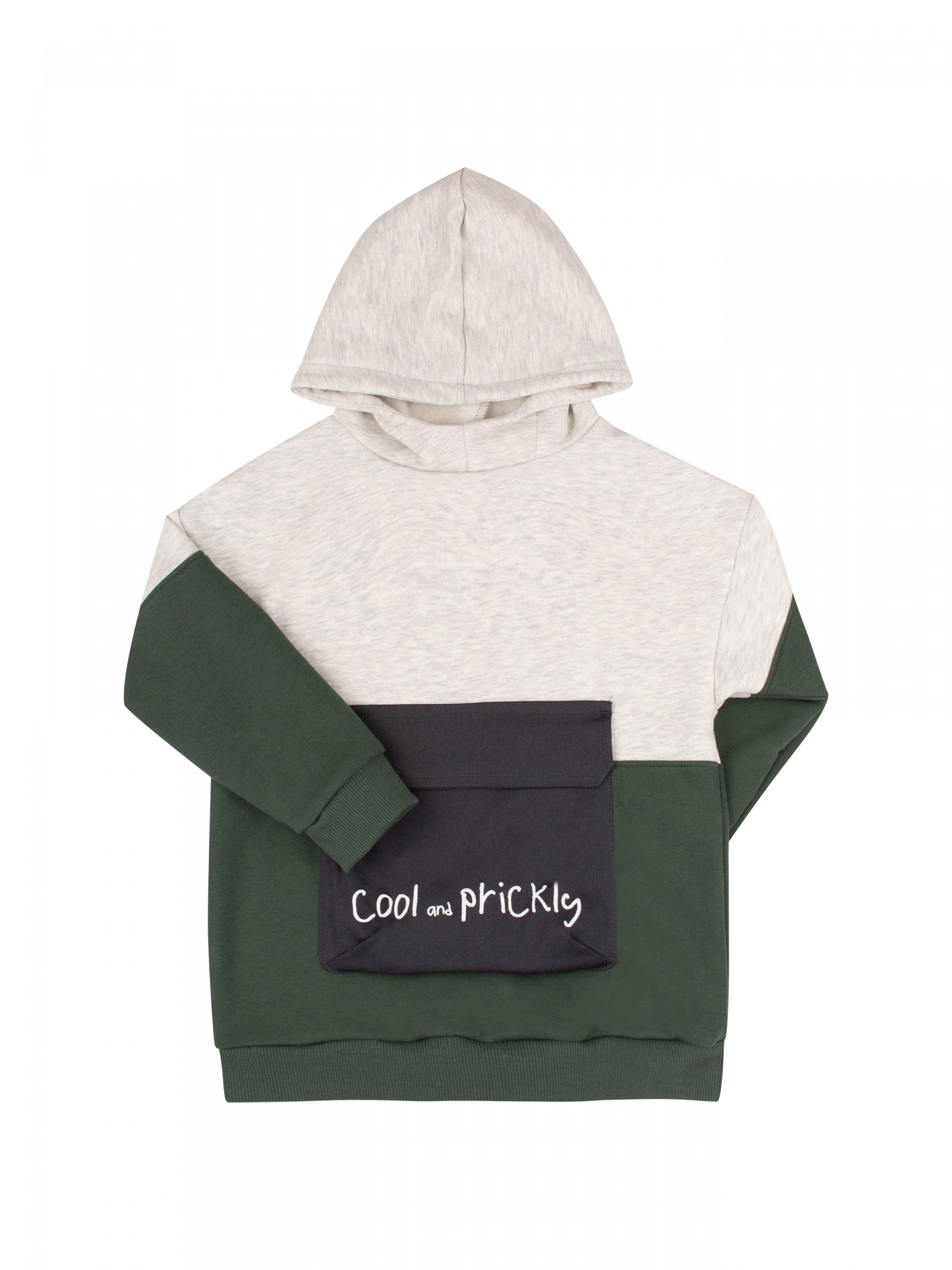 Джемпер комбінований з каптуром. Виготовлений з м"якого трикотажу утепленого флісом. Модель вільного крою, середньої довжини.. Рукав довгий, на манжеті. Низ джемпера та манжет рукава з качкорси. Спереду об"ємна кишеня з друком та клапаном на липучці.