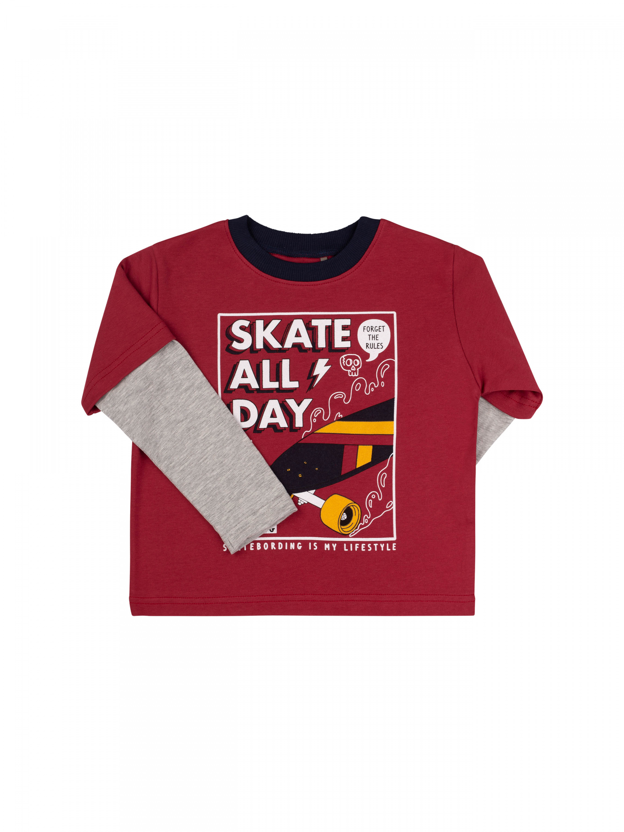 Світшот для хлопчика з імітацією подвійного рукава. Рукав довгий прямий. Горловина кругла, оброблена качкорсою. Спереду великий яскравий друк.