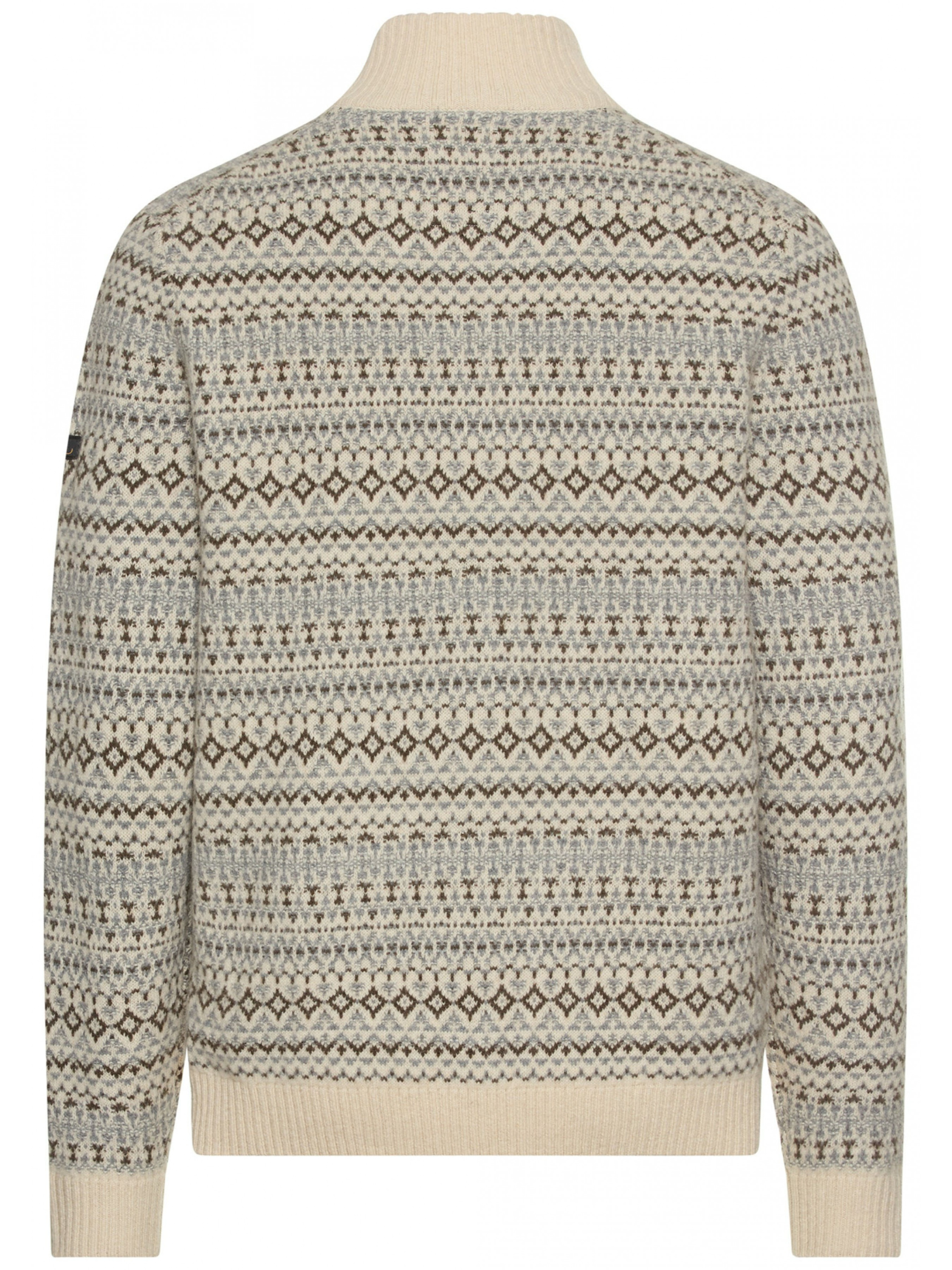 Светр knitted Troyer із вовни поєднує у собі традиційний дизайн і сучасний комфорт. Завдяки натуральному складу він чудово регулює температуру тіла: у холодну пору дарує приємне тепло, а в теплі дні забезпечує відчуття свіжості та прохолоди. Ця властивість робить модель універсальною для будь-якої пори року, надаючи відчуття максимального комфорту у різних умовах. Довгі рукави та високий комір із застібкою-напівблискавкою додають функціональності, дозволяючи змінювати стиль та ступінь захисту від вітру й прохолоди. Ребристі манжети та нижній край забезпечують надійну посадку, зберігаючи форму навіть після активного використання. Особливу виразність светру надає принт, розташований по всій поверхні, що створює динамічний та сучасний вигляд. Це поєднання класичного силуету з оригінальним дизайном робить светр відмінним вибором як для повсякденного використання, так і для особливих моментів, коли хочеться виглядати стильно й почуватися комфортно.