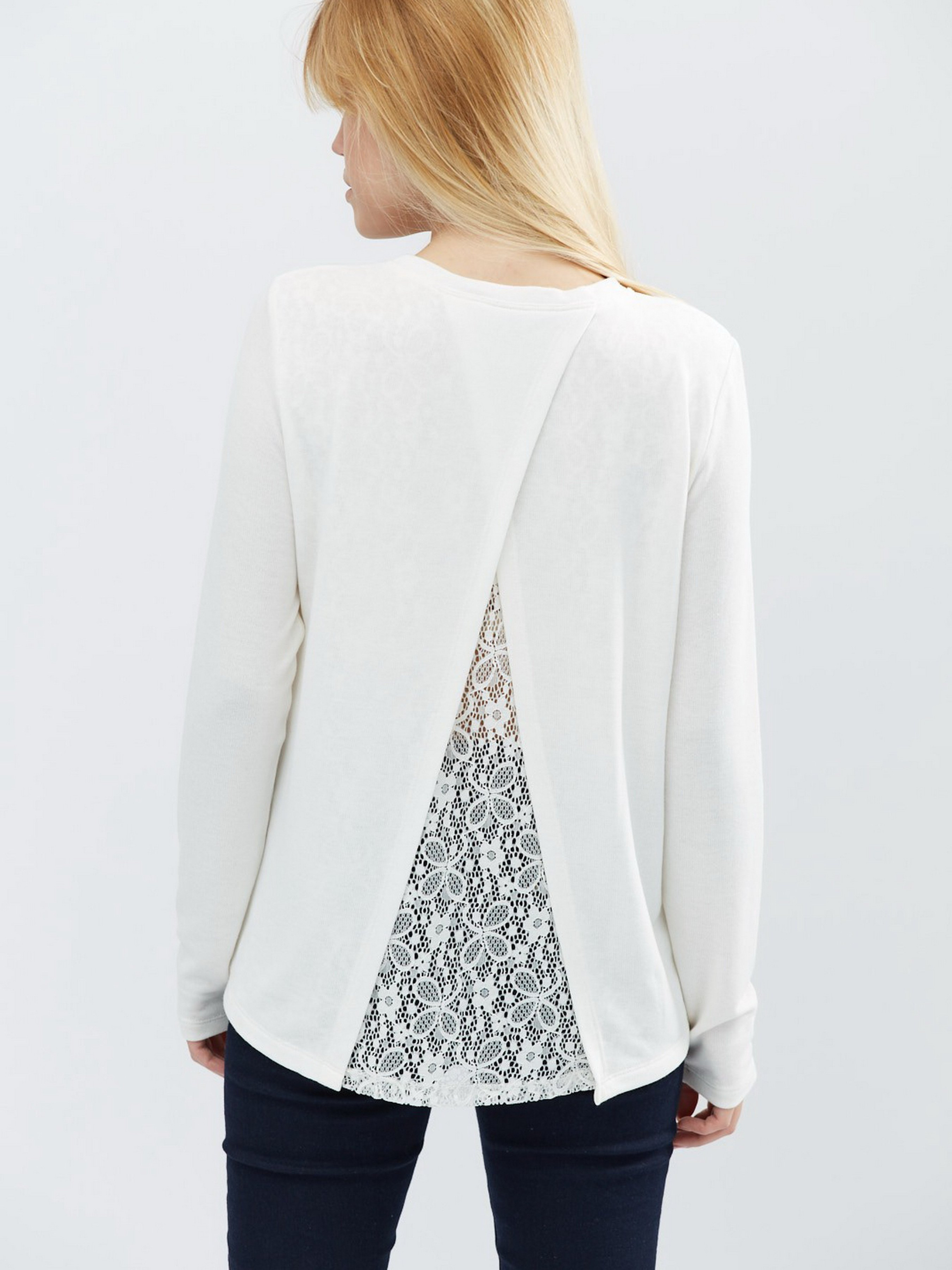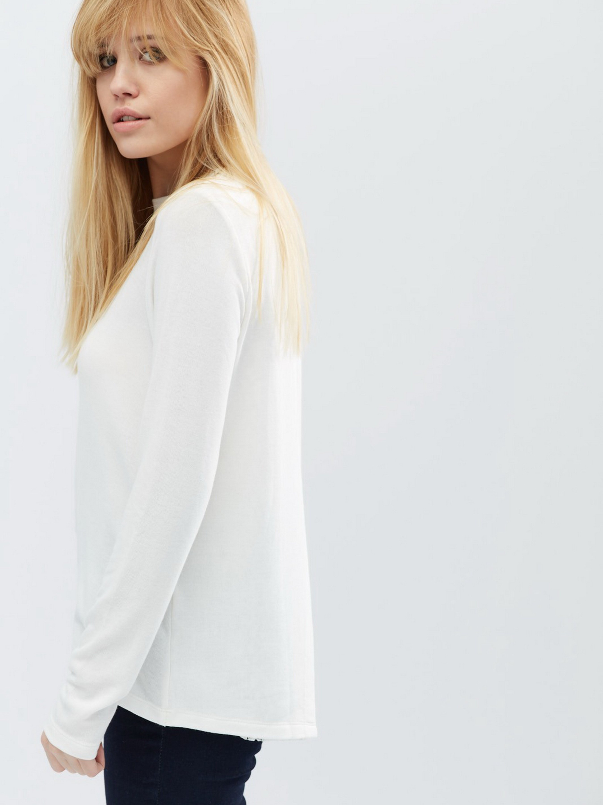 Стильний однотонний світшоти виконаний з м'якого, приємного до тіла матеріалу. Модель вільного крою. Округлий виріз. Ззаду виріб трохи довше, ніж спереду. На спинці розріз, доповнений вставкою з гіпюру.