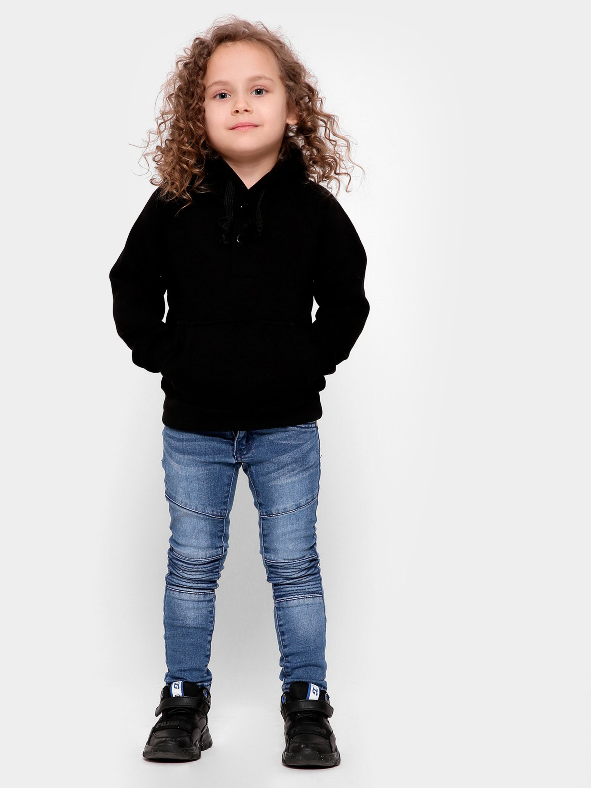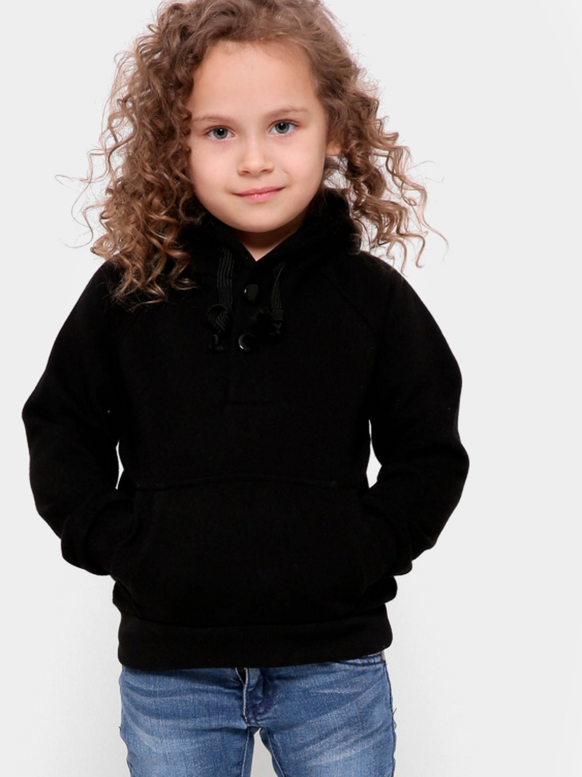 Дитячий худі без принта, колір чорний. Деталі: прямий силует з кишенею-кенгуру, застібкою на кнопки, довгим рукавом і капюшоном. За манжетам і нижньому краю - рельєфна трикотажна гумка.