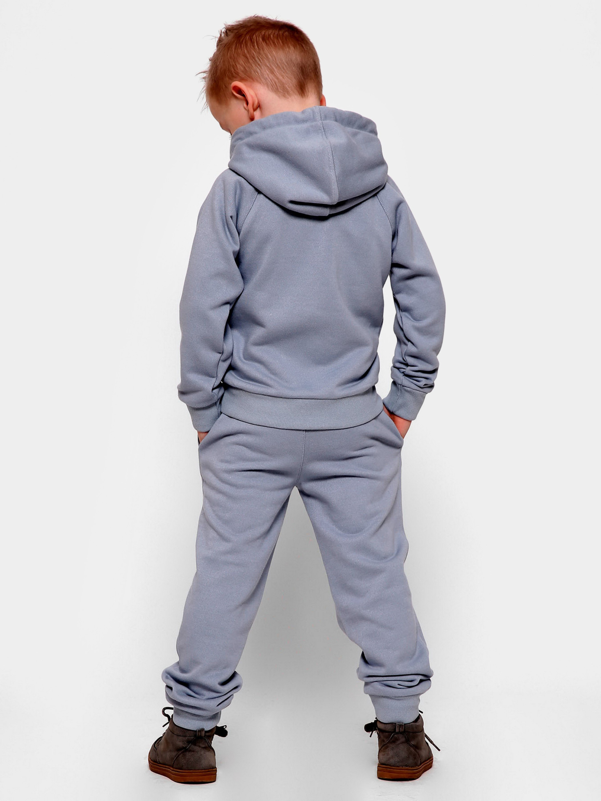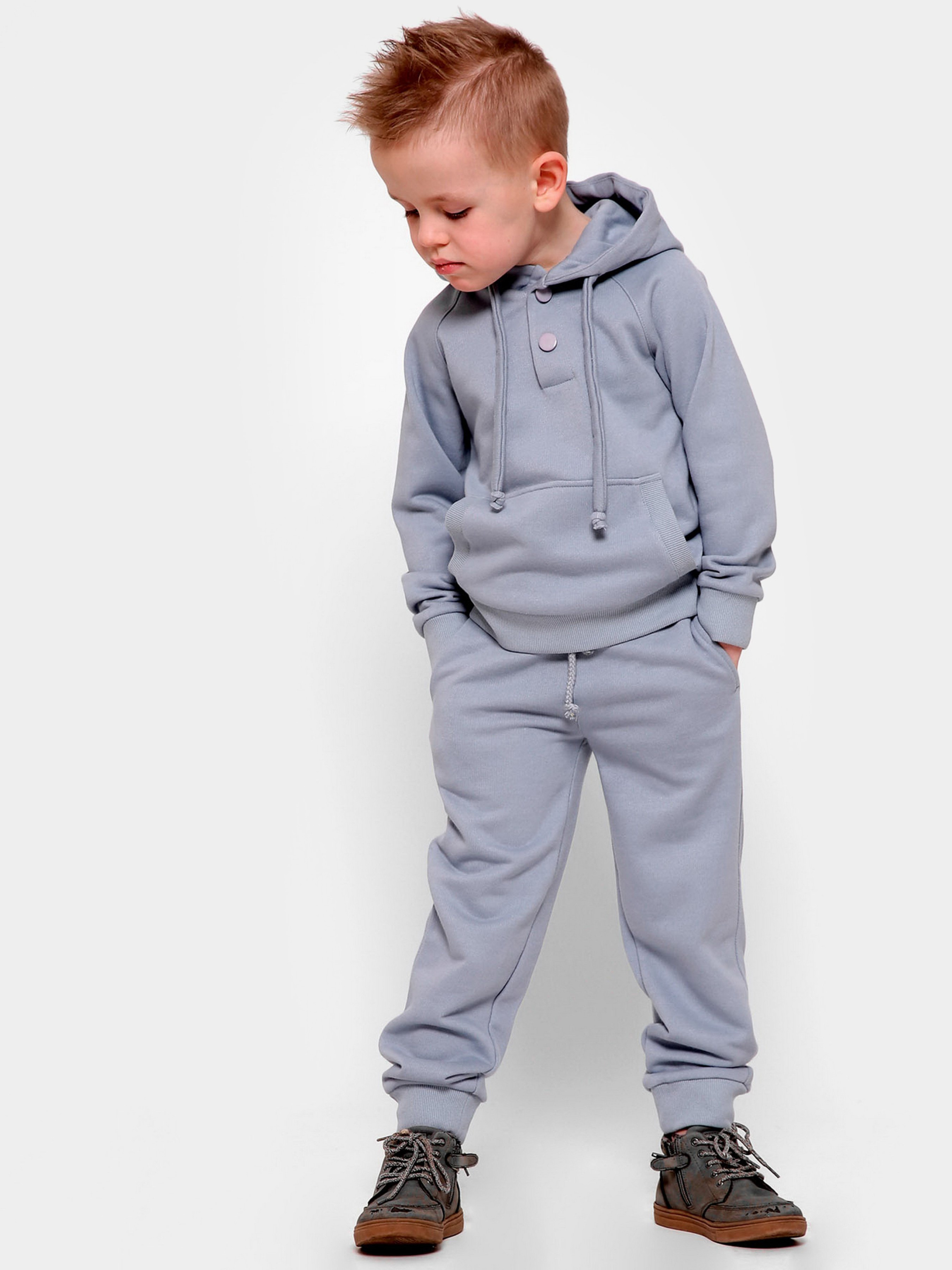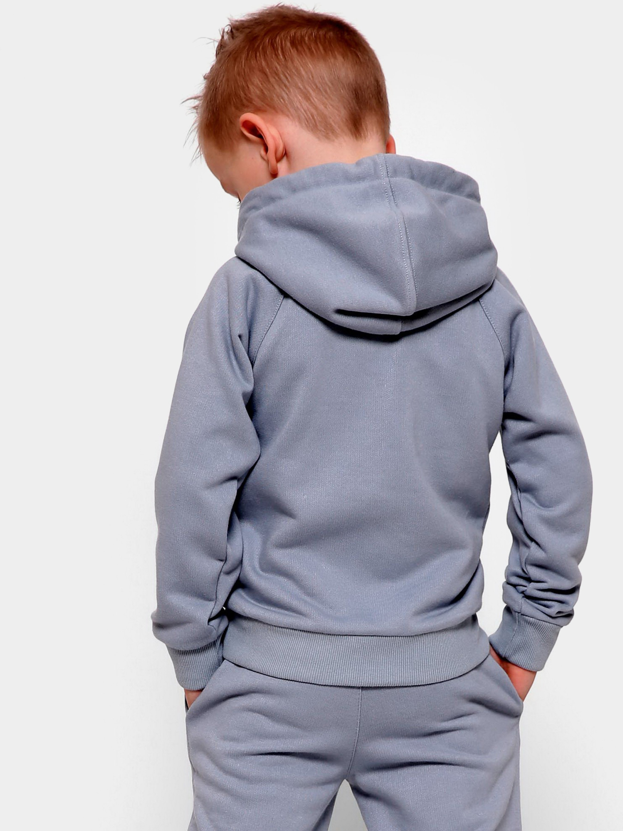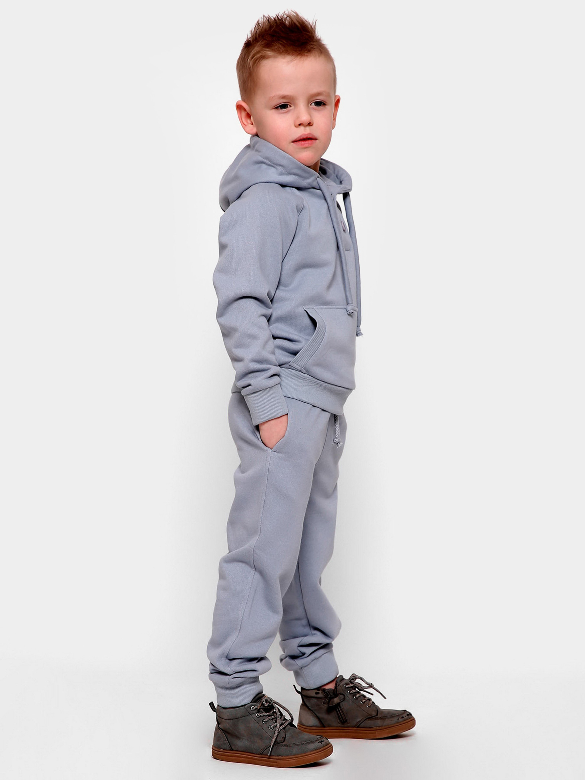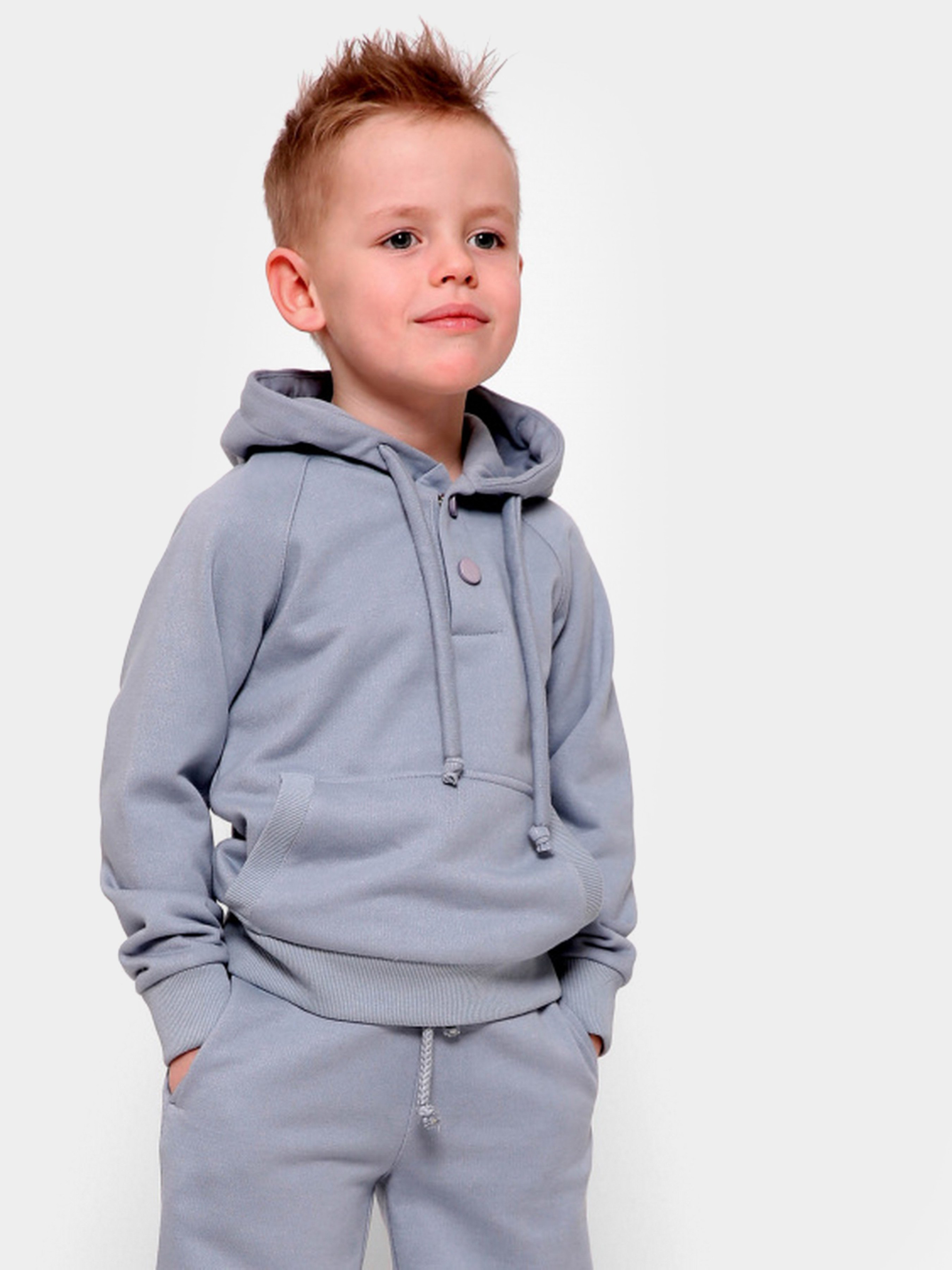 Дитячий худі без принта, колір сіро-блакитний. Деталі: прямий силует з кишенею-кенгуру, застібкою на кнопки, довгим рукавом і капюшоном. За манжетам і нижньому краю - рельєфна трикотажна гумка.
