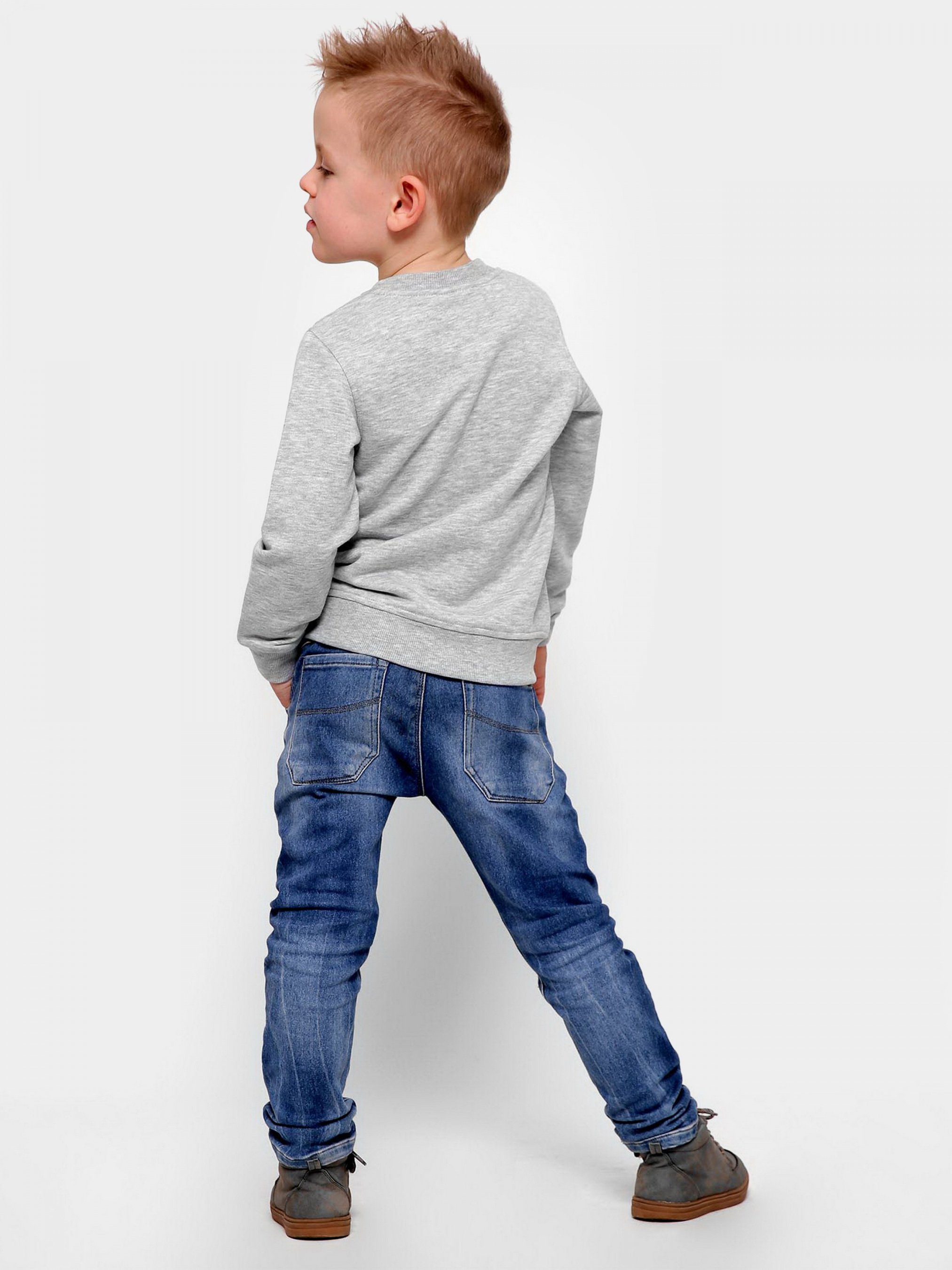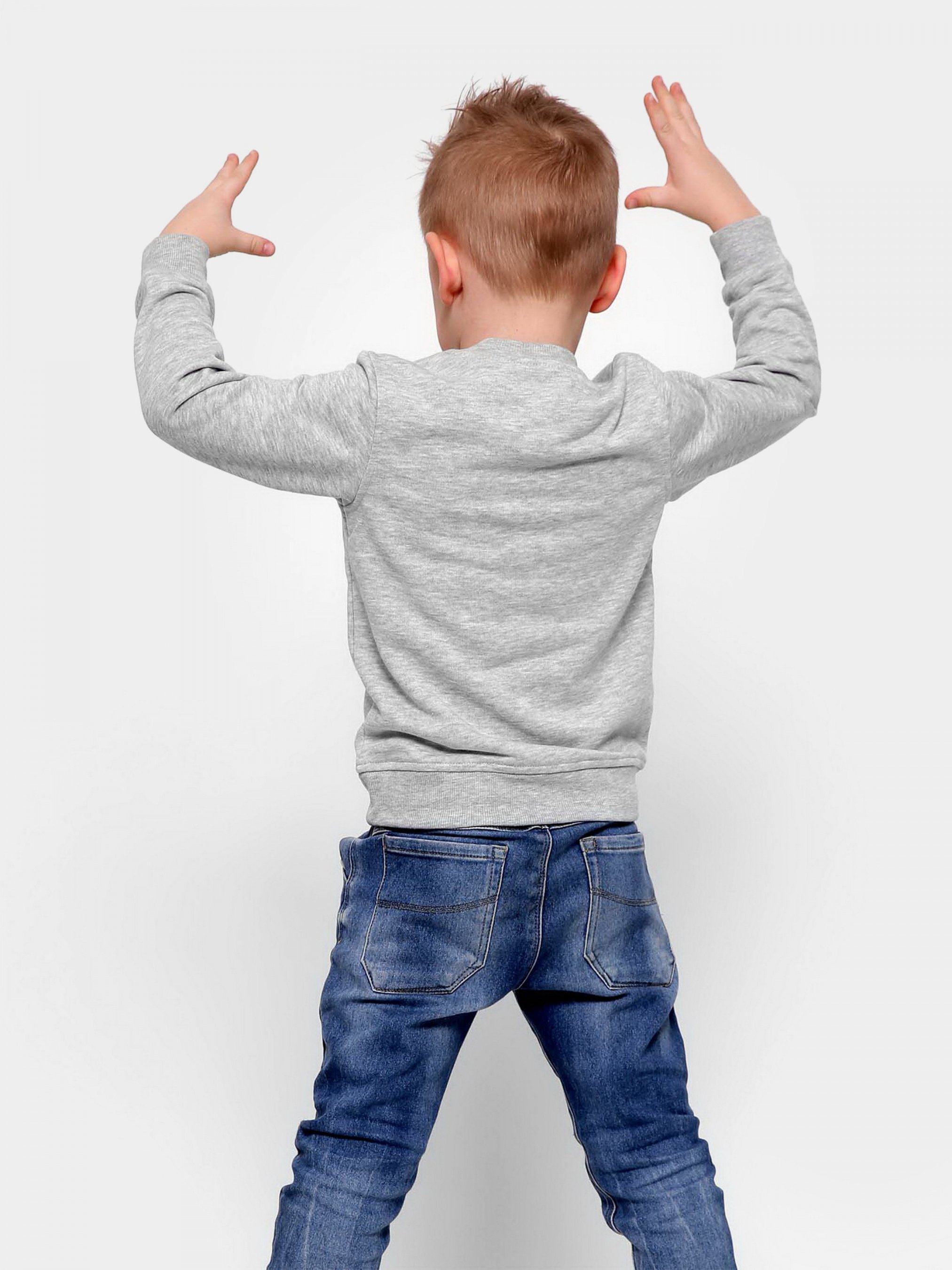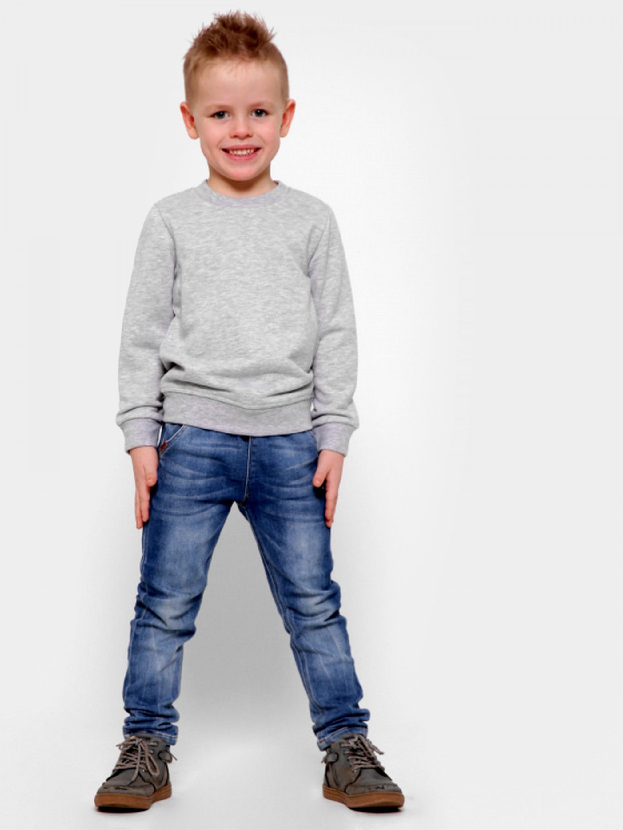 Дитячий світшоти без принта, колір сірий. Деталі: прямий фасон з круглим вирізом і довгим рукавом. За манжетам, вирізу і нижньому краю - рельєфна трикотажна гумка. Утеплений флисом.