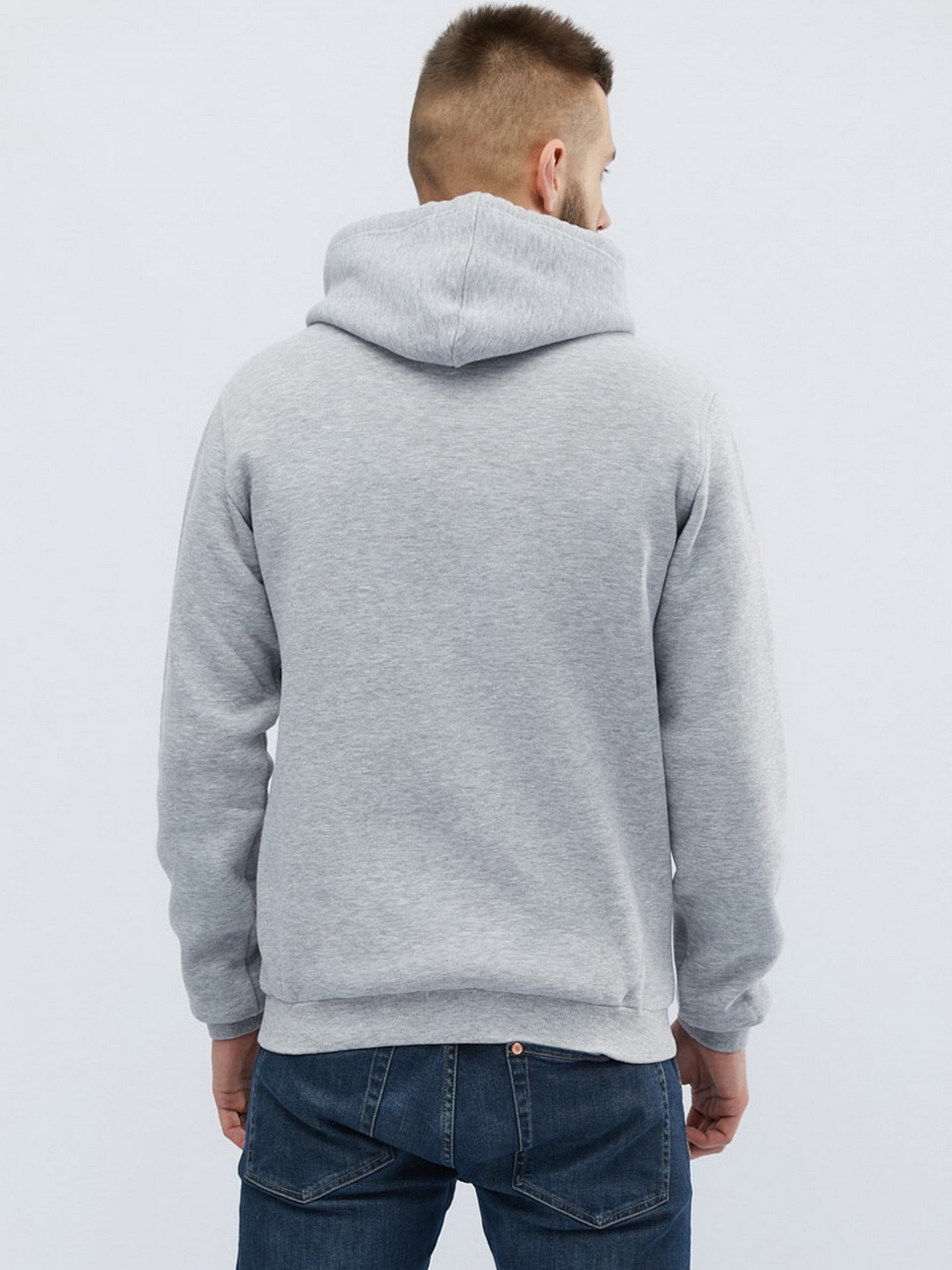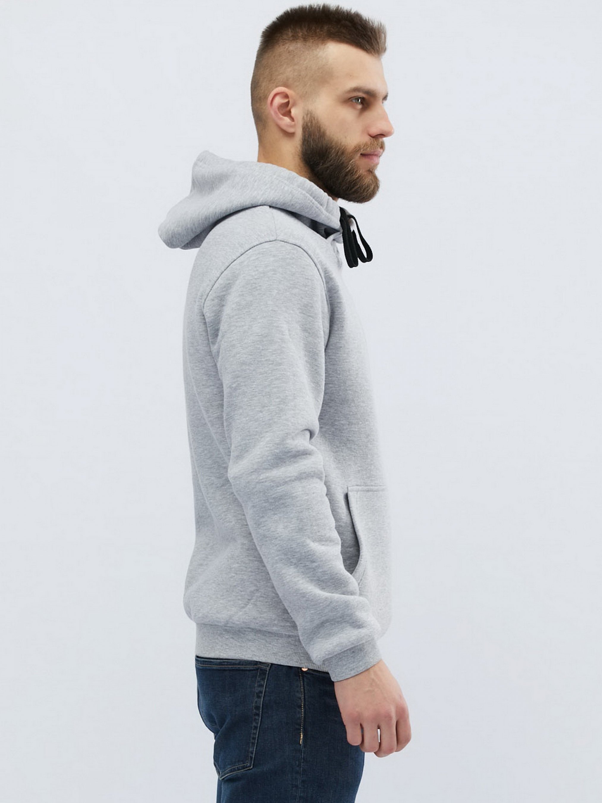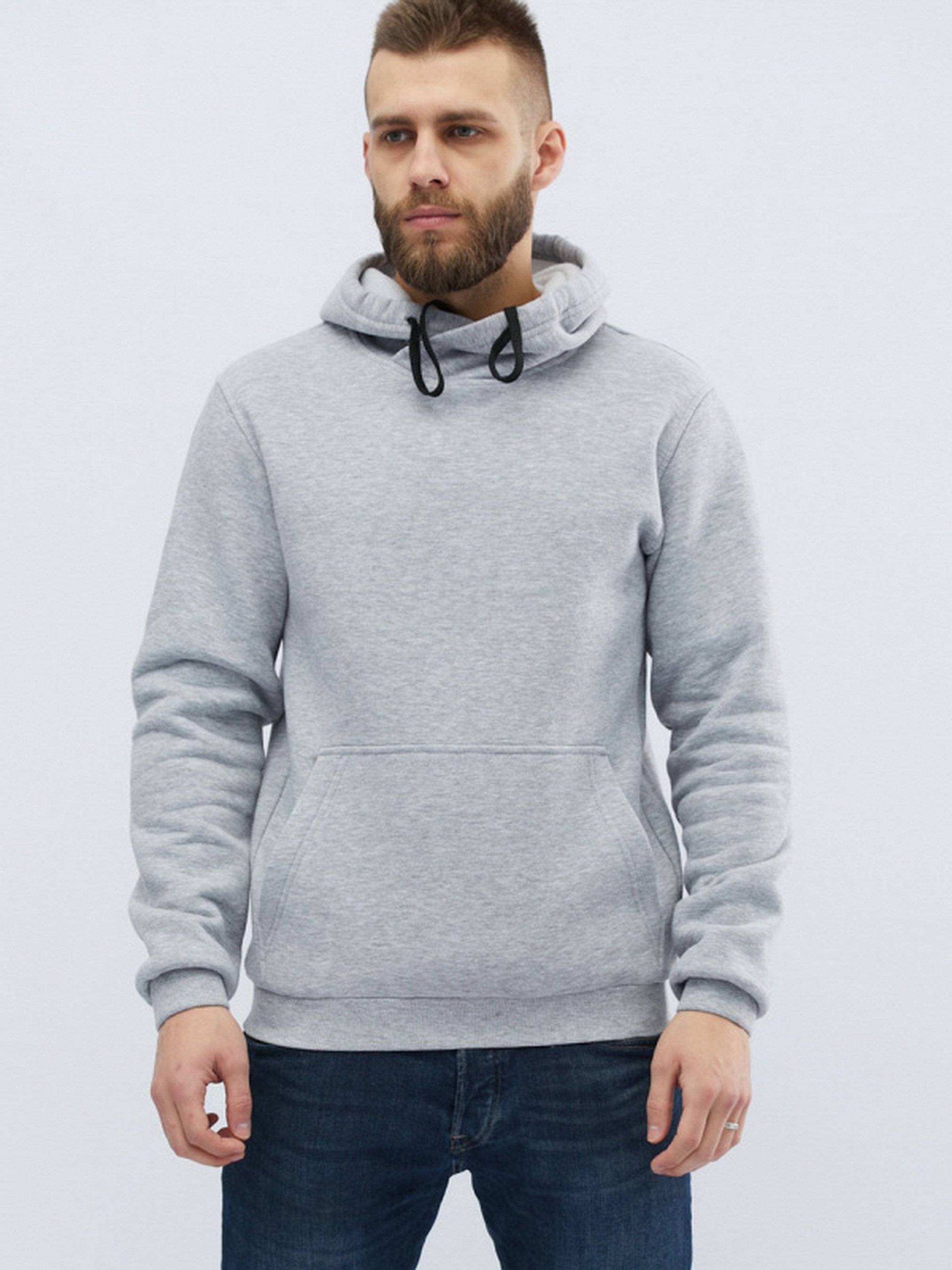 Чоловік худі без принта, колір сірий. Деталі: фасон класичного худі з кишенею-кенгуру, довгим рукавом і капюшоном. За манжетам і нижньому краю - рельєфна трикотажна гумка.