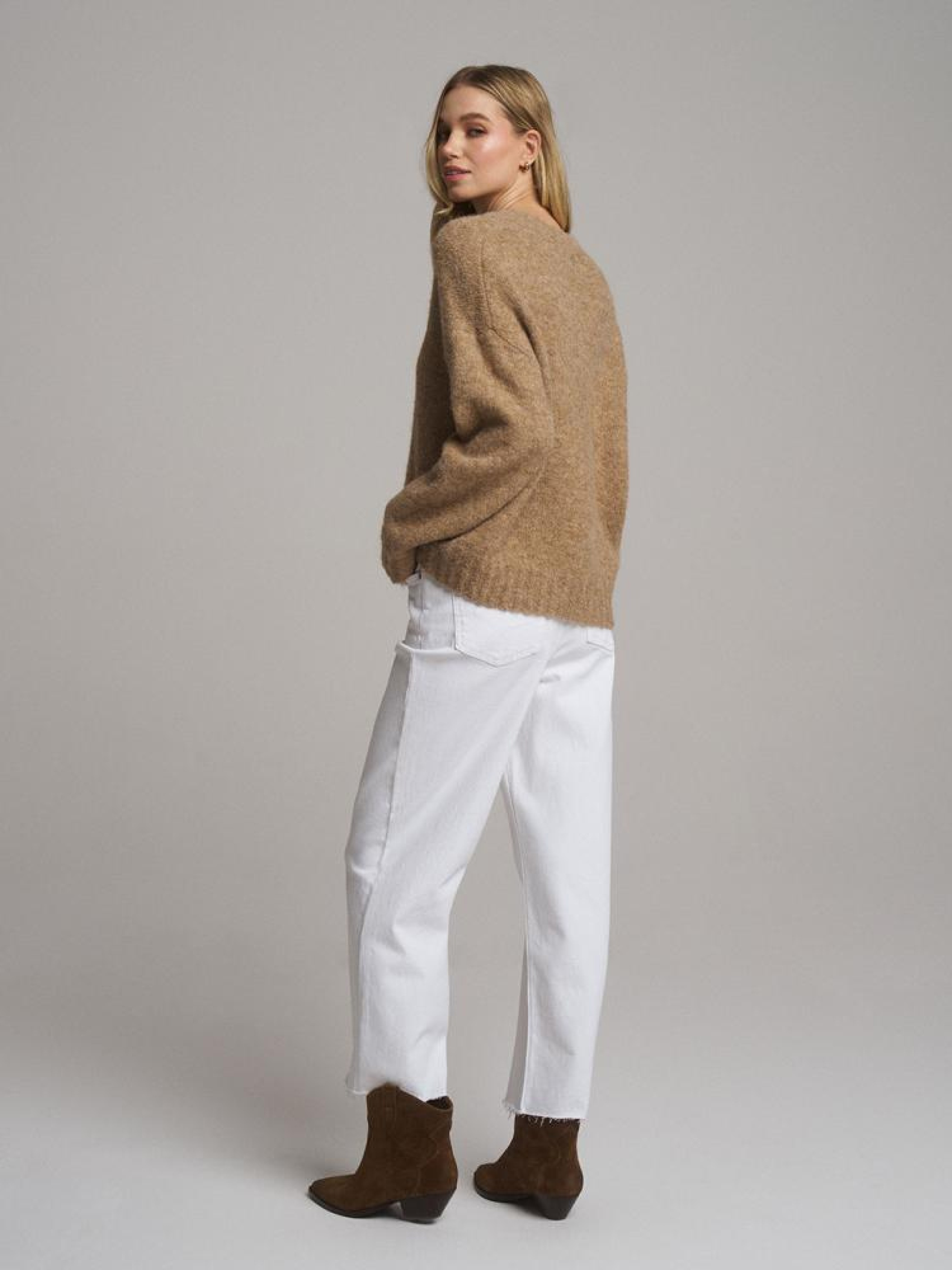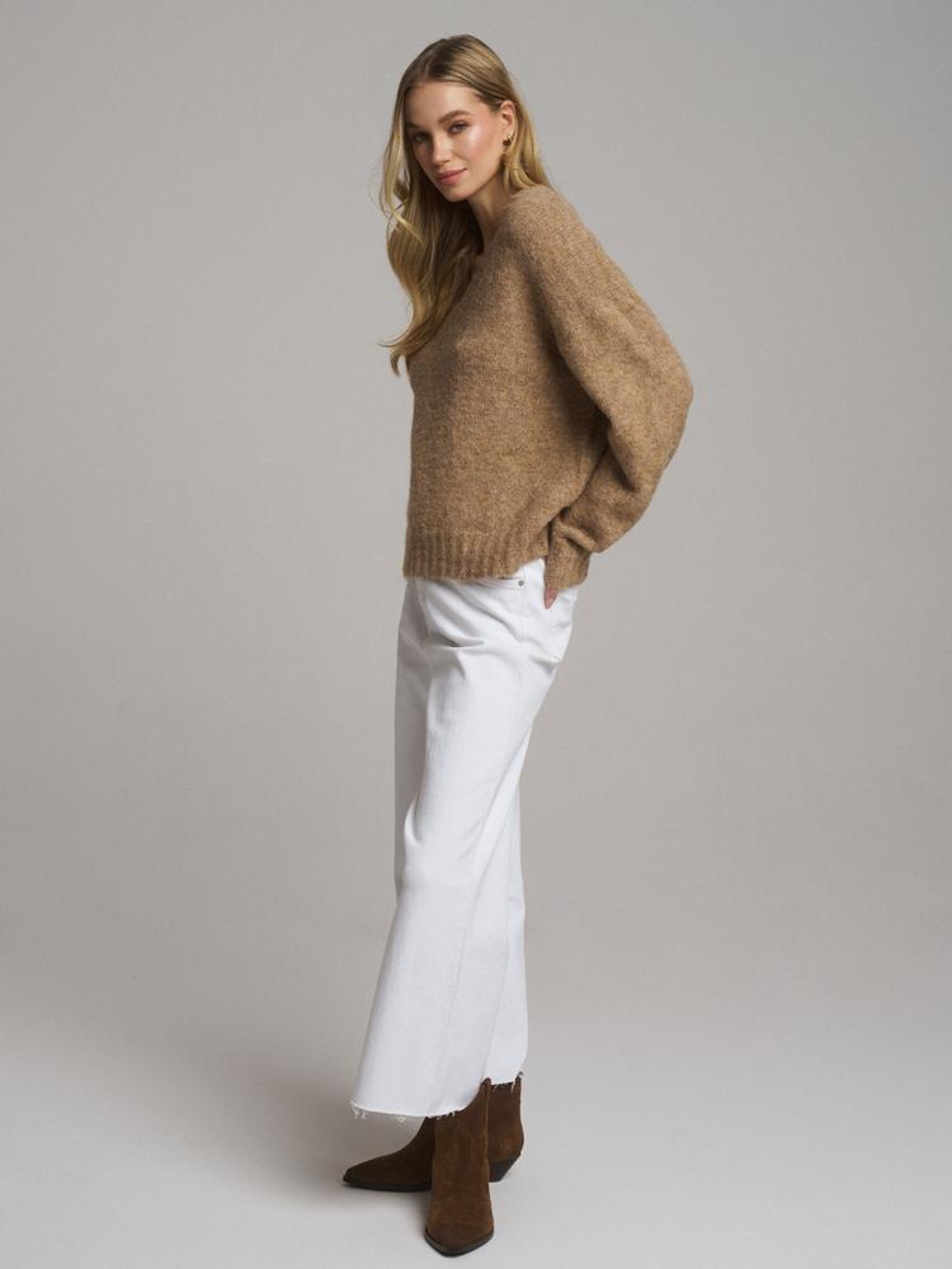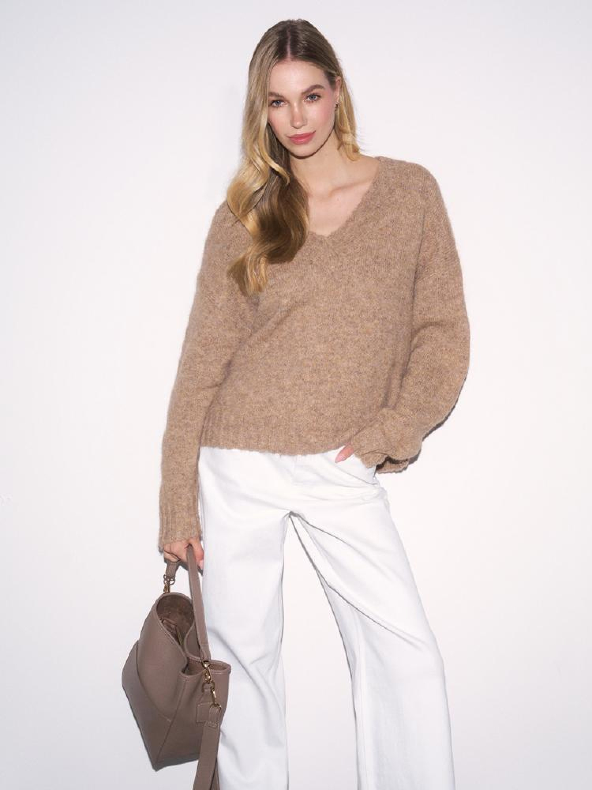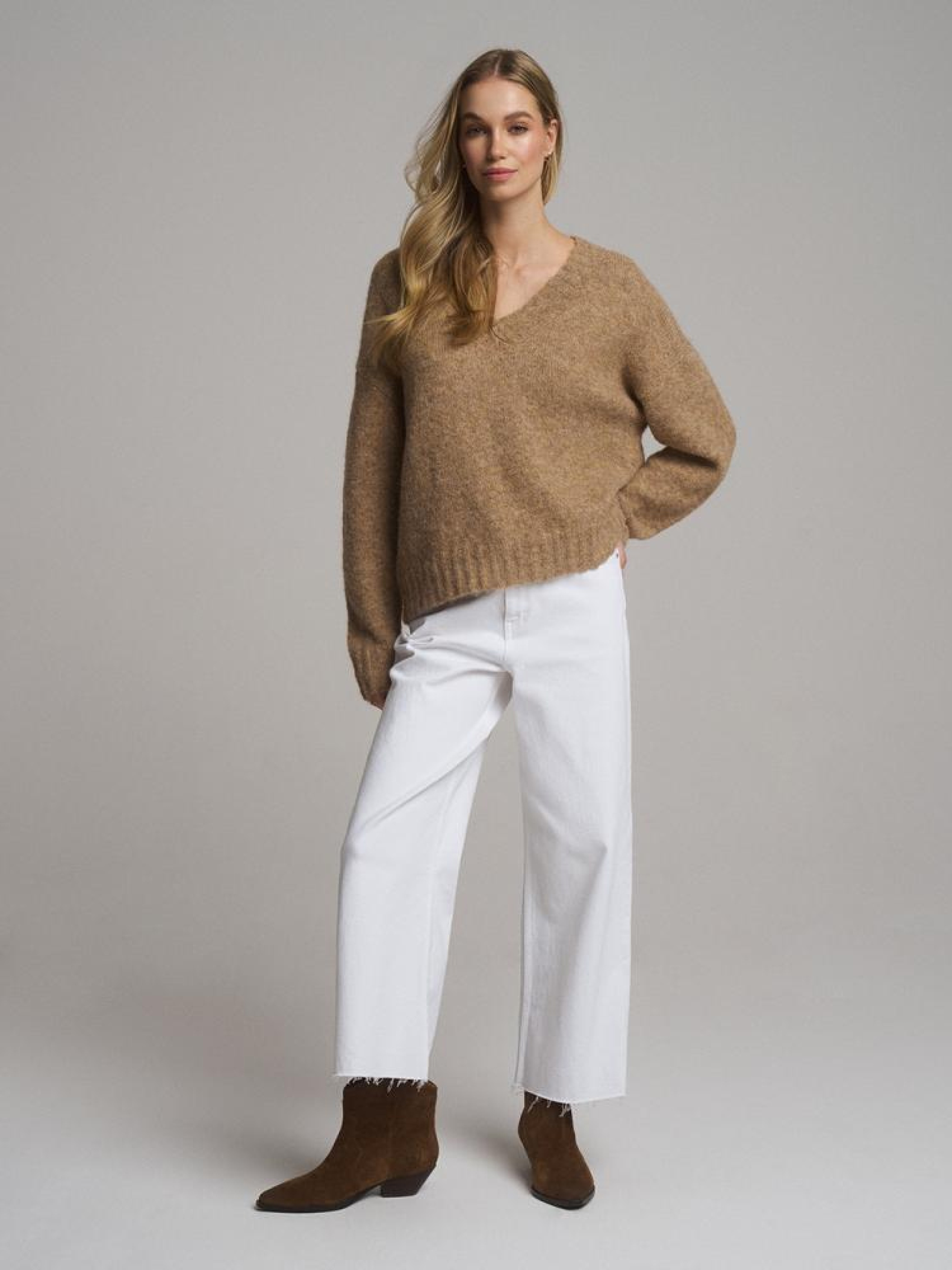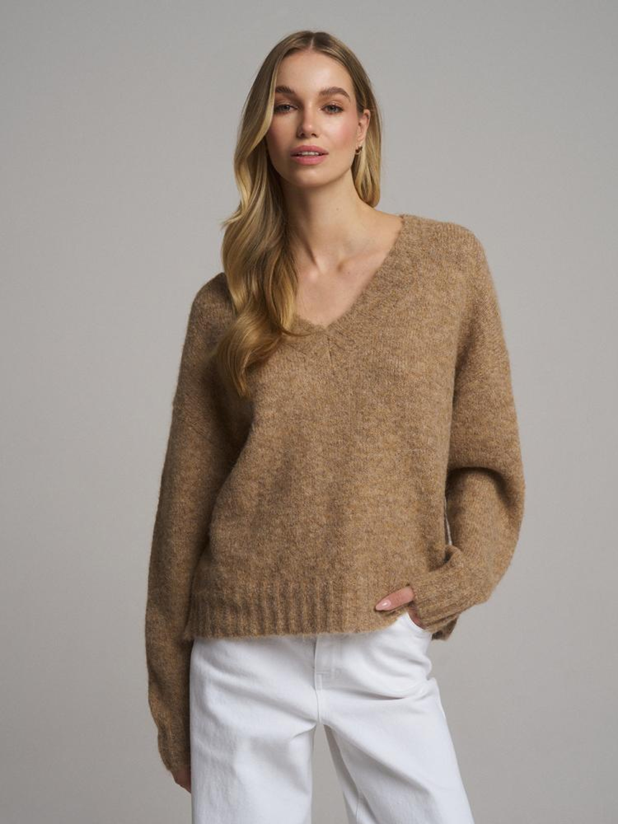 Светр UCLA 10046240 Жіночий светр з суміші вовни: - вільний крій, - з V-подібним вирізом, - з приємної і теплої светрової тканини, - в наявності бежевий колір. Сезон: Весна/Літо 2025 Склад: 70% поліестер 21% нейлон 8% вовна 1% еластан Догляд: - не відбілювати - не сушити в сушильній машині - прасувати максимум при темп. 110 °С - не проводити хімчистку - ручне прання Розмір на моделі - S Зріст моделі - 177 см РОЗМІР: XS, S, М, L. Довжина по середині спинки: 59,00 см, 61,00 см, 63,00 см, 65,00 см, ШИРИНА НИЗУ: 50,50 см, 52,50 см, 54,50 см, 56,50 см, Ширина під пахвами: 58,00 см, 60,00 см, 62,00 см, 64,00 см, Довжина рукава: 50,00 см, 51,00 см, 52,00 см, 53,00 см,
