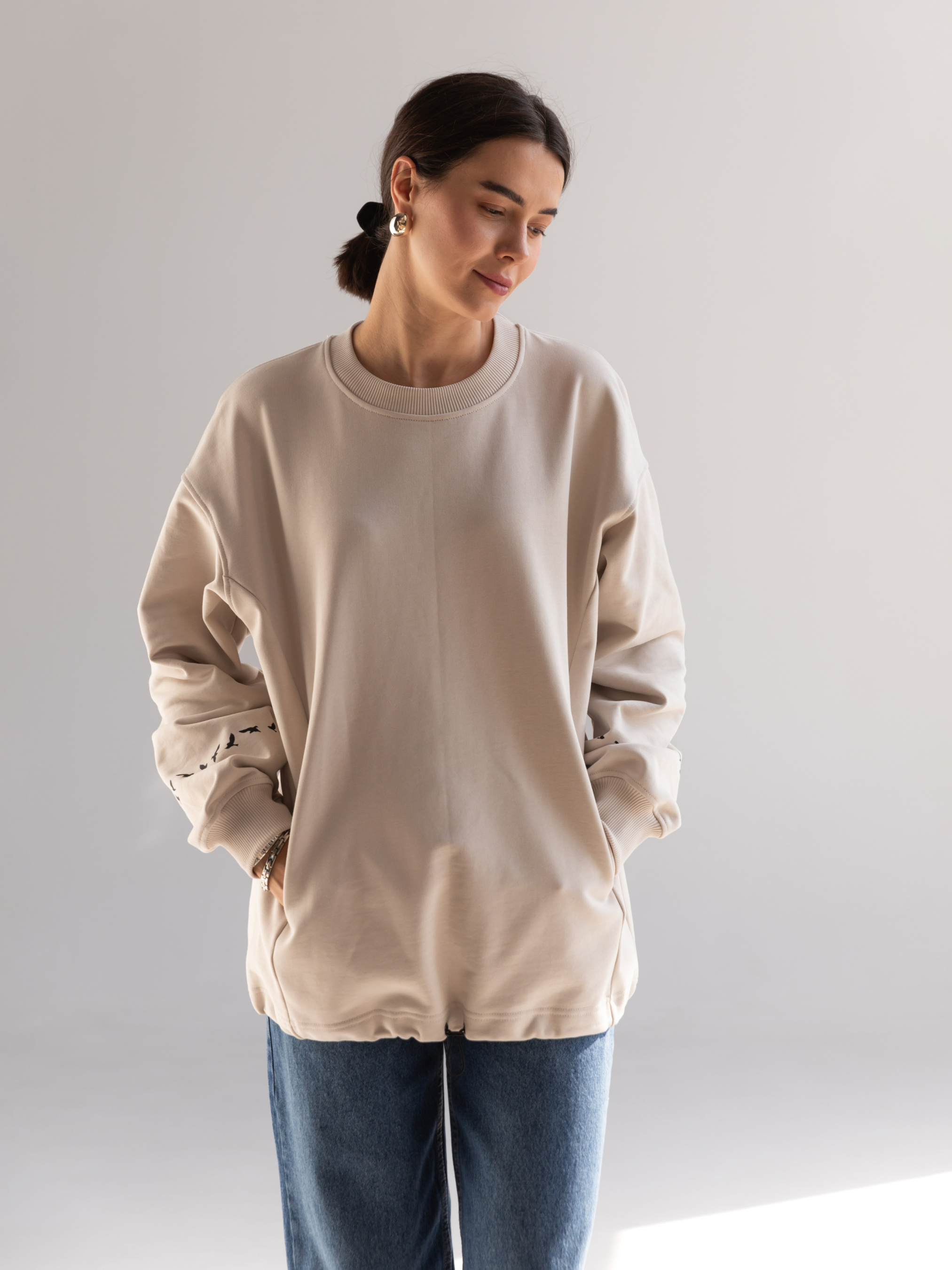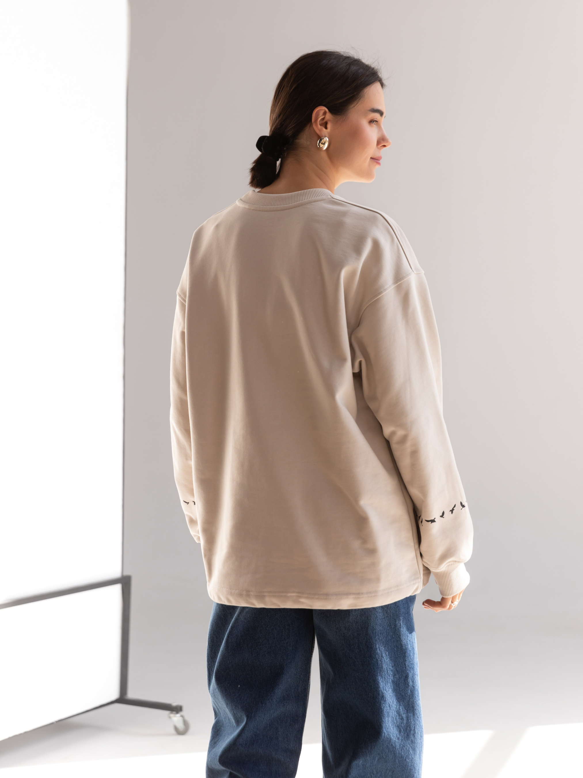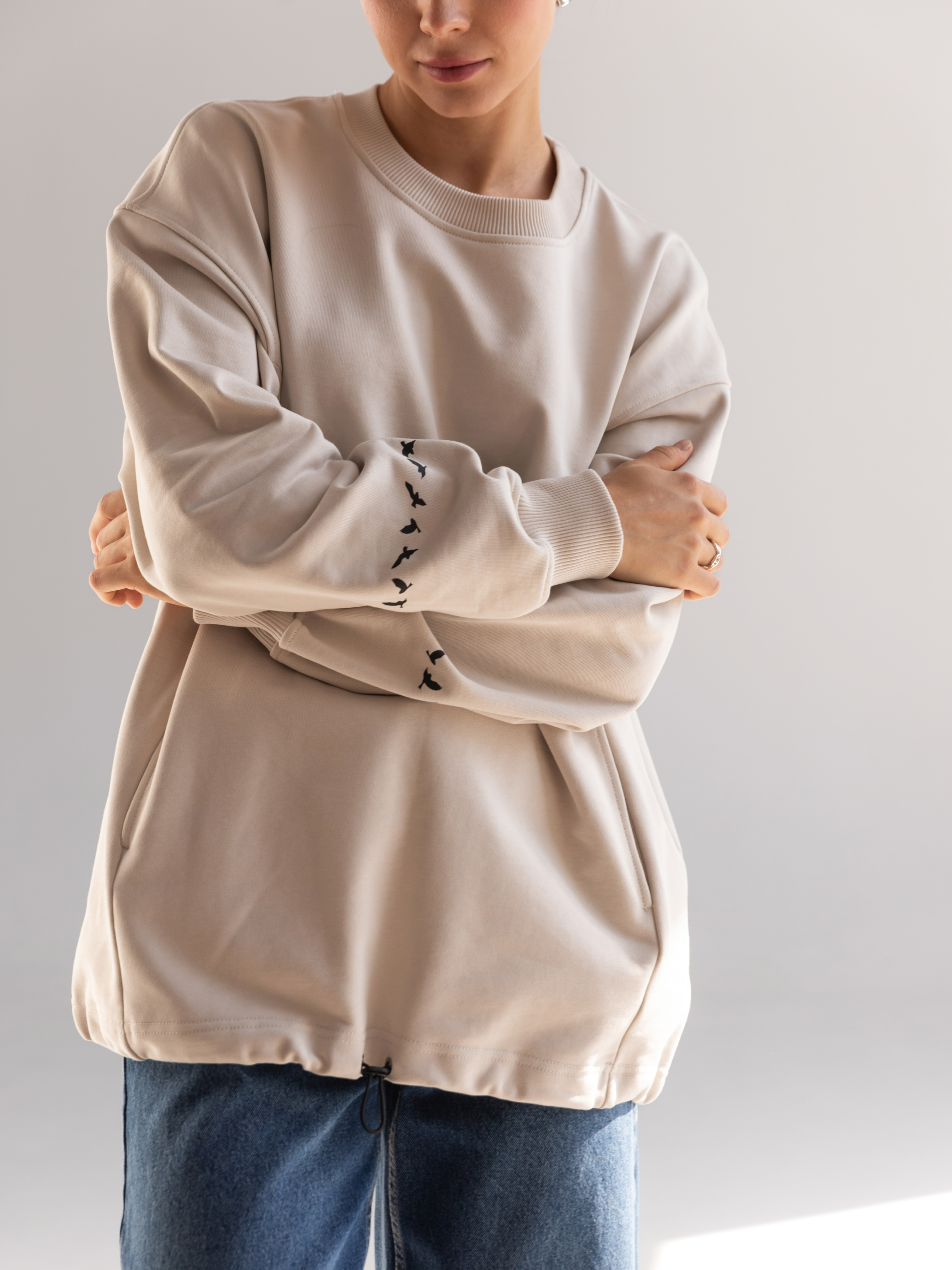 Світшот жіночий підкреслить вашу красу та подарує особливий комфорт при носінні. Щільний трикотаж зігріє у прохолоду і буде приємним до шкіри. Це універсальний одяг, який відповідає модним тенденціям. Вільний прямий крій, спущена лінія плеча відмінно підійде любителям стилю oversize. Широка стійка по горловині. Кишеня "кенгуру" у рельєфних швах. Низ рукава на еластичній манжеті. По низу виробу шнур-гумка з фіксатором, який додасть вам більшого комфорту, якщо потрібно захиститися від вітру. Рукав світшота прикрашає стильний принт «пташки». Матеріал: трикотажне полотно футер тринитка без начосу Склад: 100% бавовна Зріст моделі: 175 Параметри моделі: 82-63-92 Розмір виробу на моделі: onesize Заміри виробу Ширина по грудях – 64 см; Ширина плеча + довжина рукава - 78,5 см Довжина виробу по переду - 76 см