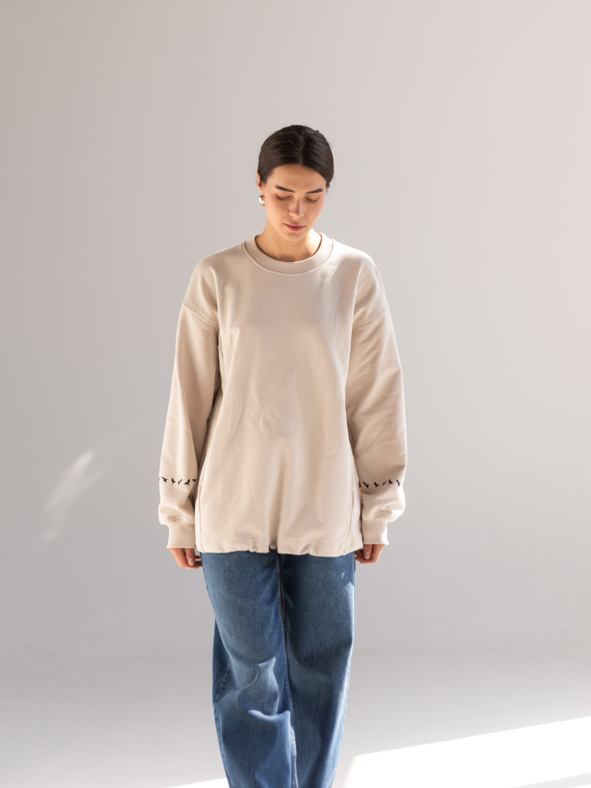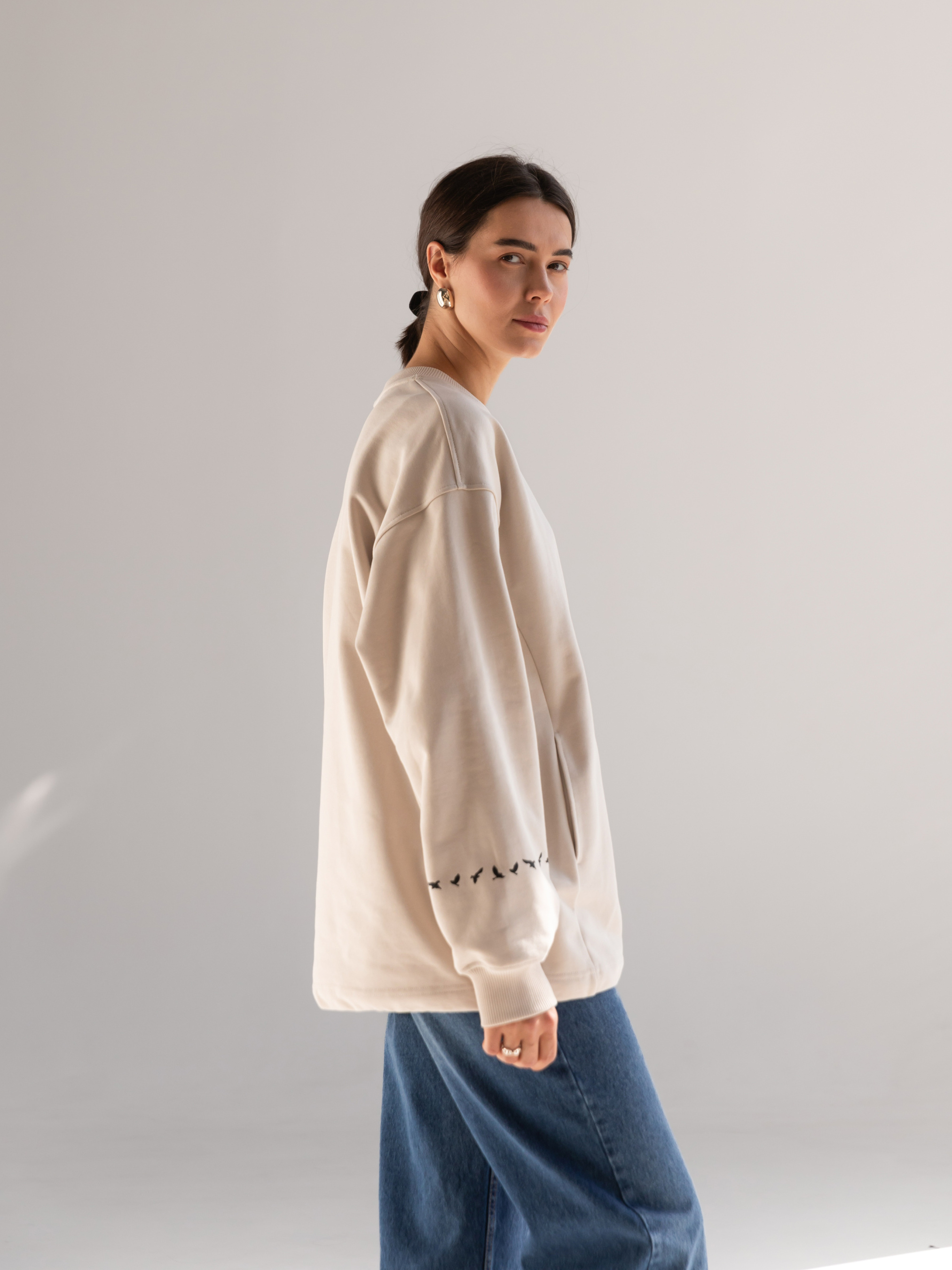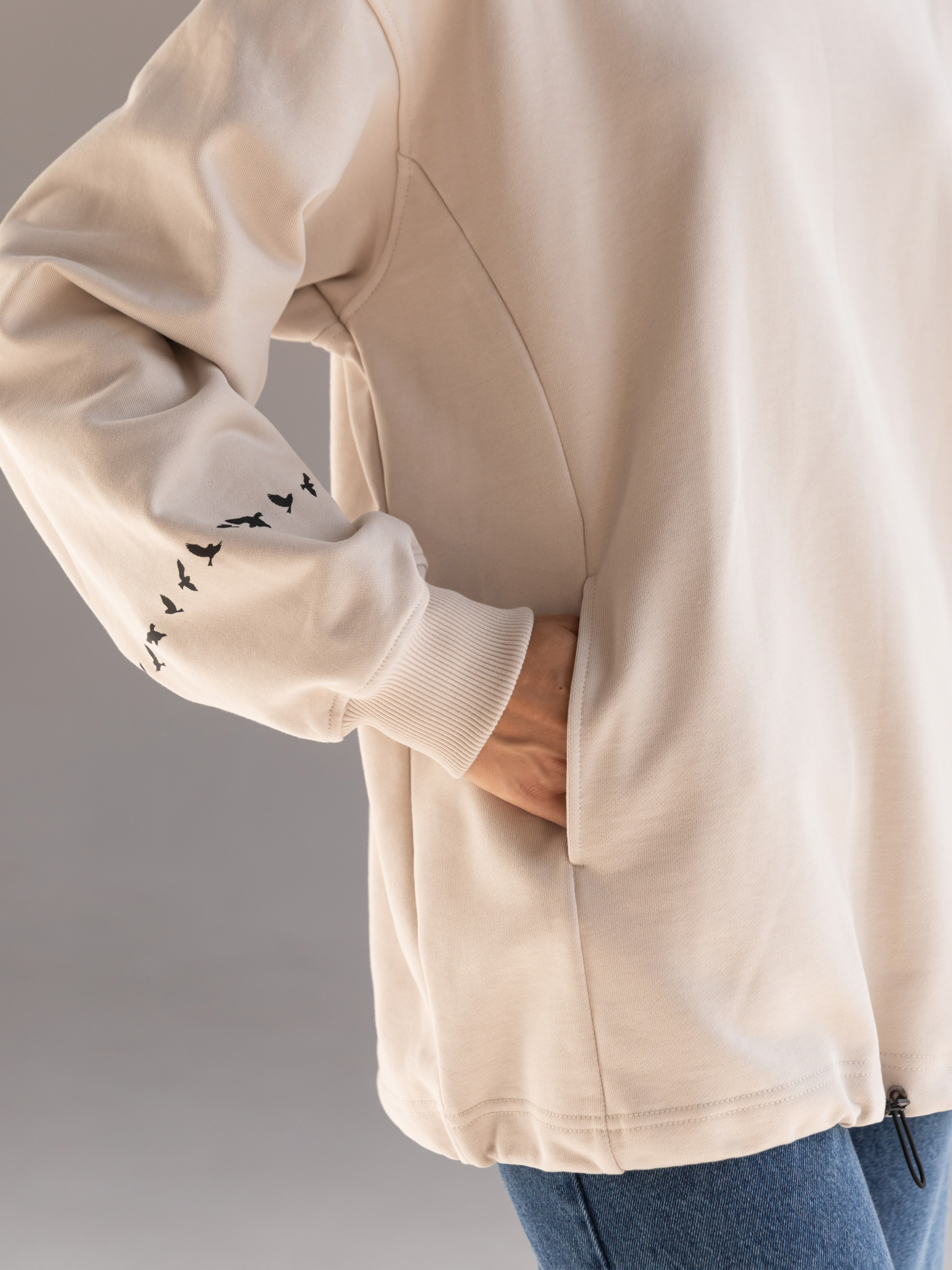 Світшот жіночий підкреслить вашу красу та подарує особливий комфорт при носінні. Щільний трикотаж зігріє у прохолоду і буде приємним до шкіри. Це універсальний одяг, який відповідає модним тенденціям. Вільний прямий крій, спущена лінія плеча відмінно підійде любителям стилю oversize. Широка стійка по горловині. Кишеня "кенгуру" у рельєфних швах. Низ рукава на еластичній манжеті. По низу виробу шнур-гумка з фіксатором, який додасть вам більшого комфорту, якщо потрібно захиститися від вітру. Рукав світшота прикрашає стильний принт «пташки». Матеріал: трикотажне полотно футер тринитка без начосу Склад: 100% бавовна Зріст моделі: 175 Параметри моделі: 82-63-92 Розмір виробу на моделі: onesize Заміри виробу Ширина по грудях – 64 см; Ширина плеча + довжина рукава - 78,5 см Довжина виробу по переду - 76 см