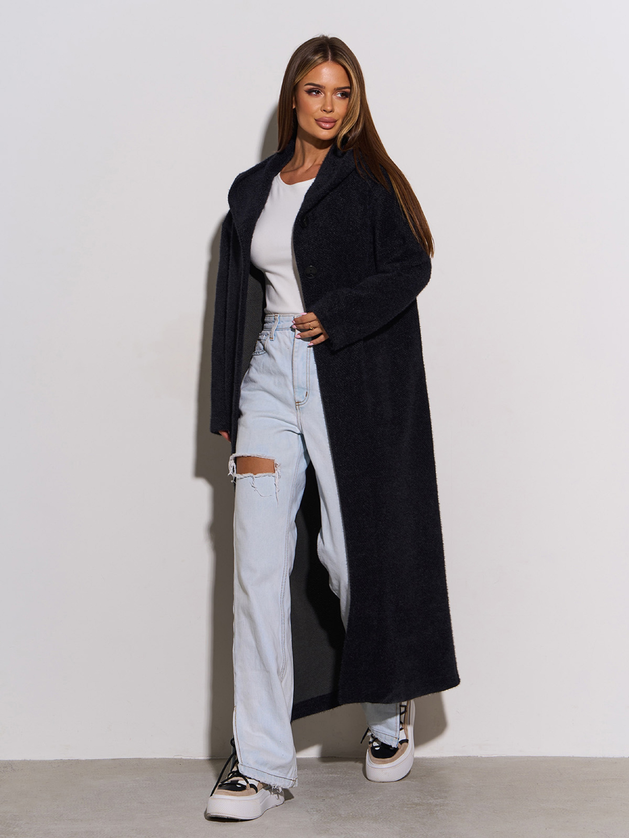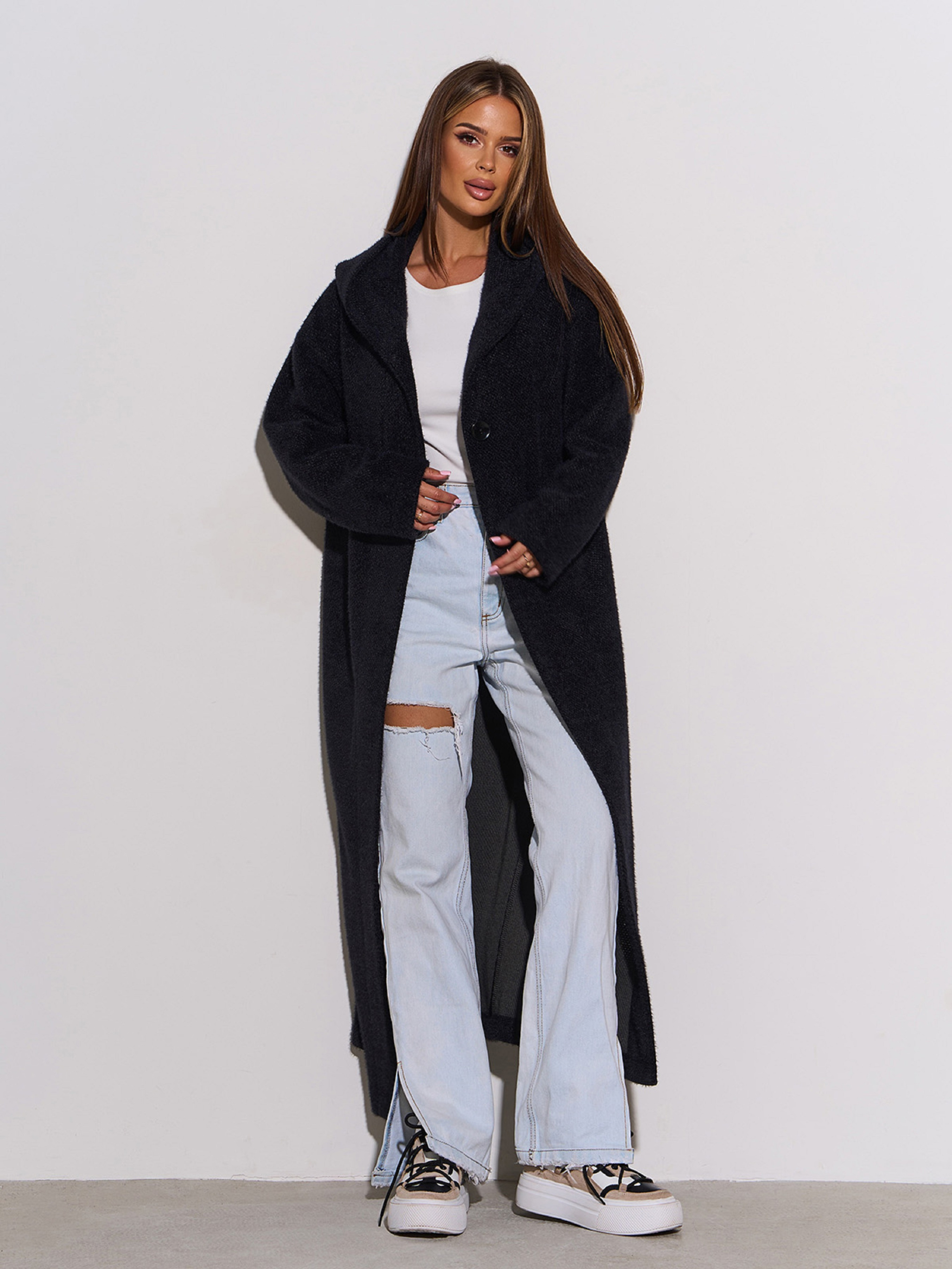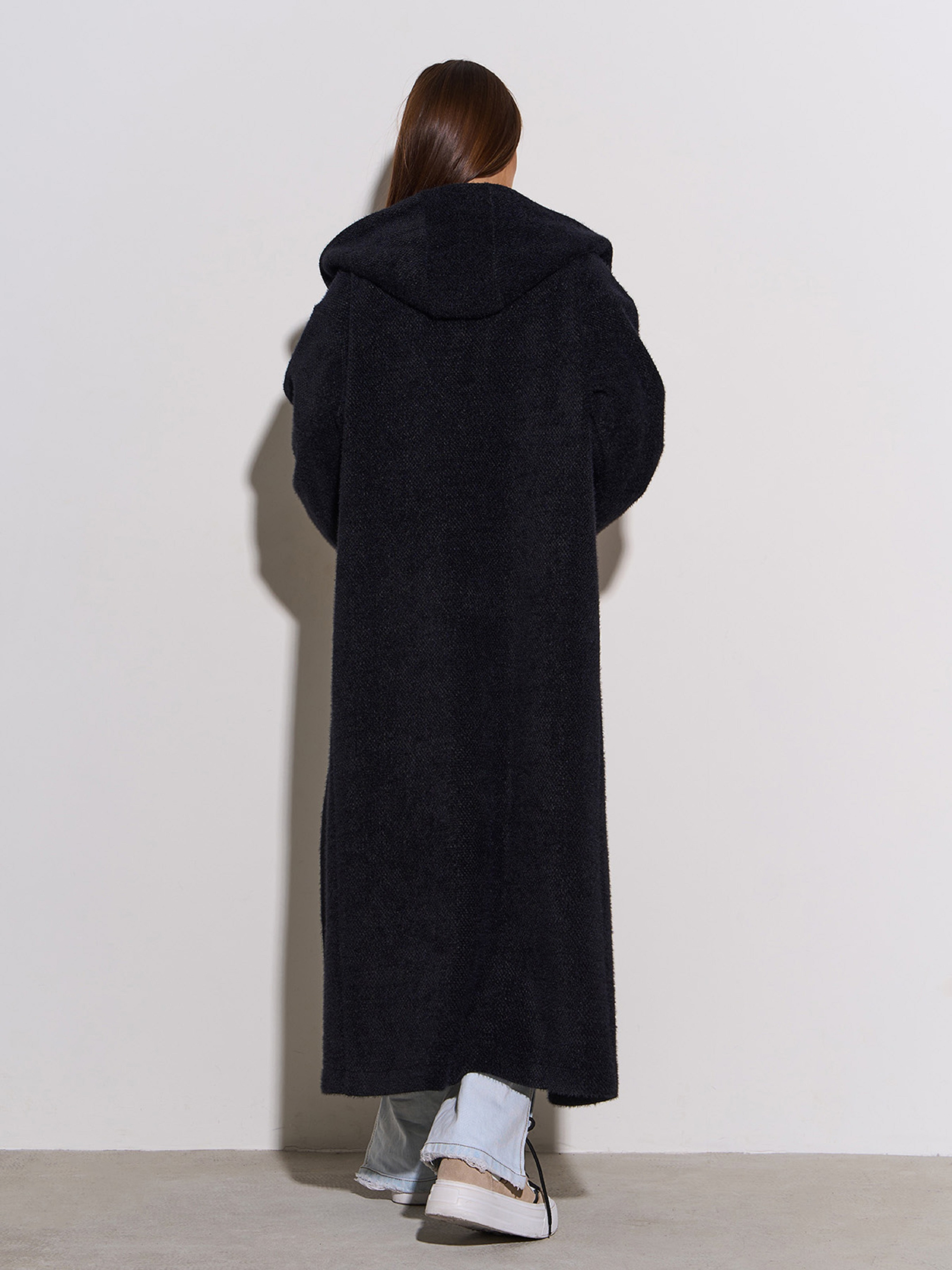 Чорний пальто-кардиган прямого вільного крою з капюшоном. Модель на двох верхніх гудзиках із довгими рукавами. Напівобхват: Груди: S (54), M (56), L (58), XL (60), XXL (62), 3XL (64), Талія: S (53), M (55), L (57), XL (59), XXL (61), 3XL (63), Стегна: S (53), M (55), L (57), XL (59), XXL (61), 3XL (63), Довжина виробу — 124, Рукав — 60, Тканина: Середньої еластичності.
