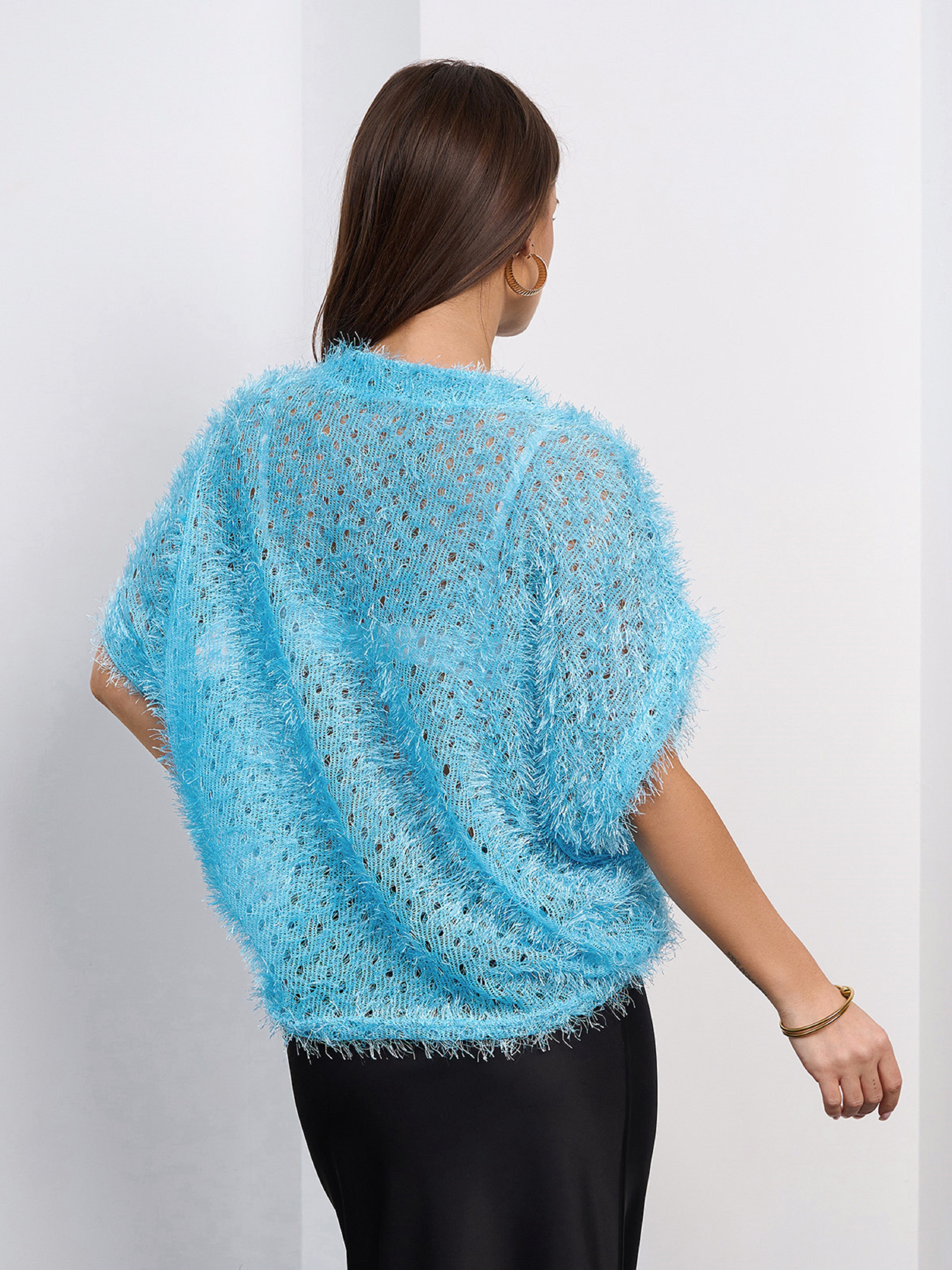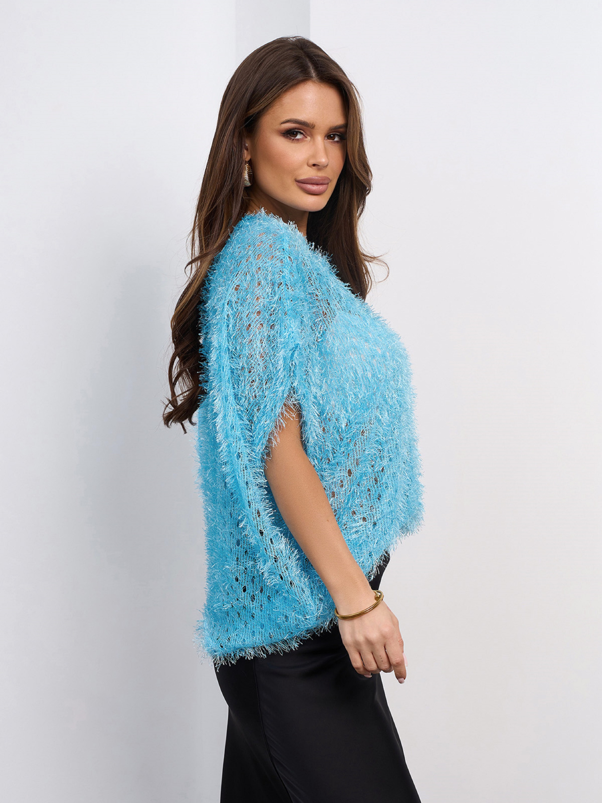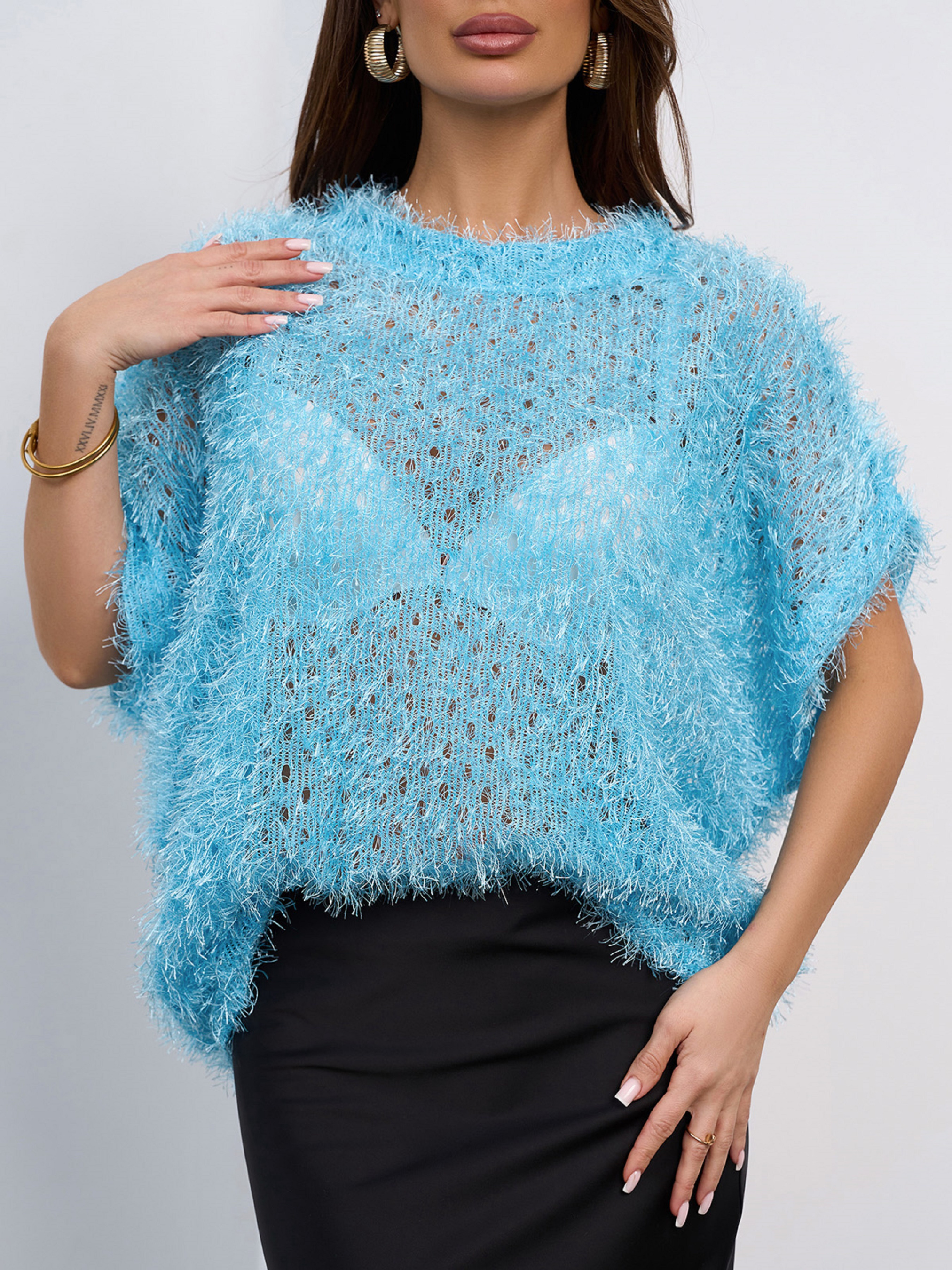 Напівпрозорий светр з блакитного трикотажу-травки з люрексом і перфорацією. Светр вільного крою з короткими цільнокроєними рукавами та напівкруглою горловиною. Напівобхват: Груди: S(66), M(68), L(70), XL(72), Довжина виробу - 59-63*, Рукав - 14, Тканина: Висока еластичність.