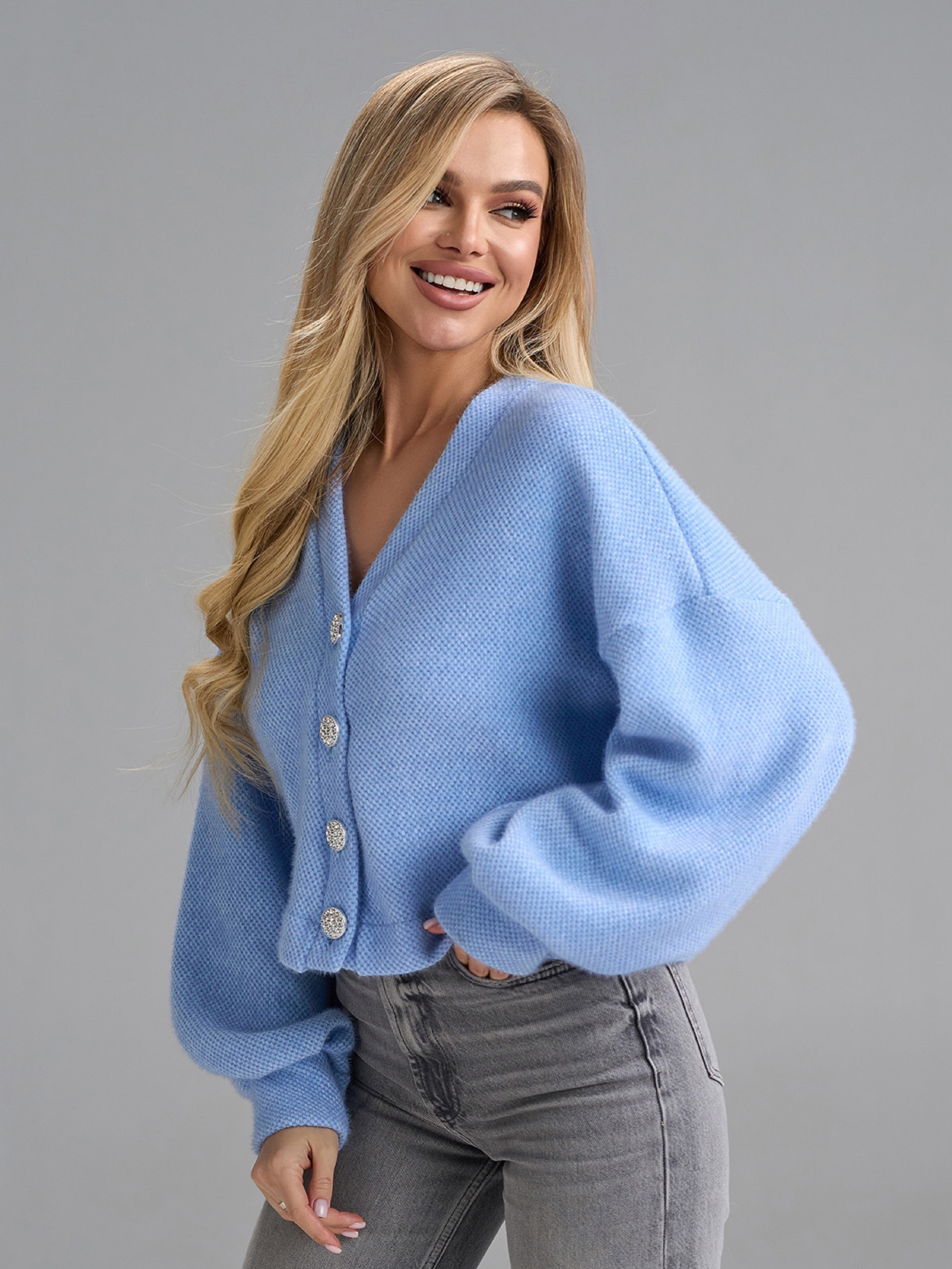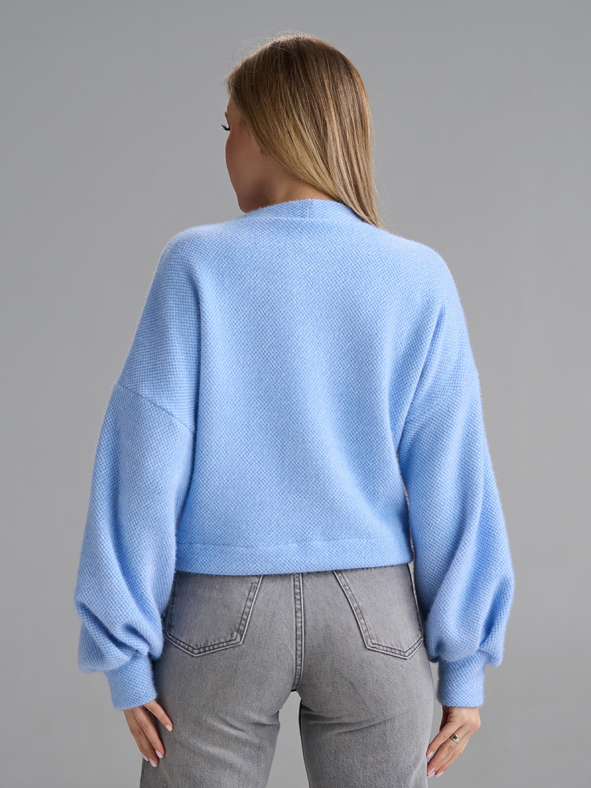 Молодежный оверсайз кардиган из альпаки (эко) голубого цвета. Кардиган на пуговицах с V-образной горловиной и длинными рукавами-фонариками на манжетах. Модель укороченного свободного кроя. Полуобхват: Грудь: S (55), M (57), L (59), XL (61), Длина изделия - 48, Рукав - 57, Ткань: Низкой эластичности.