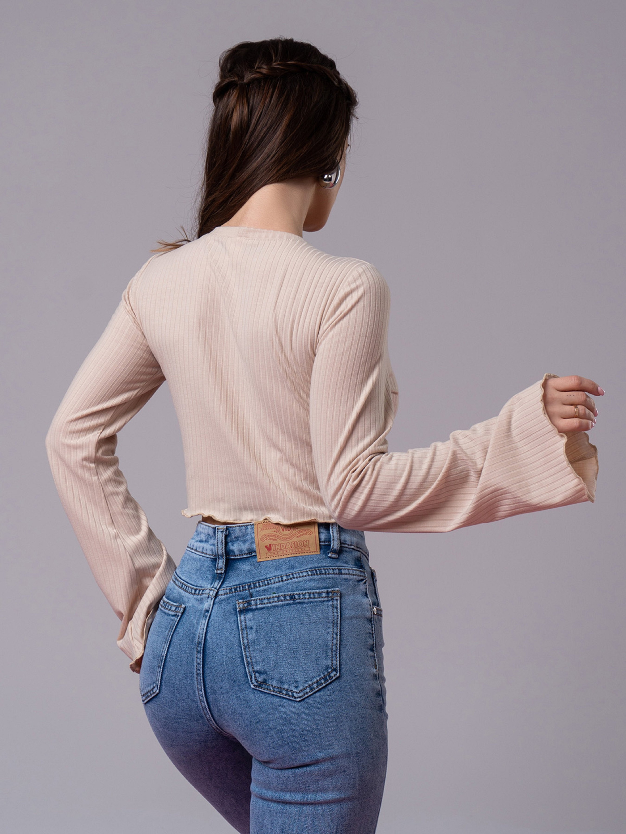 Молодіжний бежевий лонгслів в рубчик з вкороченим кроєм, що облягає. Модель із закритою О-подібною горловиною та довгими розкльошеними рукавами. Напівобхват: Груди: S(42), M(44), L(46), XL(48), Довжина виробу - 41, Рукав - 63, Тканина: Середньої еластичності.